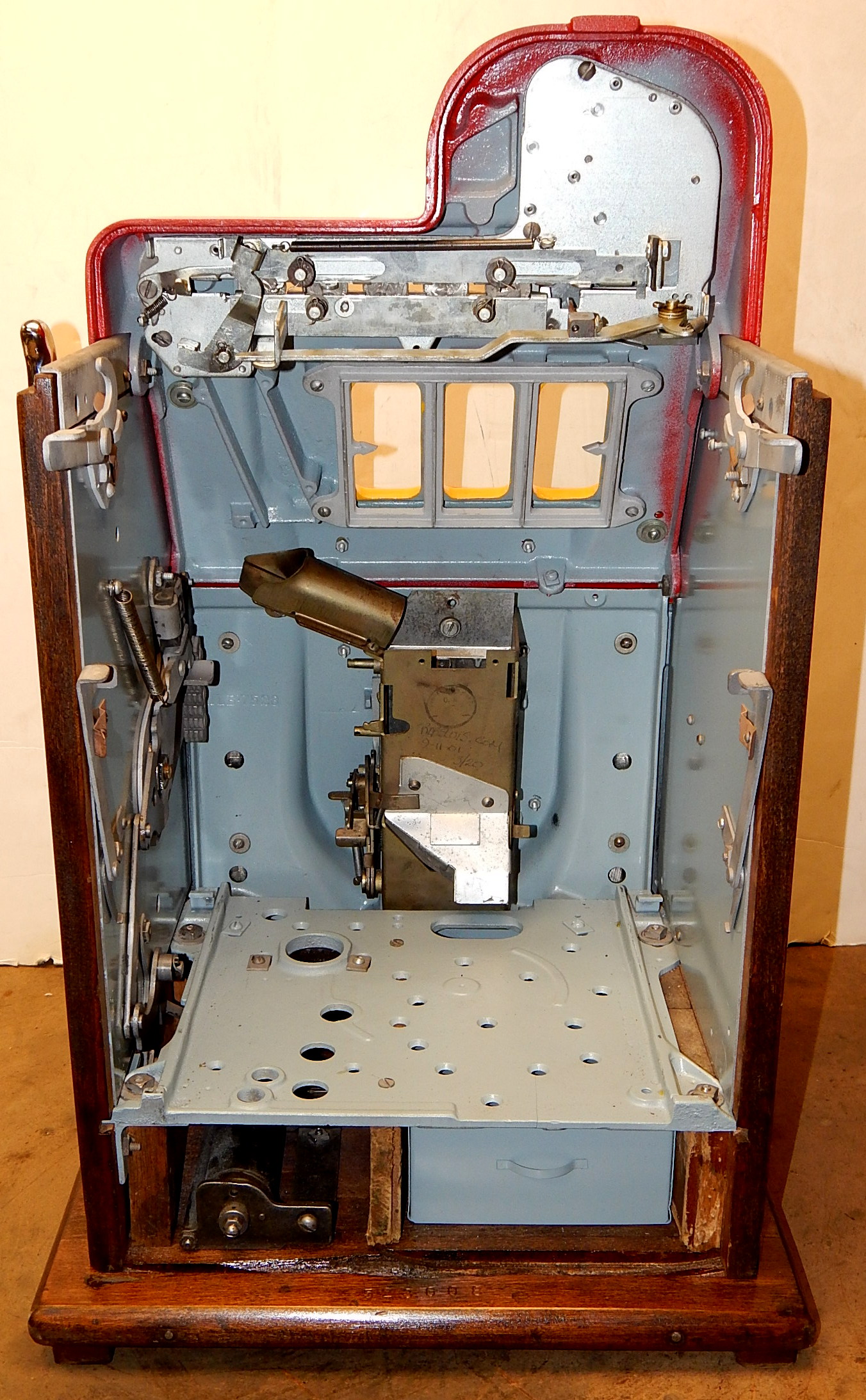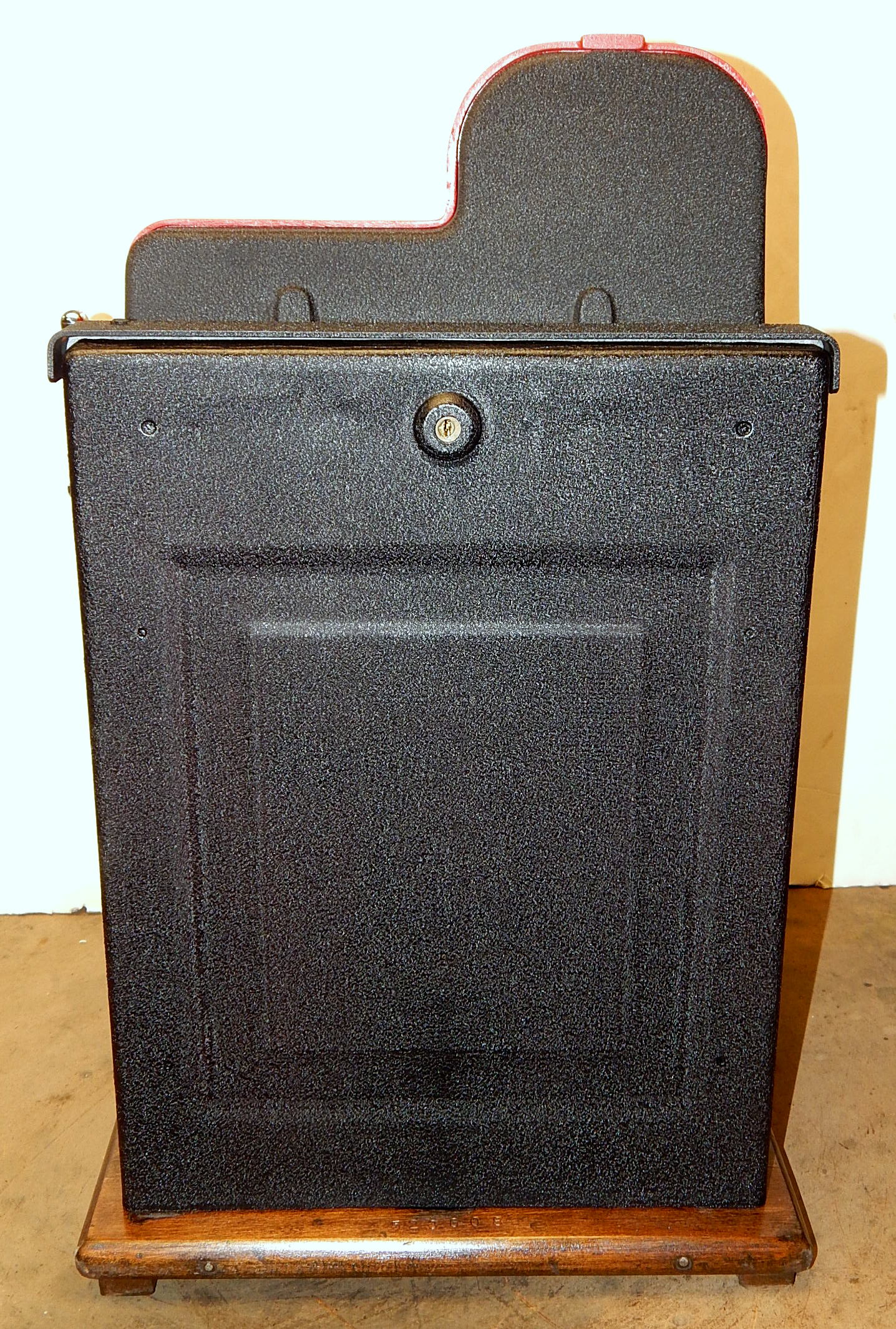 Mills 1948 Black Cherry Golden Nugget 25 cent, Gloss Red and Black Wrinkle trim in yellow. Front loading Jackpot, original back door with original Mills lock with one key, cash box. White Reel strips, award card, cashbox are replacements.
