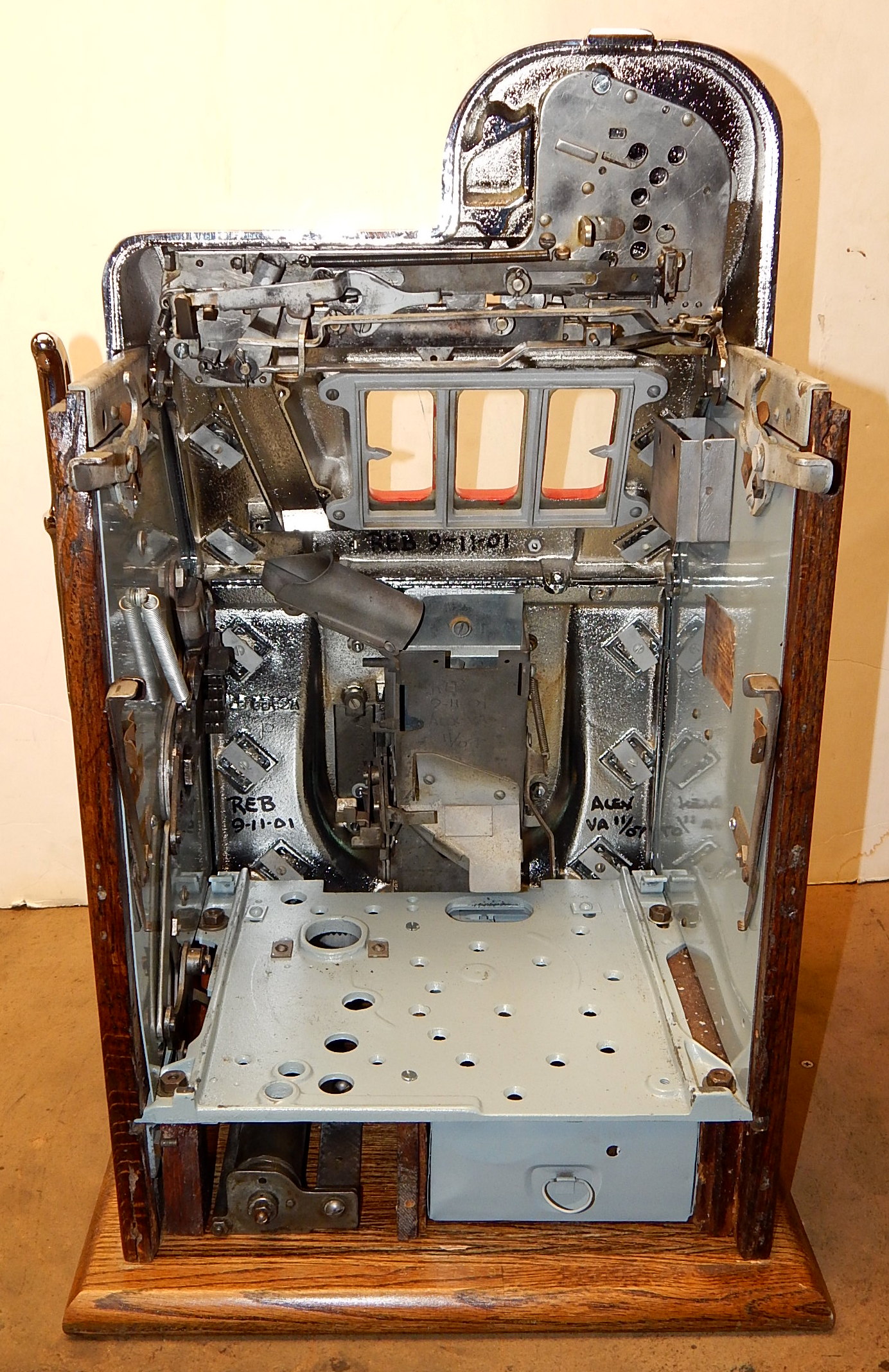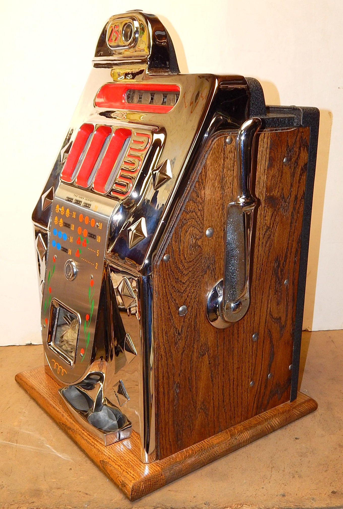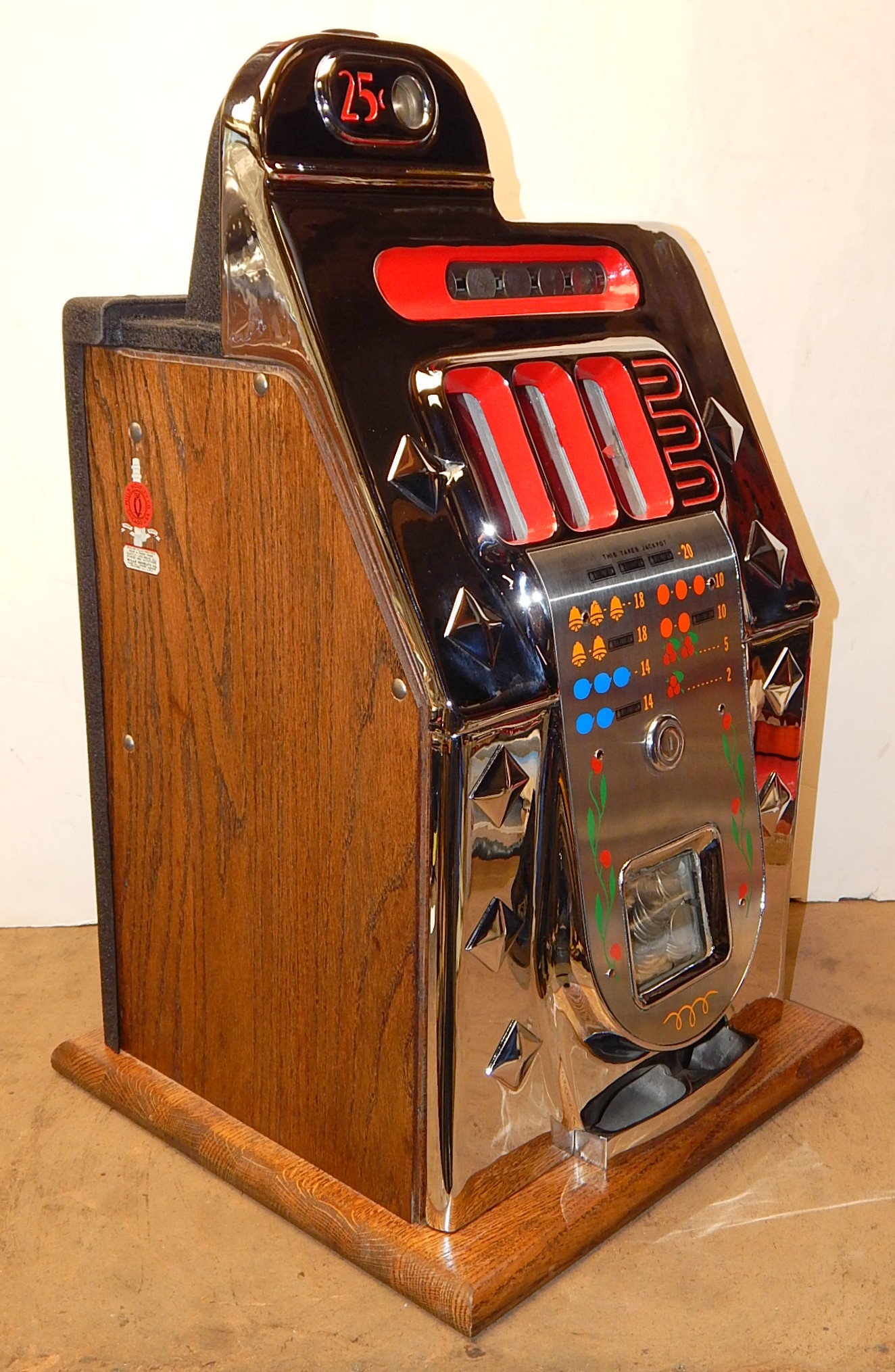 Mills 1941 Diamond Front 25 cent "Chrome". This is a very nice machine restored back to the original chrome finish. The cabinet on this machine was in such fine condition, we did not have the heart to hide this beautiful wood cabinet with paint, so its finished and stained instead of painted to bring out it's natural beauty. Mint condition award card, Jack pot with front loader, original back door and Mills lock with one key, original cash box. mint condition reel strips. Plays very easy, 2-5 payout.