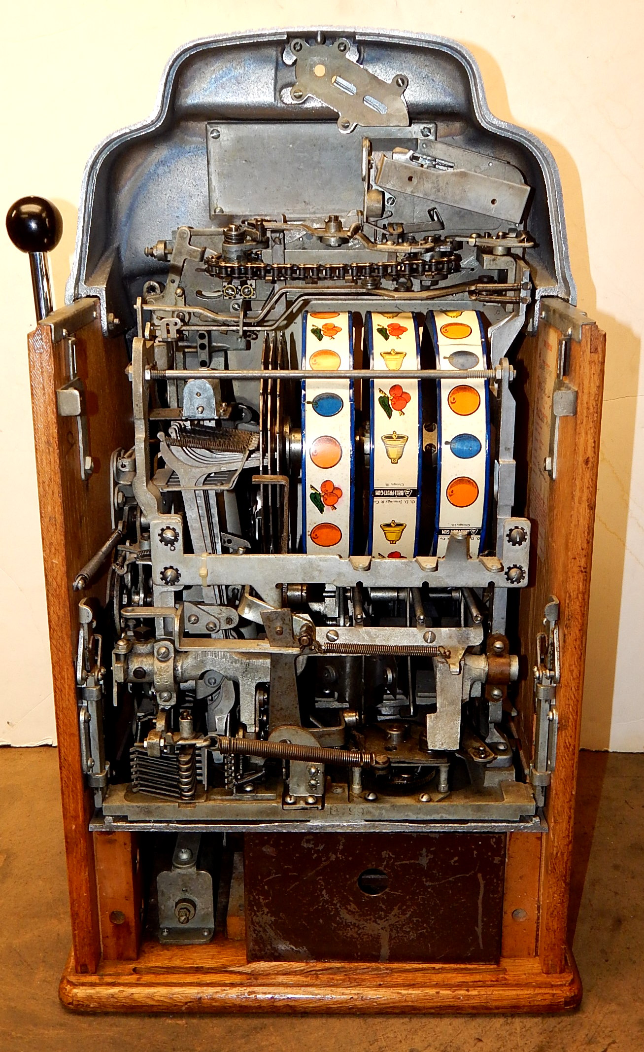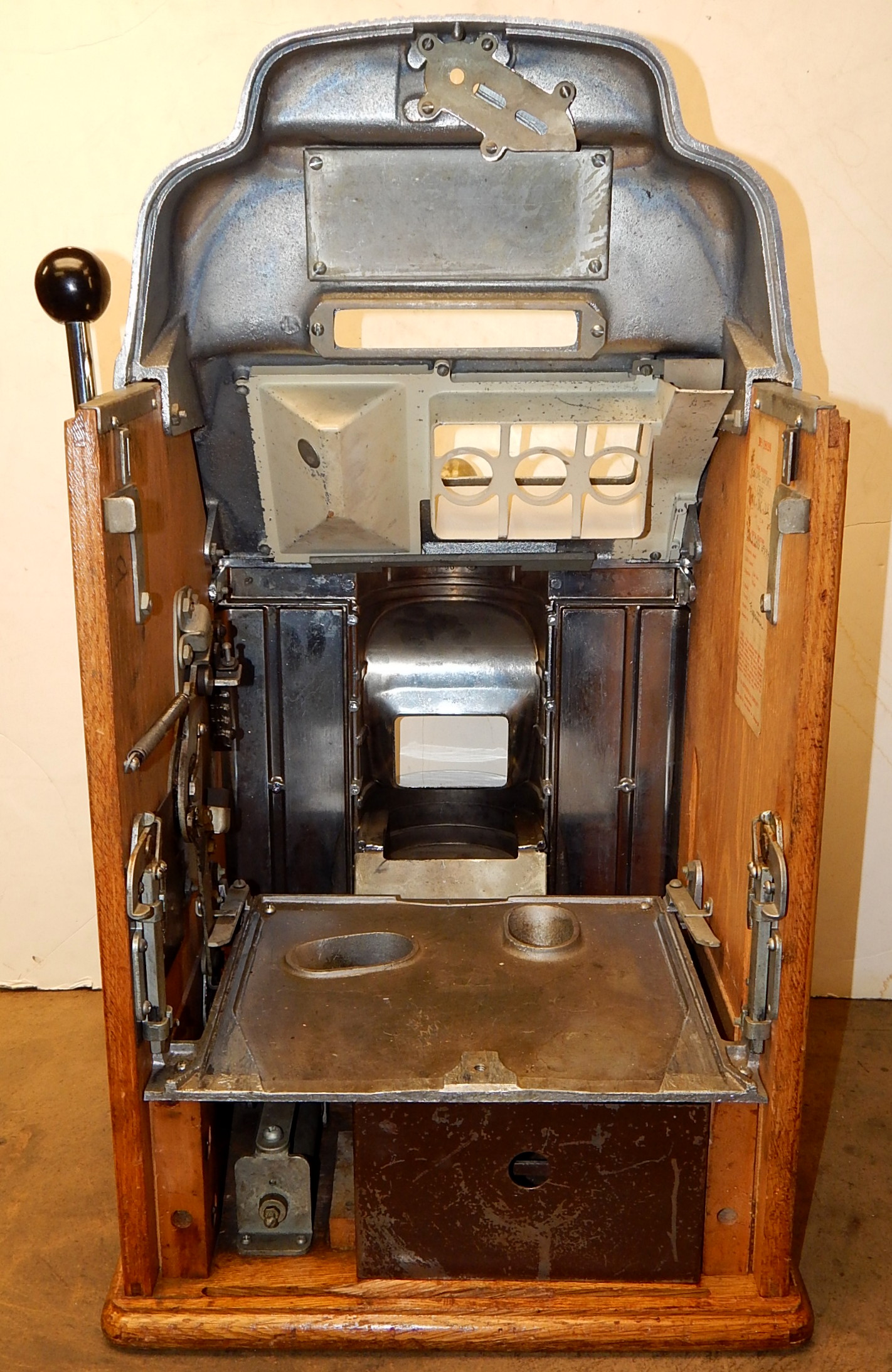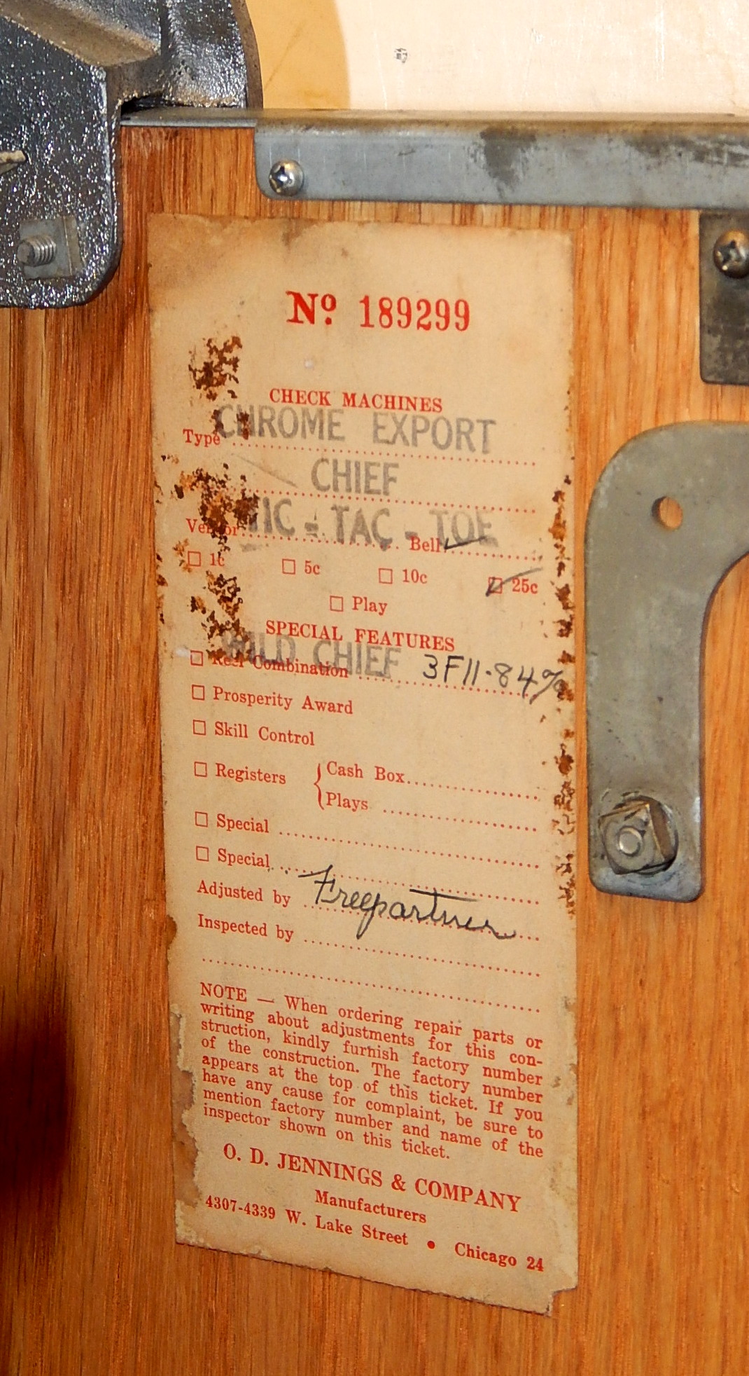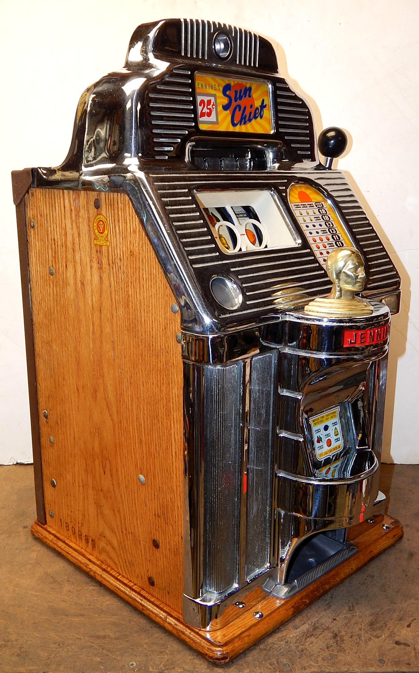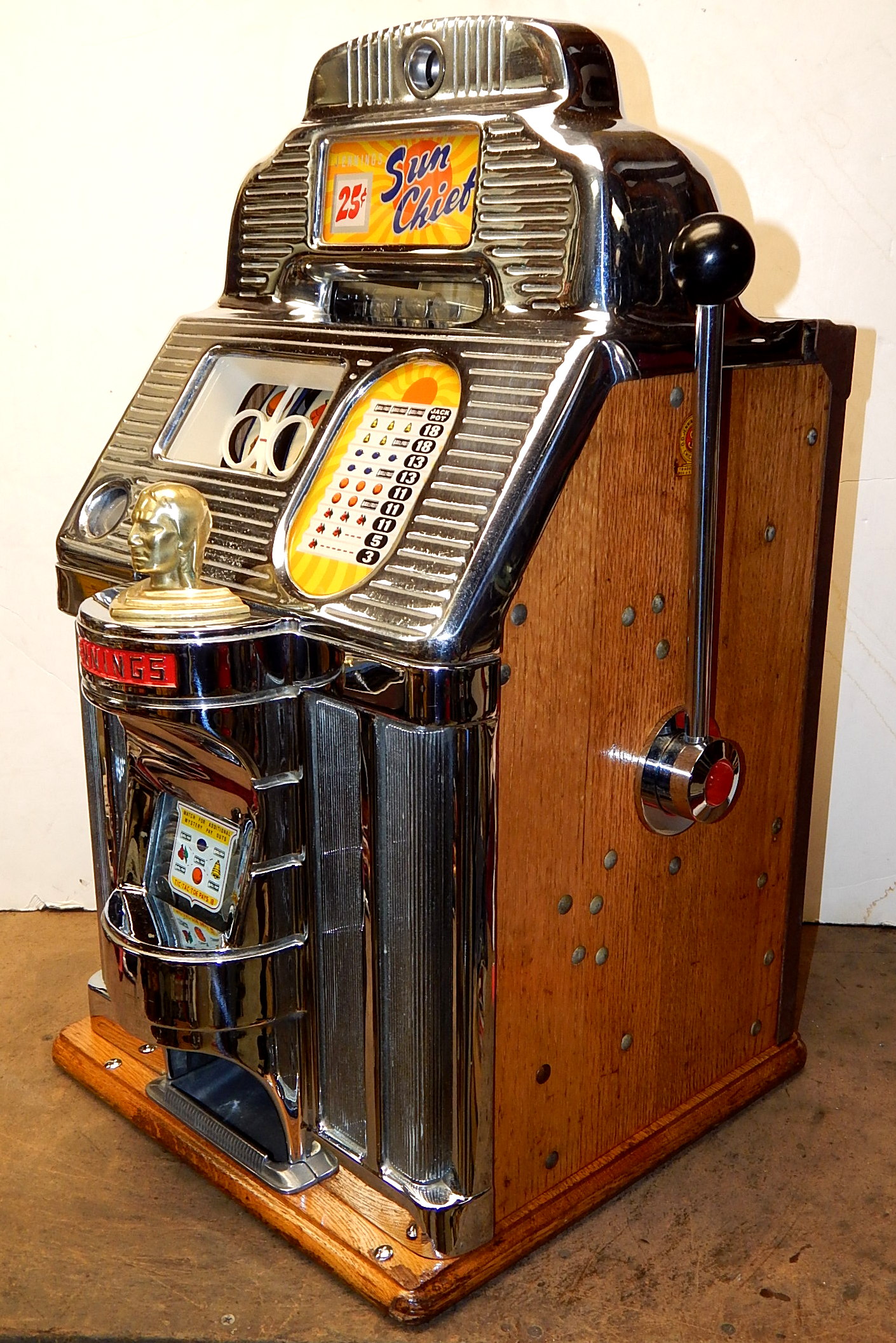 1948 Jennings Sun Chief "Wild Indian" 25 cent, A all original condition, not restored. Serial numbers match. Has full functional Jack-Pot. Original condition Reel strips. Original Award card and Marquee, original back door with Ace Lock and key, original Cash box. Chrome on this machine is a 9 out of a 10, not bad for 69 years old. If you are looking for untouched original then here it is. Plays very nice.
