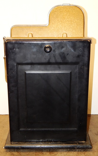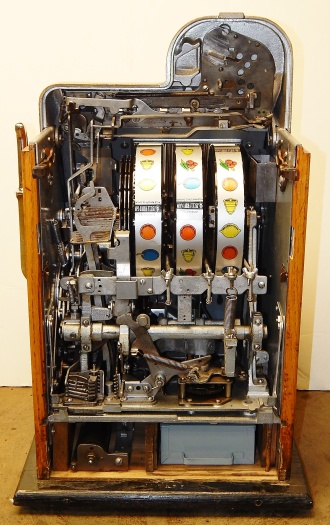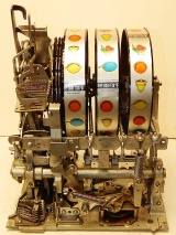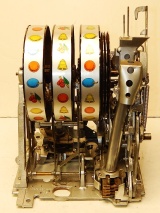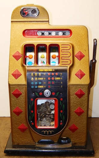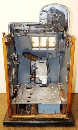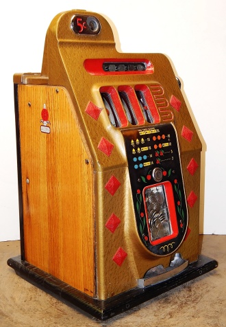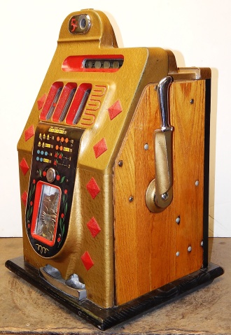 1939 Mills Diamond Front, 5 cent. This is a very nice cast iron machine previously restored. Hammer Gold, trimmed in red with what I believe is the original paint. The cabinet on this machine has a beautiful oak wood finished to show its natural beauty. Mint condition award card, Front load Jackpot with original Mills front loader lock, original back door with Mills lock with one keys, cash box, new reel strips. Plays and pay as it should, 2-5 payout.