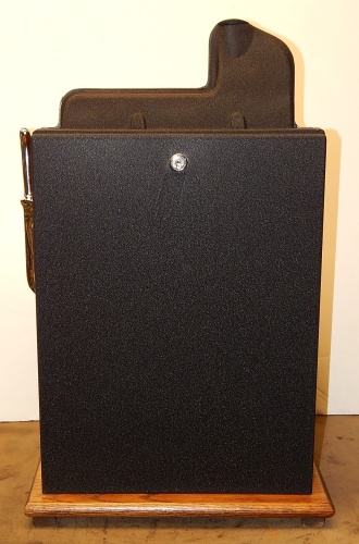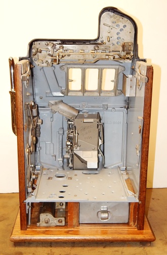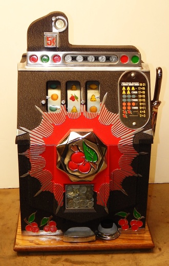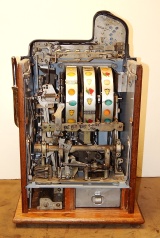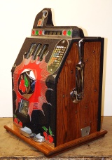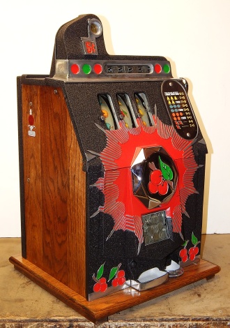 Mills 1938 Bursting Cherry, 5 cent . This is a very nice machine restored, Black wrinkle, with red and green trim colors. Mint condition award card, Jack pot with reserve, original cash box. Plays very easy, pays as it should. 2-5 payout.