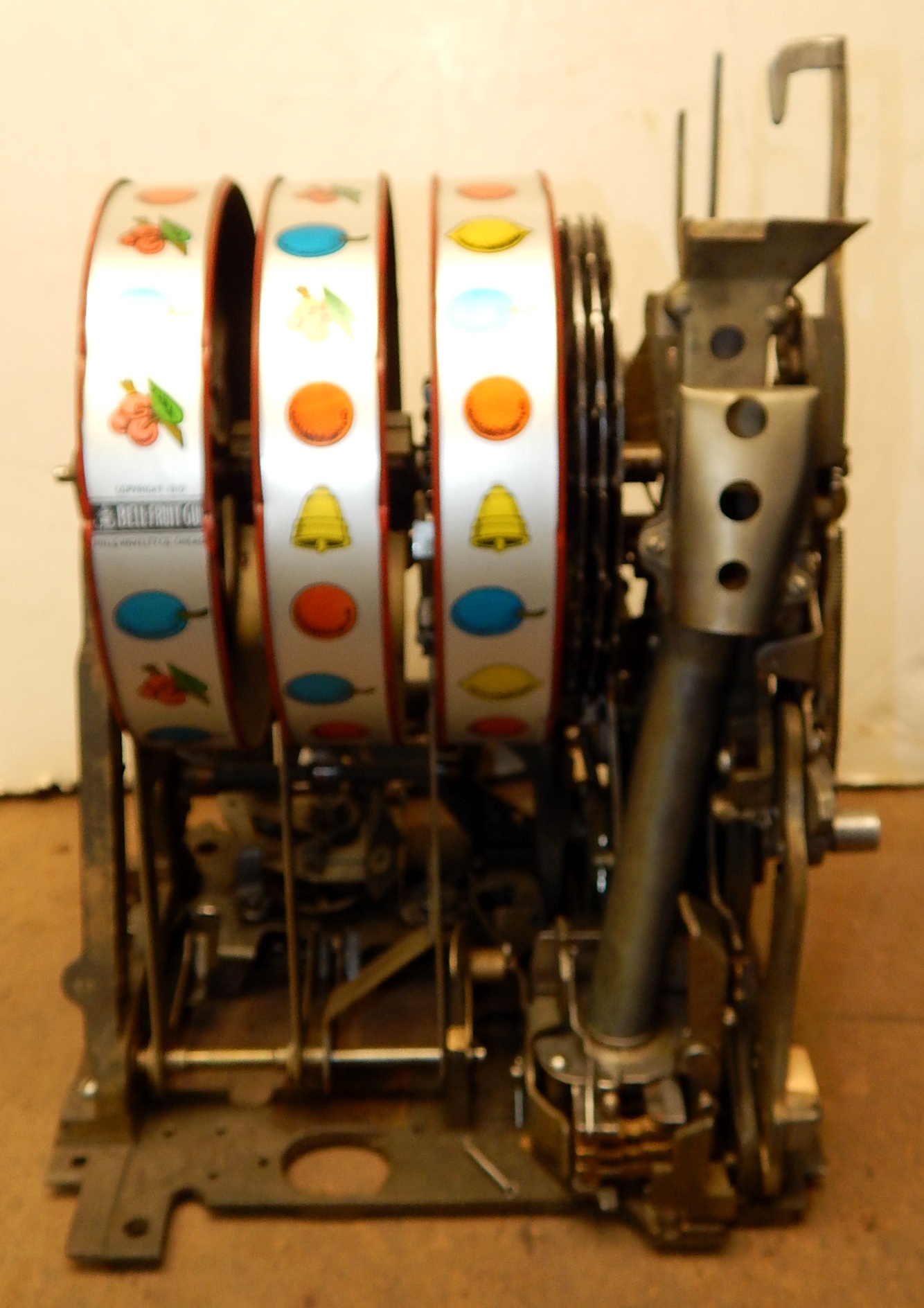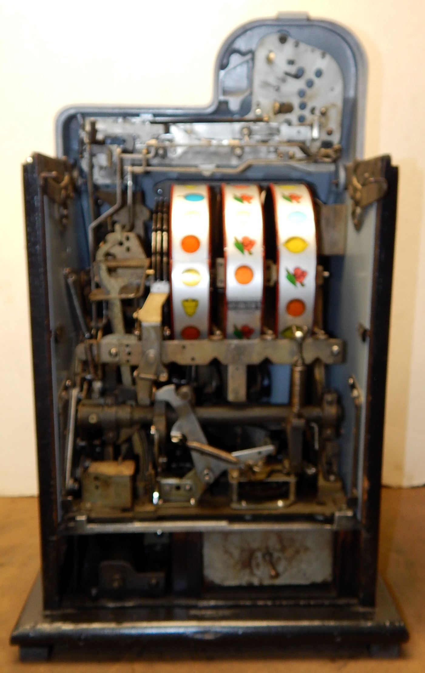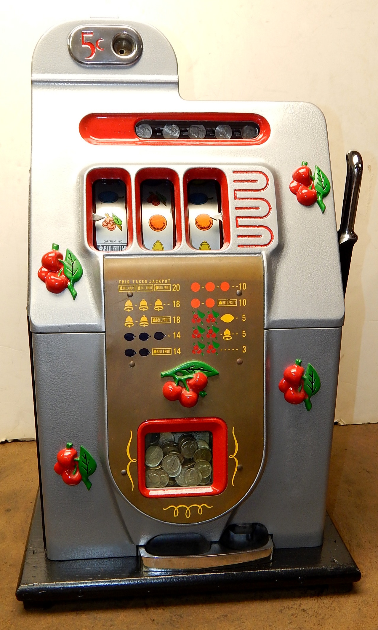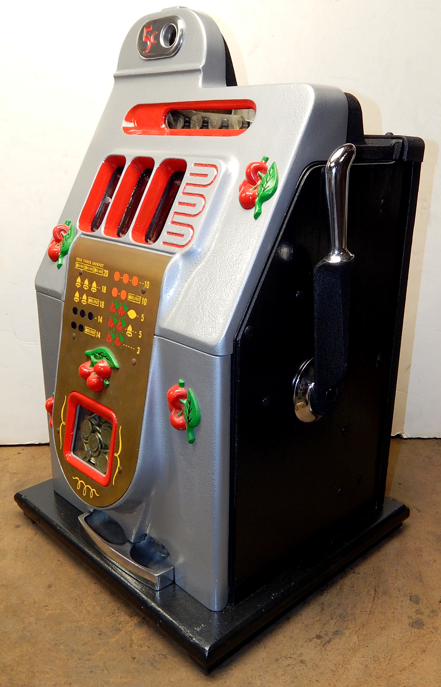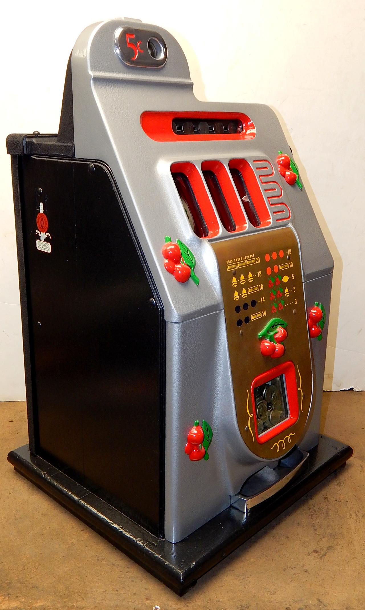 1946 Mills Black Cherry 5 cent, Hammertone Silver, trimmed red with black cabinet This is a very nice machine. Jackpot with reserve. Back door with lock with one key, cash box. Plays very easy. A great rec-room machine.