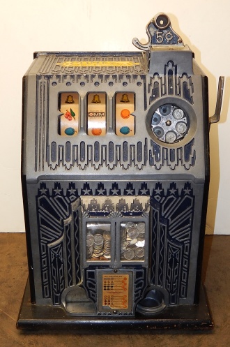 1935 Pace "Fancy Front" 5 cent, original colors Blue, trimed in yellow. Original reel strips and award card. Original back door. Original cash box, functional twin jackpots. Plays and pays as it should. 3-5 pay out. In line to be restored or sell as is.