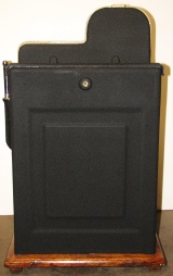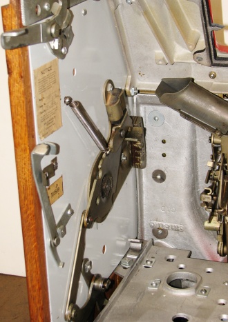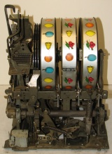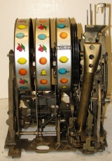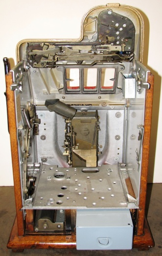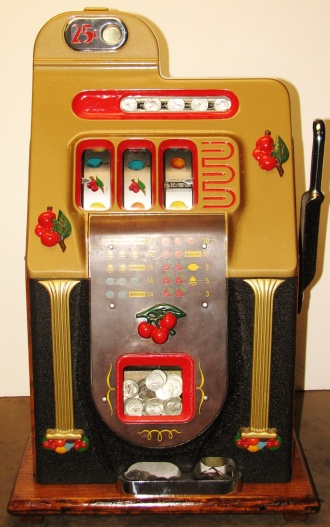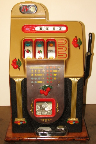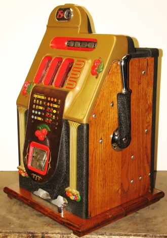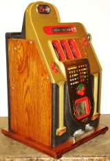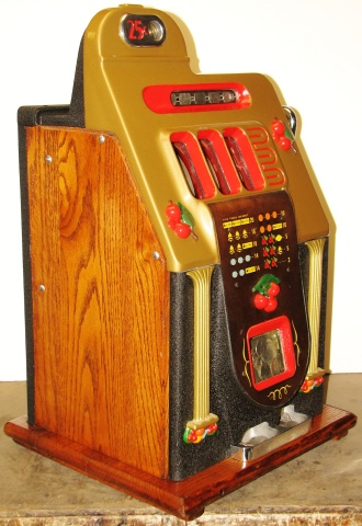 Mills 1948 Golden Falls 25 cent, Restored, painted hammer gold and winkle black, trimed in red. This machine has a very nice all oak cabinet. Jack pot with reserve, original back door with an original Mills lock with one key, original cash box, mint condition original award card. Still has the original paper tags on the inside of the cabinet. This is a very nice all orignal machine. Plays very easy, 3-5 payout.