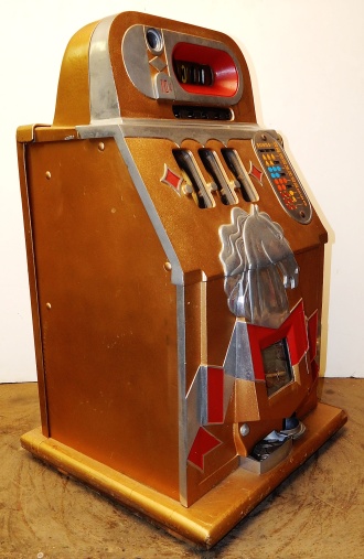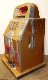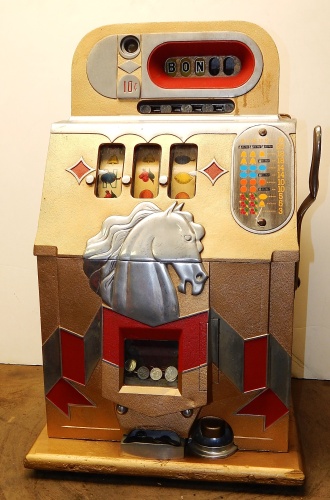 Mills 1938 Horse Head Bonus, 10 cent. Gold trim in red, with the Hard to find Bonus feature. original reel strips, new award card, original cashbox, original back door with locks with one keys. When the BONUS letters on the first reel come up in order, corresponding letters will appear at the top right of the machine. Once the entire word BONUS is spelled out, you win 18 coins. This was another way Mills would try to keep people playing longer and if you had almost all the letters showing, it was hard to walk away.