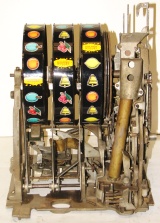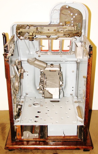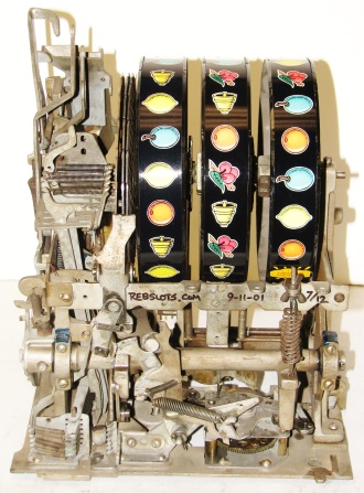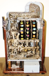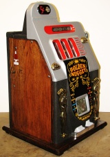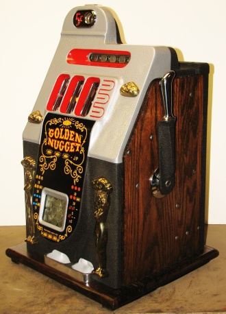 This machine was originally a Black Cherry. We had a customer request a Golden Nugget for his collection and changed his mind after we completed the machine. This machine was never in the Golden Nugget casino in Las Vegas. There were only a hundred or so Golden Nugget machines made for the casino back in the 50s. I don't want any one to think this is a original machine from the casino. We added a golden nugget kit to an original 1947 Black Cherry which only consist of two dolls, two nuggets, reel strips, and a award card. The machine it self is all original made by MIlls