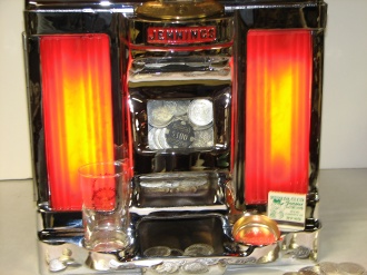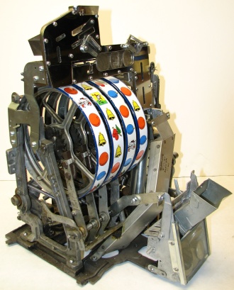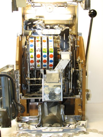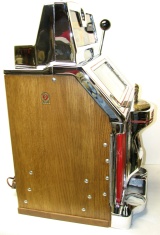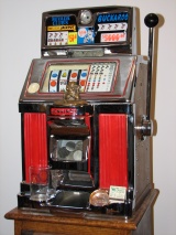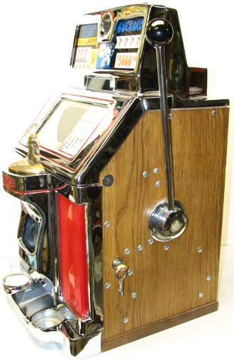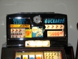1964 Jennings (lite-up) Nevada Club 4 Reel Continental Buckaroo. Rare $1.00 denominations, with front-load functioning jackpot. The chrome plating on this machine is in mint condition. The cabinet is made of solid Oak Wood, not masonite. The machine comes with various casino tokens, NOT THE SILVER DOLLARS pictured. It plays and pays as it should. Some History about this machine: Spurred by the Nevada Club, the SUN CHIEF and BUCKAROO, were used in a redesigned and easy-to-service front opening machine that was given the new line name CONTINENTAL. With only 23 people working in the plant in the spring of l964, they used the existing Nevada Club mechanisms inside new cabinets. It has been reported that 460 were modified in a variety of 3- and 4-reel configurations, with fluorescent lights on the tops and sides, in the style of the EL DORADO. In a cost-cutting effort, the cabinet sides were made of Masonite. It was a late comer to the market and the easily maintained CONTINENTAL mechanical Bell machine remained in short supply. The El DORADO and the CONTINENTAL were end of the line as the old timer, producers and operators knew them. The Nevada Club used these machines at both the Lake Tahoe and Reno locations.