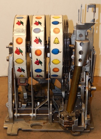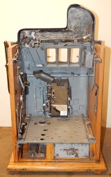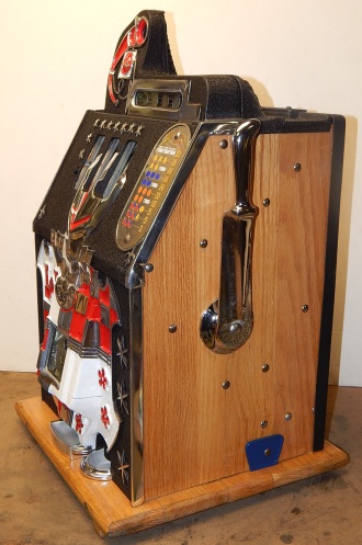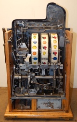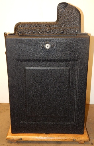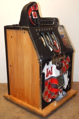 1933 Mills Castle Front 5 cent, painted wrinkle black, red, white polished not plated. Restored condition with working Jackpot and reserve, original Reel Strip, original back door, original lock with one key, cash box. 3-5 play out. Plays very easy.