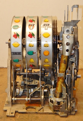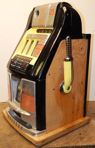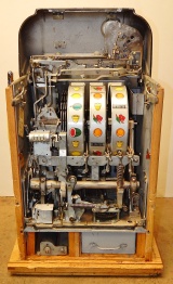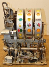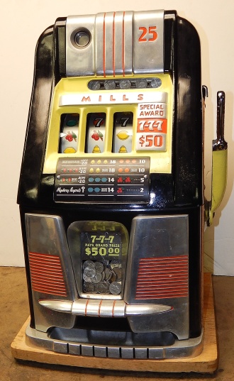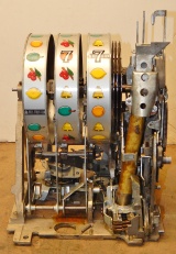 1950 Mills Hi-Top 7-7-7, 25 cent. Very nice original machine not restored, with full Jackpot, original cash box, original back door, original reel stripes. original Mills lock with one key, 7-7-7 Token vendor with two tokens. Still has the original paper work on the cabinet and mechanism. I don't think this machine was ever on location from the looks of the coin track. If your looking for a nice original machine with very little play, here you are.