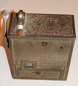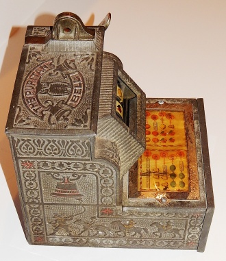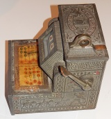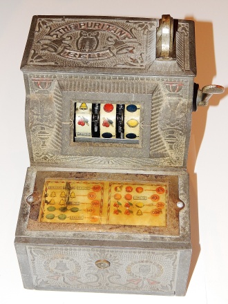 Mills 1927 Puritan Bell 5 cent, All original condition with original front and back locks and keys. Original tin reel strips and award card. Commonly known as the "Aluinum Puritan" It was part of the late 20s. This is a counter top "Trade Stimulator" no cash payout. 8" wide 9" tall 9" long. Plays as it should.