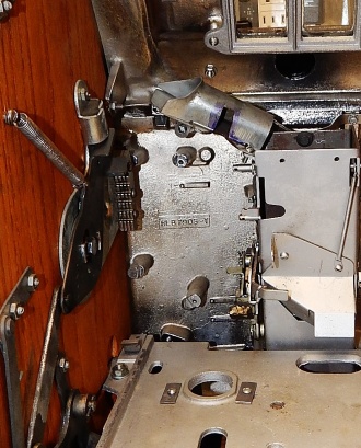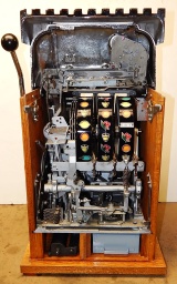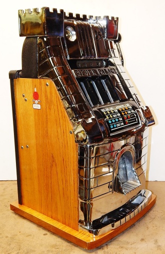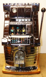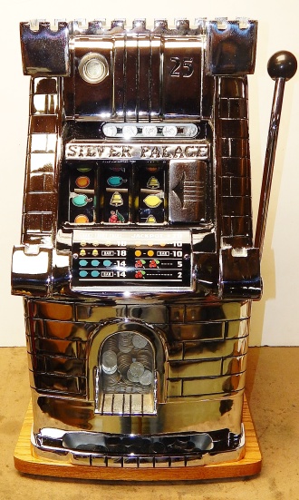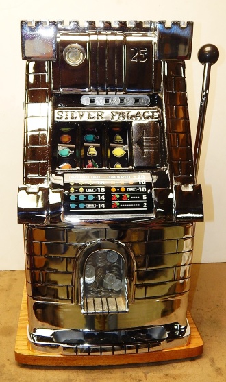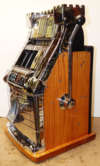 Mills 1964 Silver Palace 25 cent, This is a very Hard to find machine restored. Chrome plated 9.9 out of a 10, trimed in Black. Mint condition black award card, black reel strips, original back door with Mills lock with one key, cash box, oak cabinet, jackpot. MLB numbers on both casting and serial number on cabinet Plays very easy, 2-5 pay out.