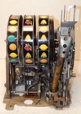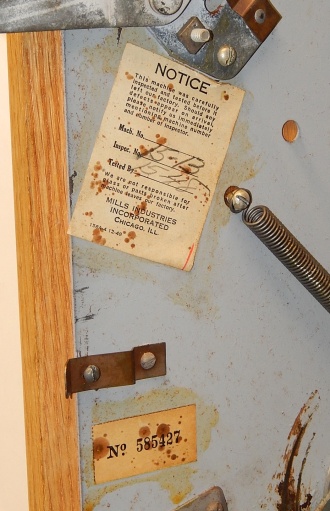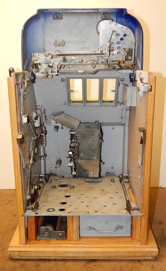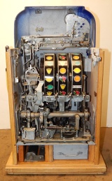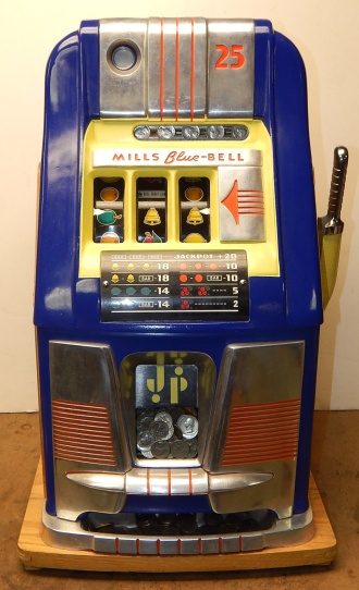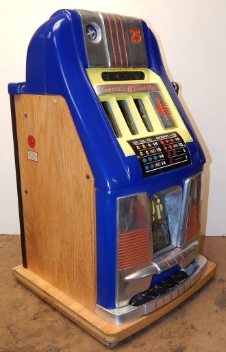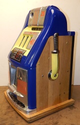 Mills 1948 Blue Bell Hi-Top 25 cent, In original condition. This machine was never in service other then home use. The previous owner bought this machine new in the box many years ago for a Moose Lodge. Other then a couple very small paint chip where coin where dropped in the reel window it as good as it gets for original condition. Award card, reel strips, Jackpot with reserve, back door with Mills lock with one key, cash box, oak cabinet are near mint condition. Still has the original paper inspection tag and serial number on the inside of the cabinet and mechanism. Plays very easy. We also have a Nickel Blue Bell listed in the same condition on the web site from the same person if your looking for a set of nickel and quarter like new.