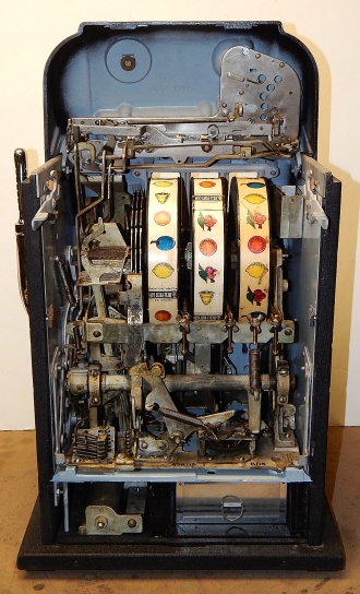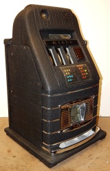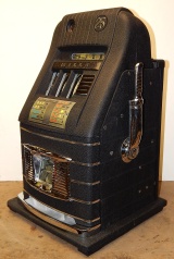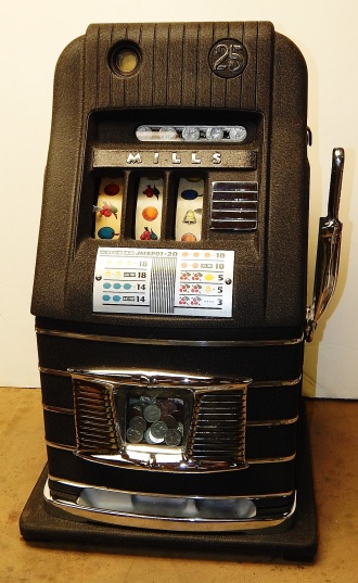 1946 Mills Jewel Bell Hi-Top 25 cent, This is a very nice restored machine. Painted wrinkle black. All the trim on this machine has been chrome plated to add a little flash to the black color. Mint condition original award card, Jackpot with reserve, original back door and lock with one key, original reel strips, new cash box. Plays very easy.