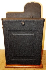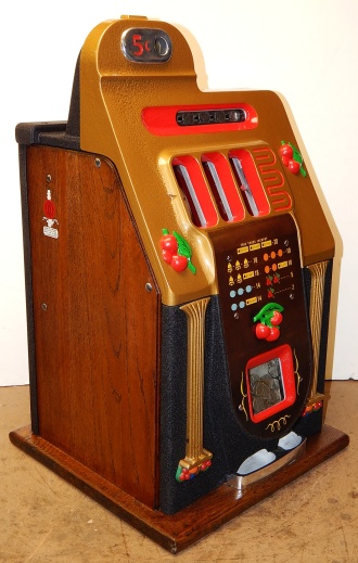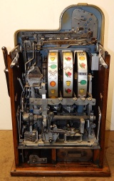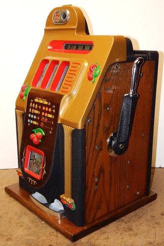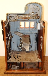 1948 Mills Golden Falls 5 cent, painted hammer gold and winkle black, trimmed in red. This machine has a very nice all oak cabinet. Jackpot with reserve, original back door with an original Mills lock with one key, cash box, mint condition original award card. This is a very nice all original machine. Plays very easy.