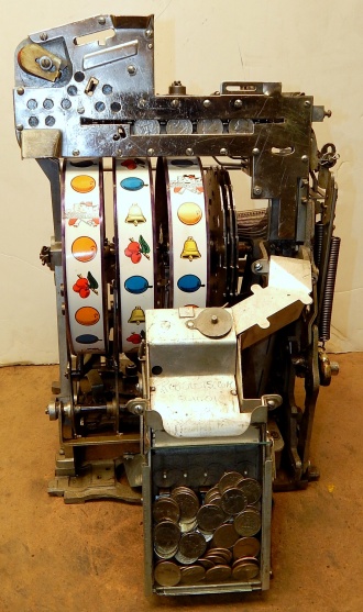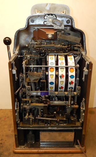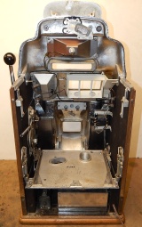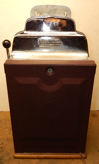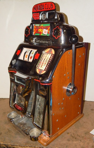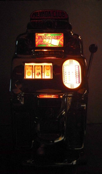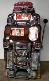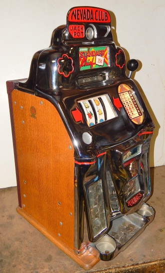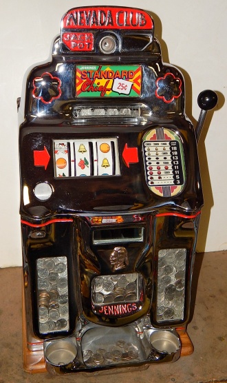 1948 Jennings Chief "Nevada Club" 25 cent "Lite-up", previously restored. Chrome plated 9.9 out of a 10. Mint condition award card, reel strips, marquee. Working automatic Jackpot with reserve. Original back door with Ace lock with one key, Super nice original oak cabinet. Lights up very nicely in low light condition as when it was in the casino.