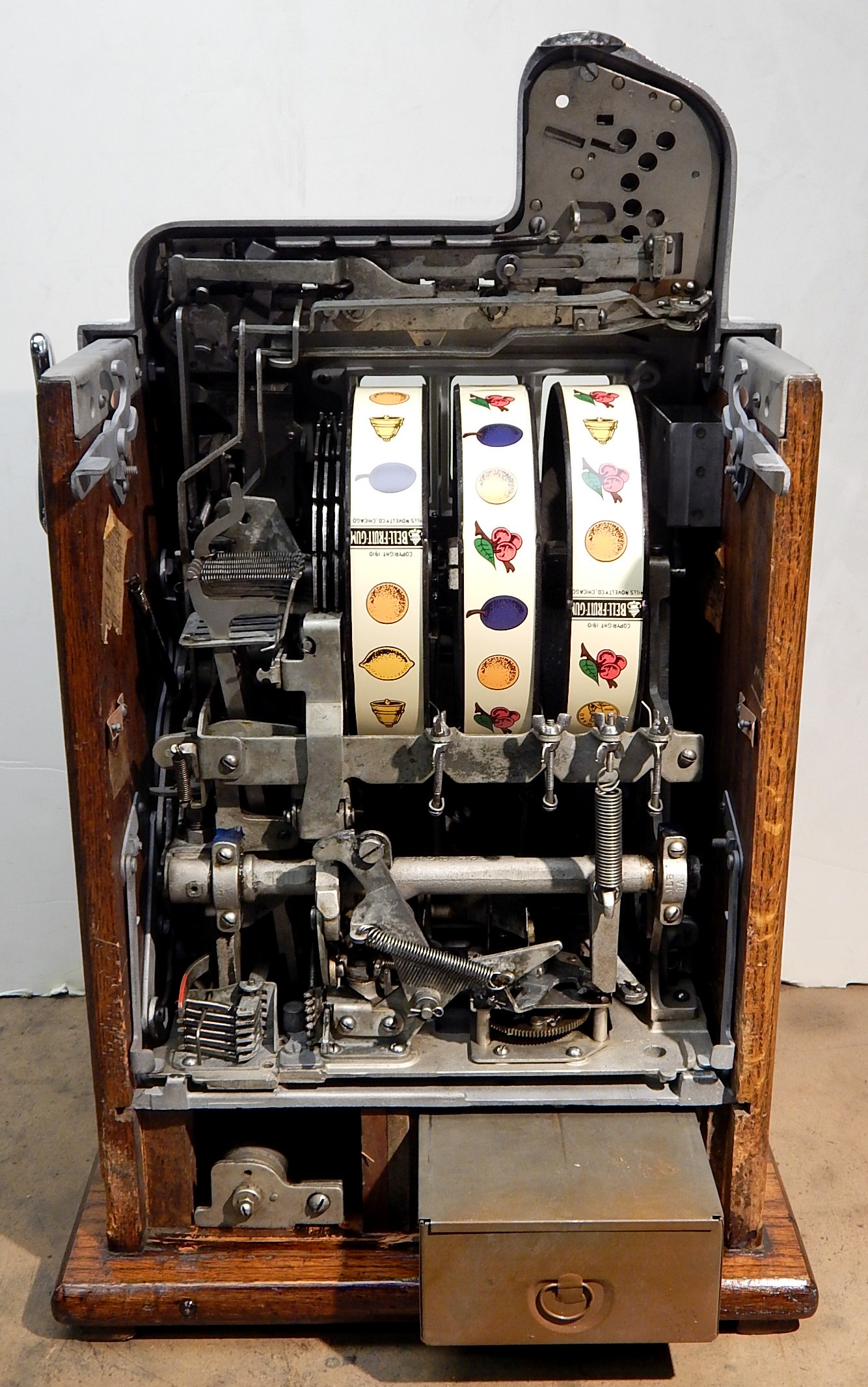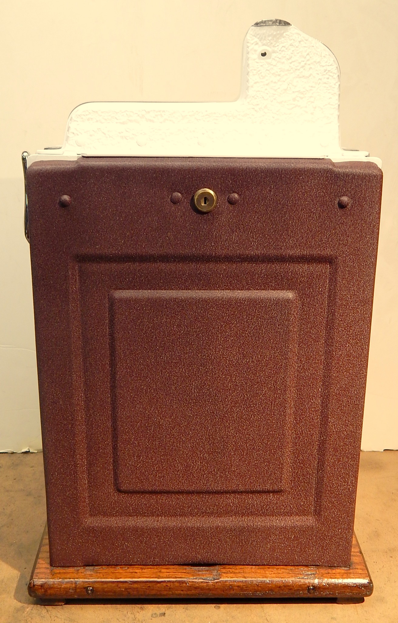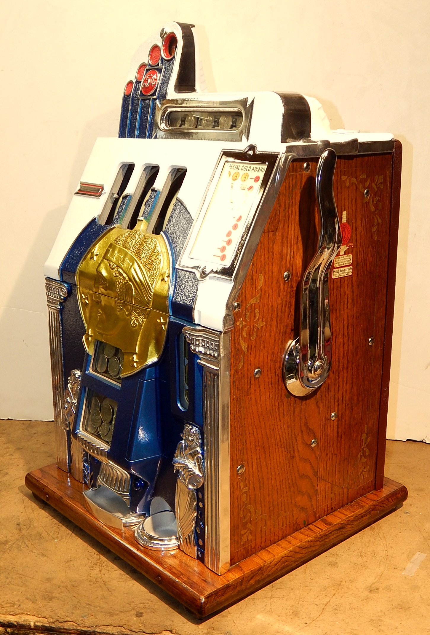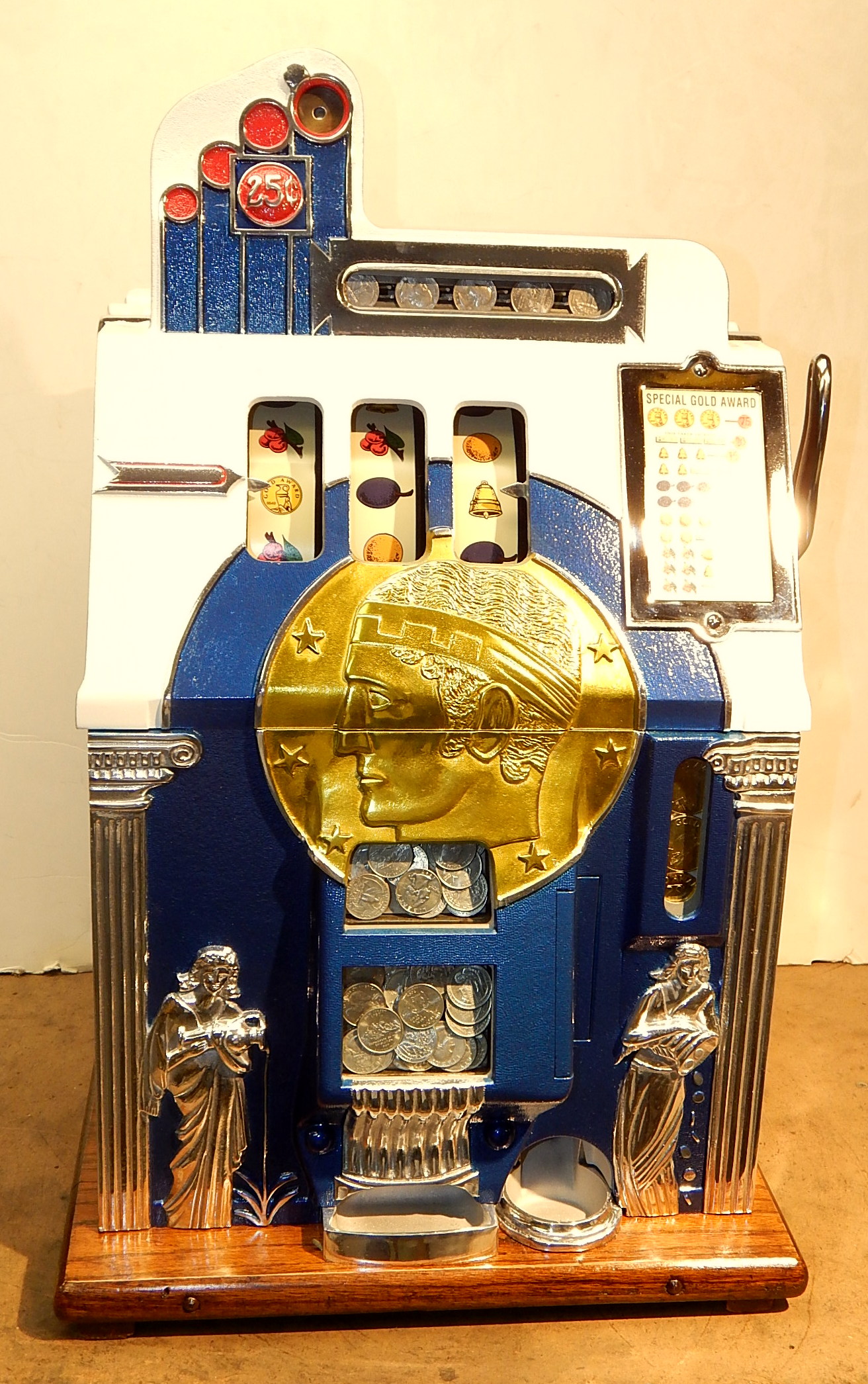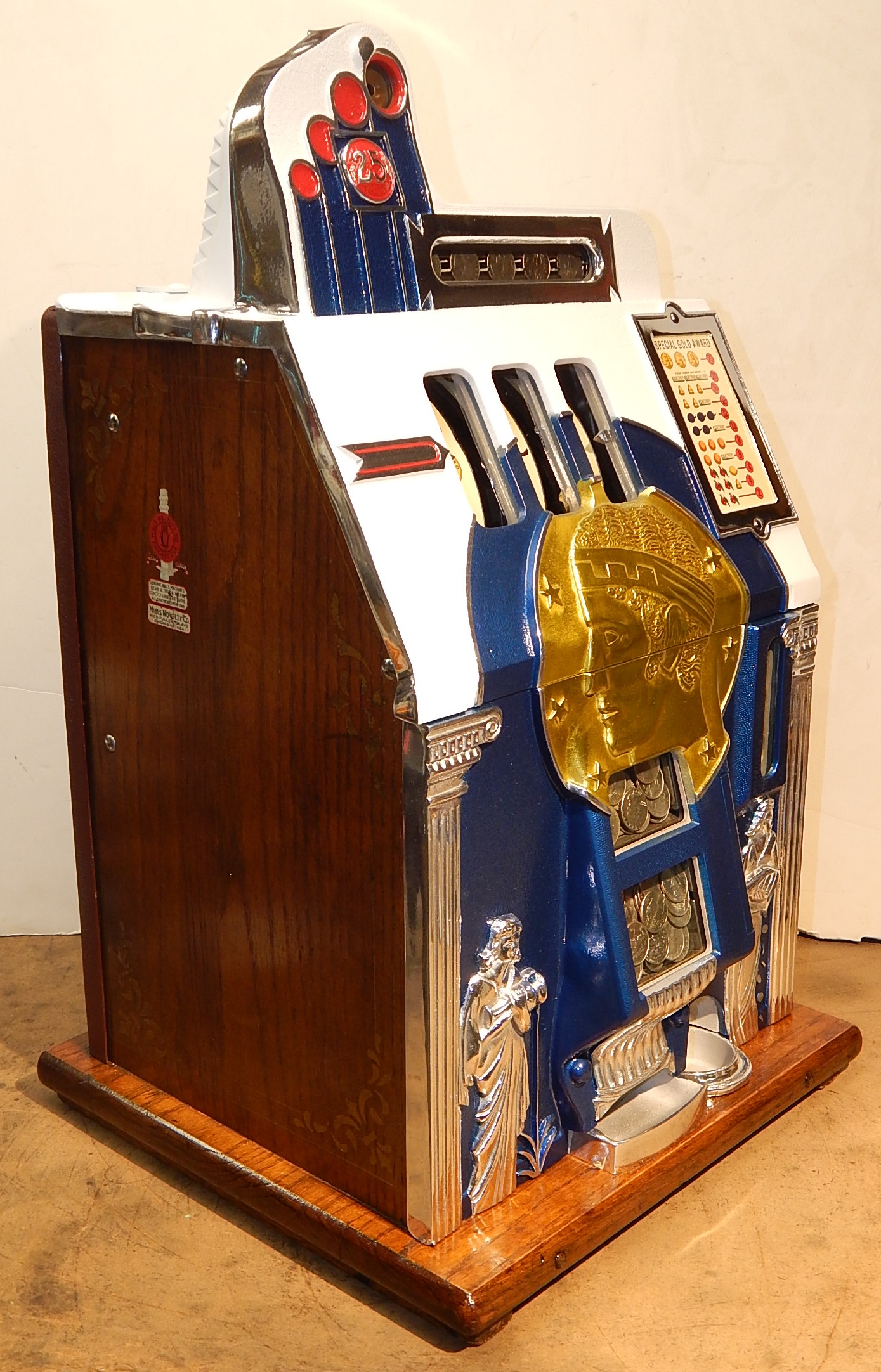 1932 Mills Roman Head with Gold award, 25 cent. original condition restored. White trimmed in blue and Gold tint. Gold Award with 4 gold ward tokens. Jackpot with reserve, new reel strips, original back door, Mills lock with one key, original cash box, oak cabinet. Plays very easy.