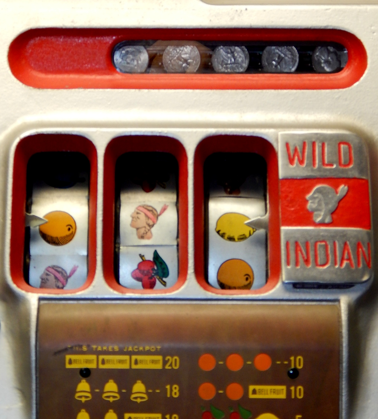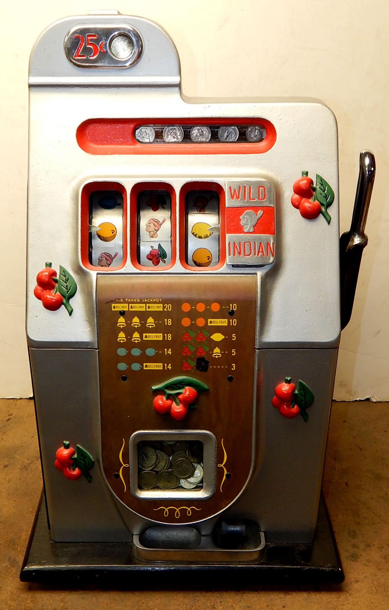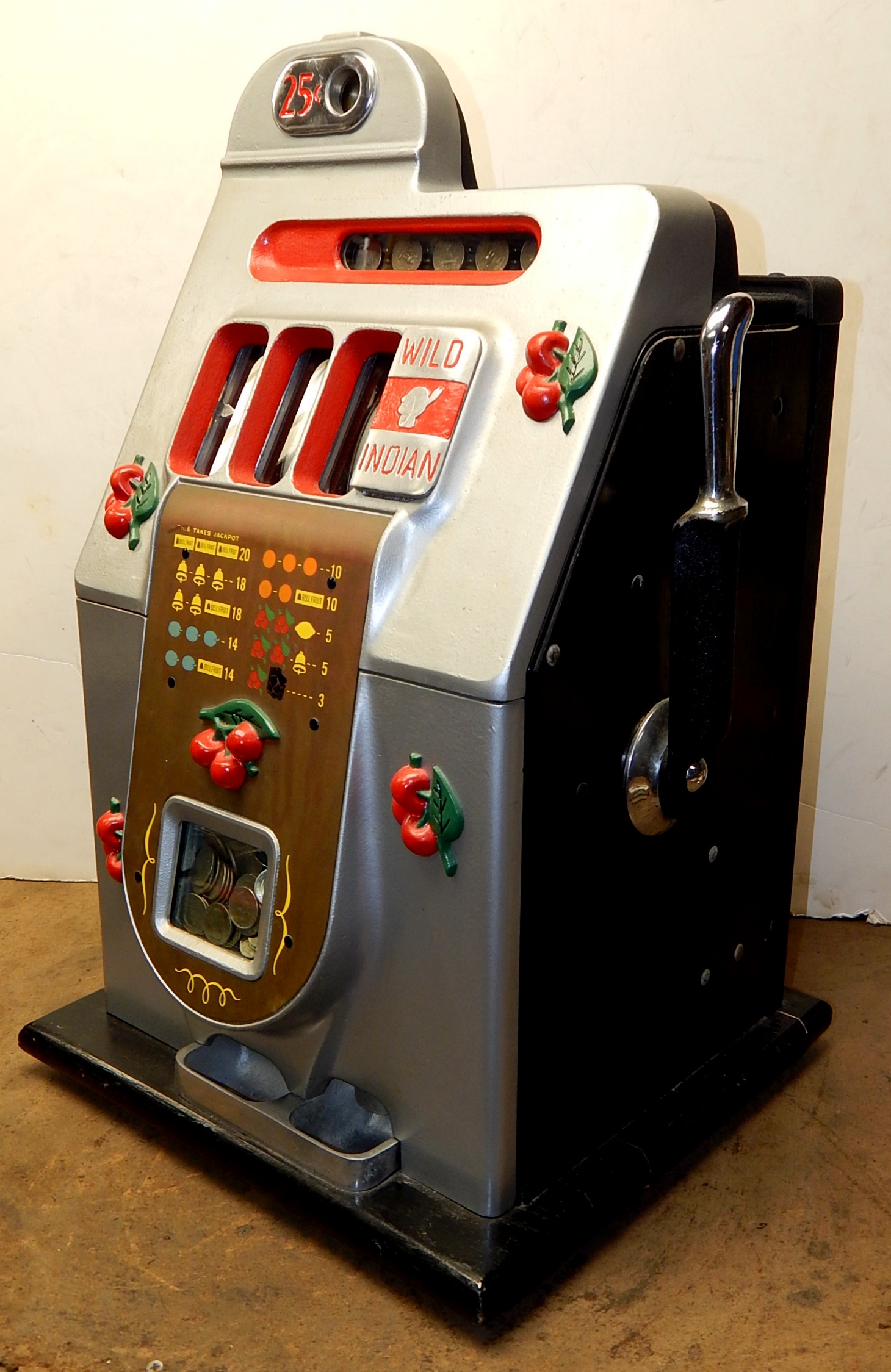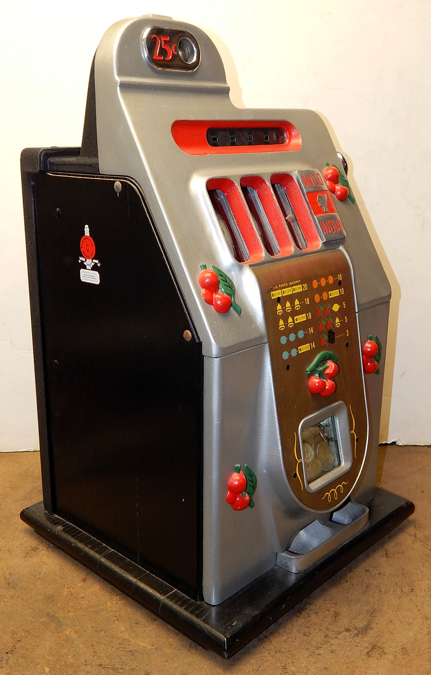 1946 Mills Black Cherry 25 cent "Wild Indian", We recieved this machine from the state of Maryland. Instead of three bars, there are three Indians that are wild, anytime they show up on the center line they are wild and go with any payout combonations. Older restoration. Silver, trimmed red with black cabinet This is a very nice machine, award card, new reel strips. Jackpot with reserve. Back door with lock with one key, cash box. Plays very easy. A great rec-room machine.