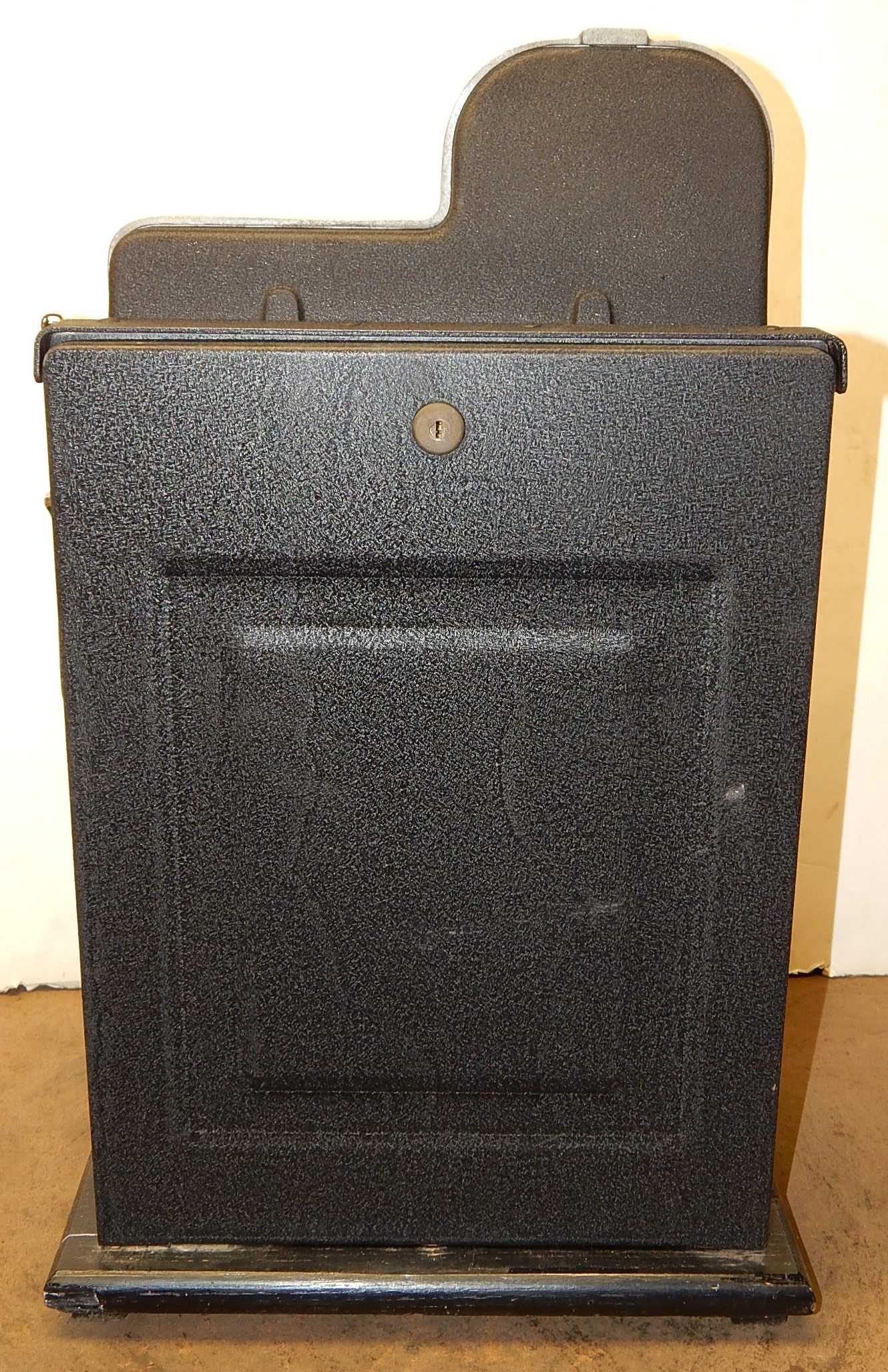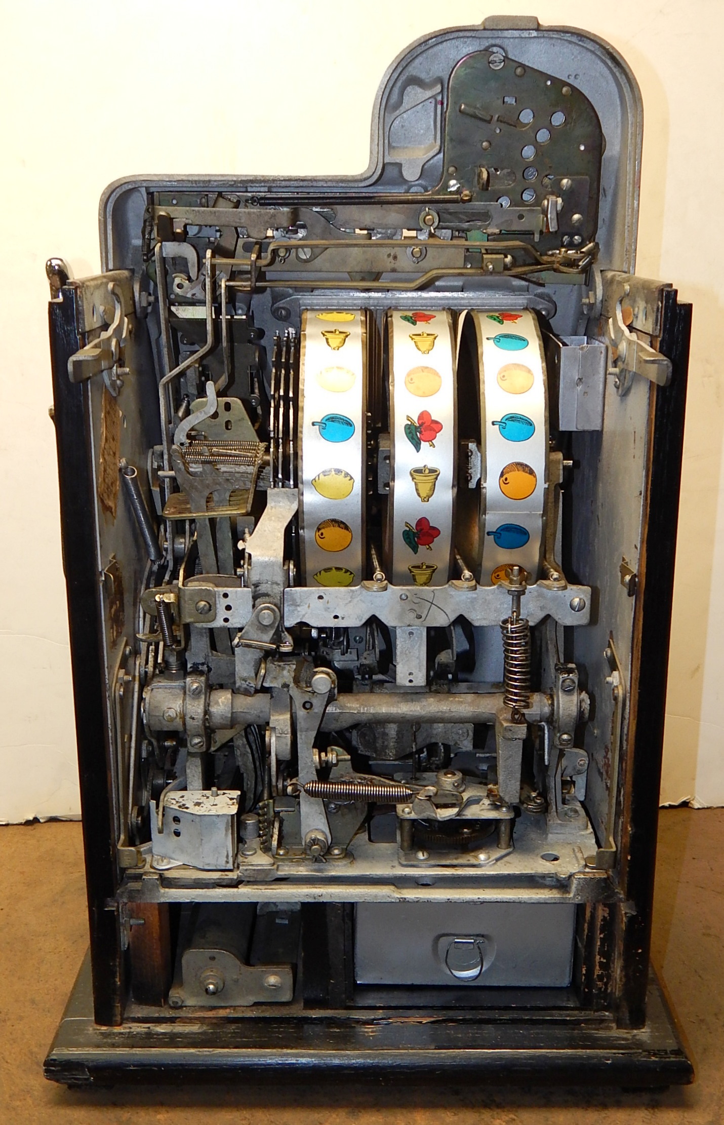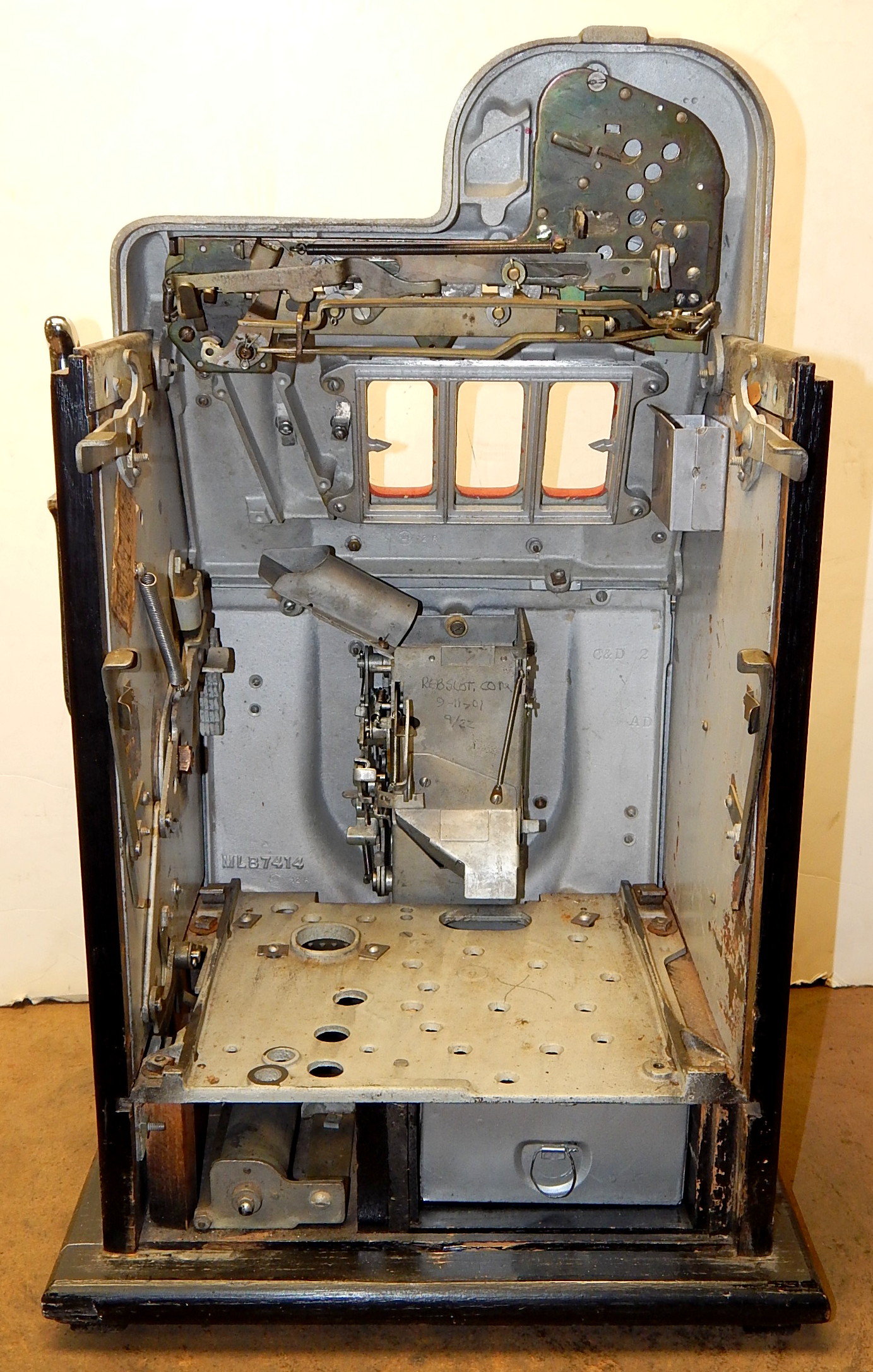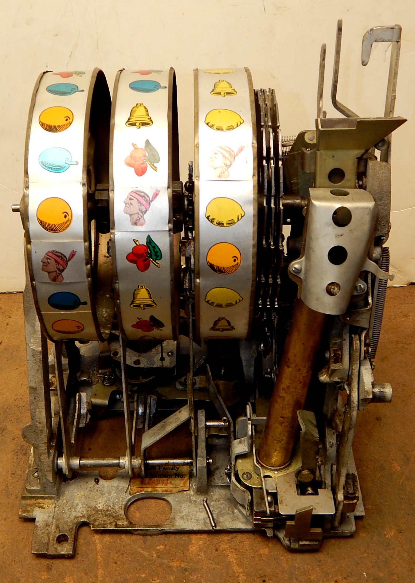 1946 Mills Black Cherry 25 cent "Wild Indian", We recieved this machine from the state of Maryland. Instead of three bars, there are three Indians that are wild, anytime they show up on the center line they are wild and go with any payout combonations. Older restoration. Silver, trimmed red with black cabinet This is a very nice machine, award card, new reel strips. Jackpot with reserve. Back door with lock with one key, cash box. Plays very easy. A great rec-room machine.