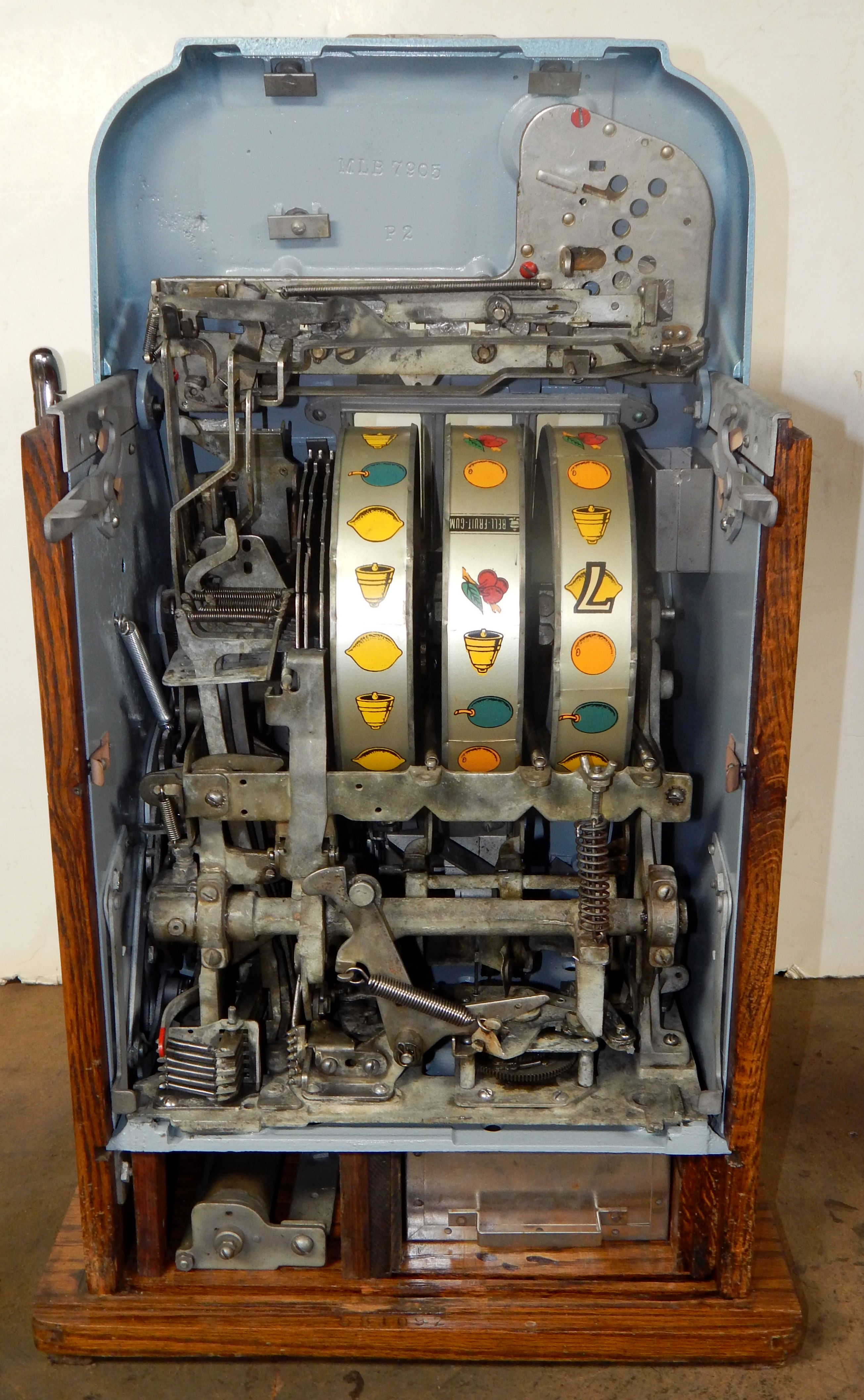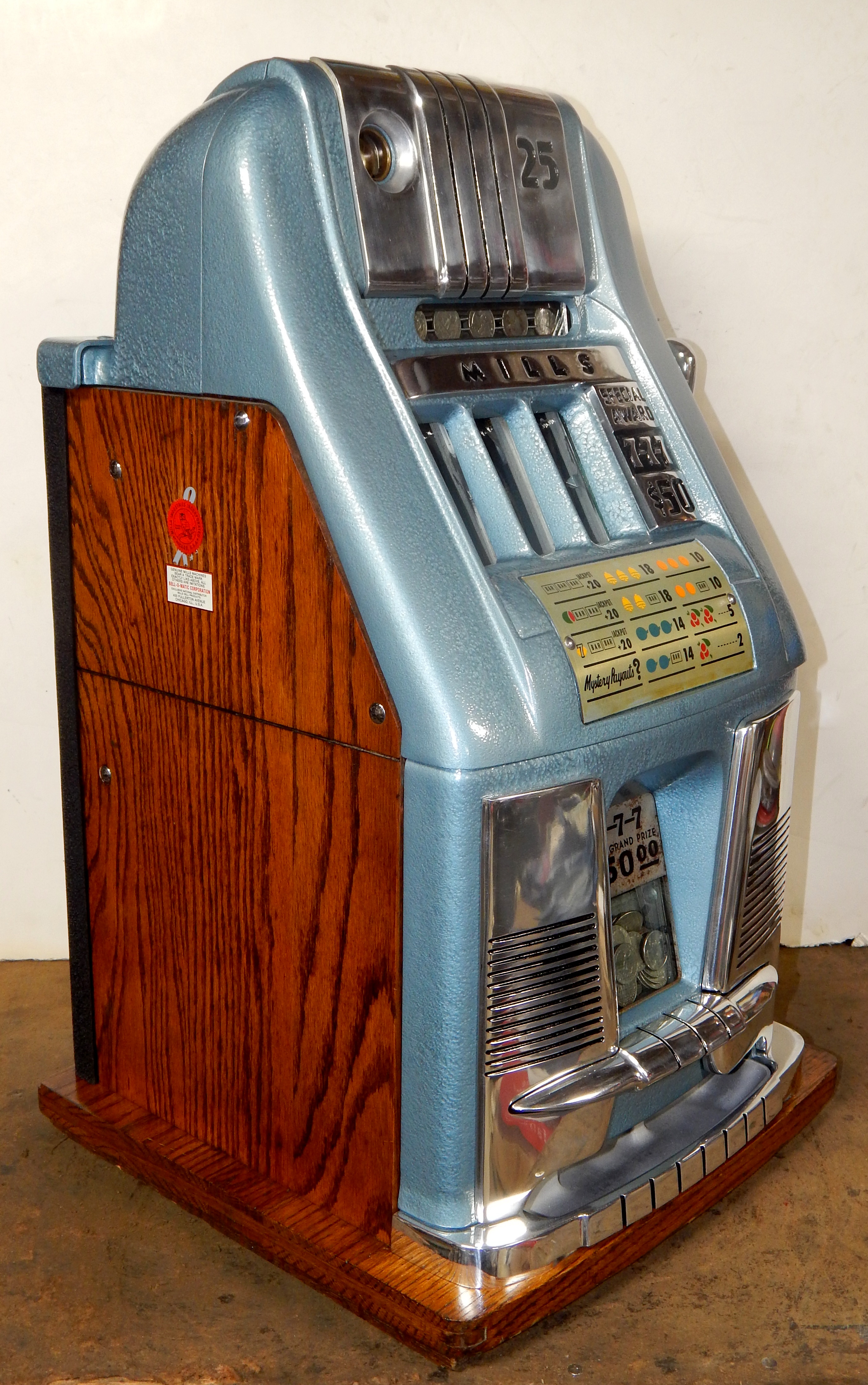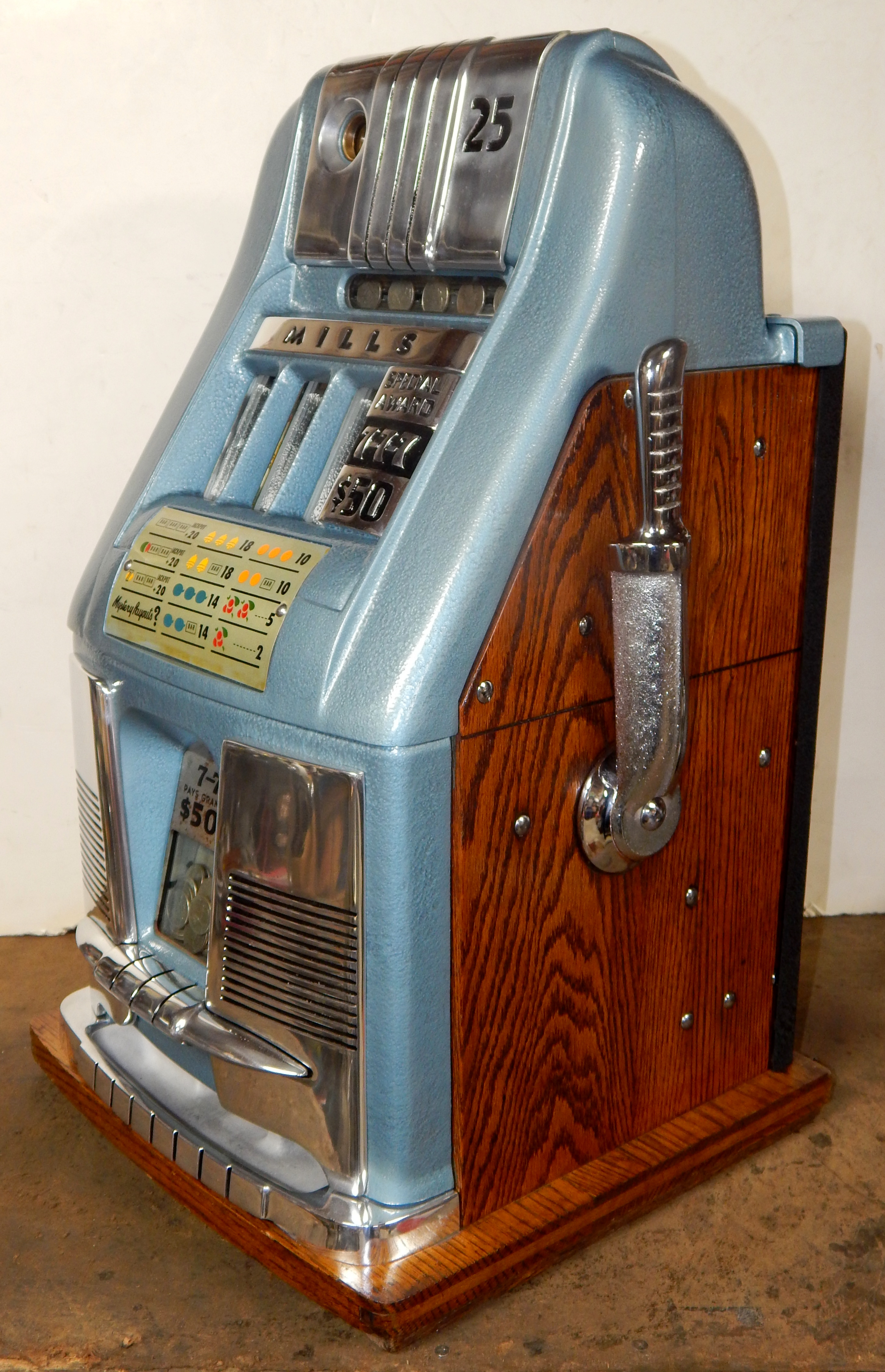 1948 Mills Hi-Top 7-7-7, 25 cent. restored back to original condition. hammertone blue, trimmed in black, cash box, locks with one key. If you are looking for a nice restored machine, here you are. Plays easy and pays as it should. Ready for many years of trouble free service