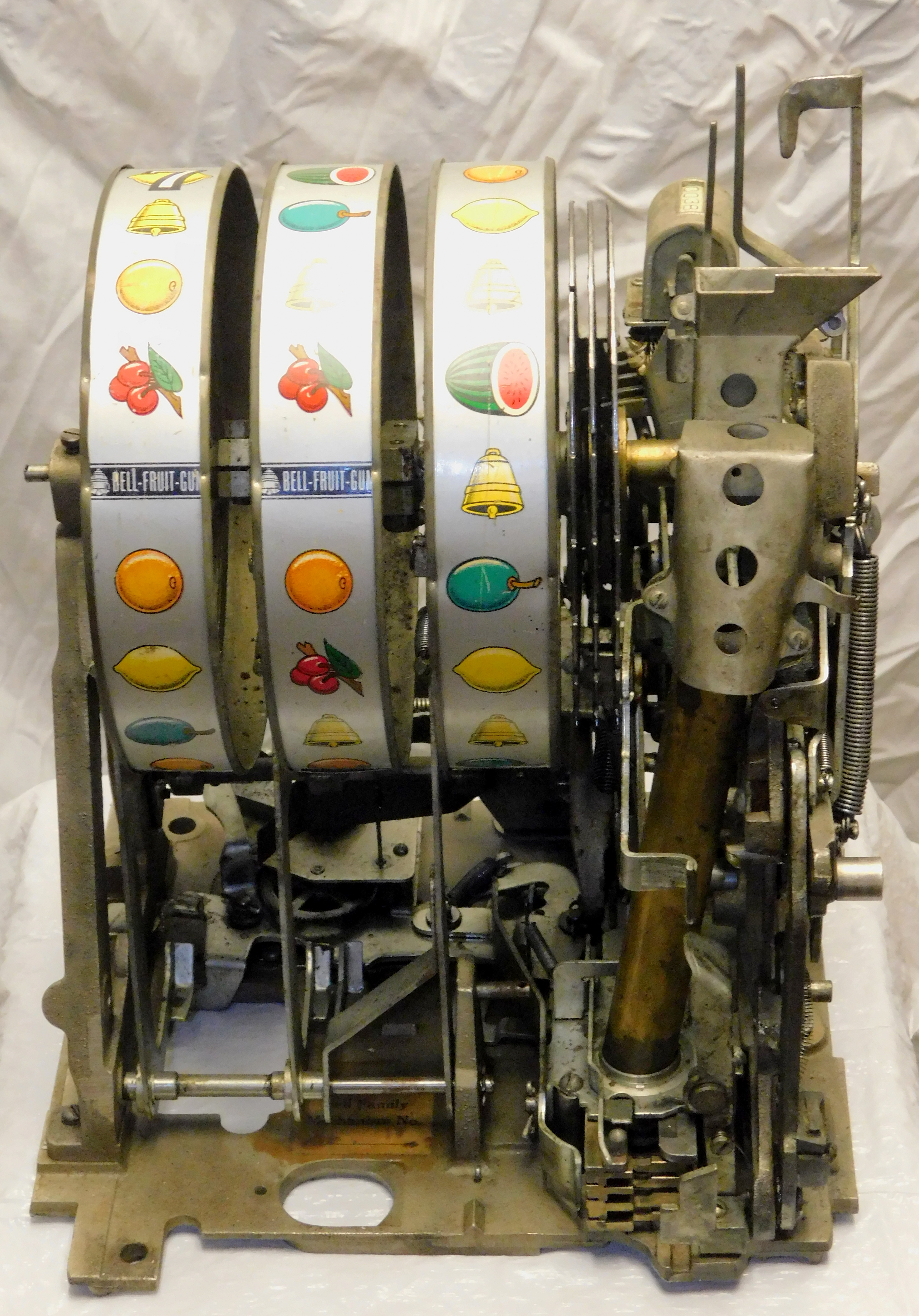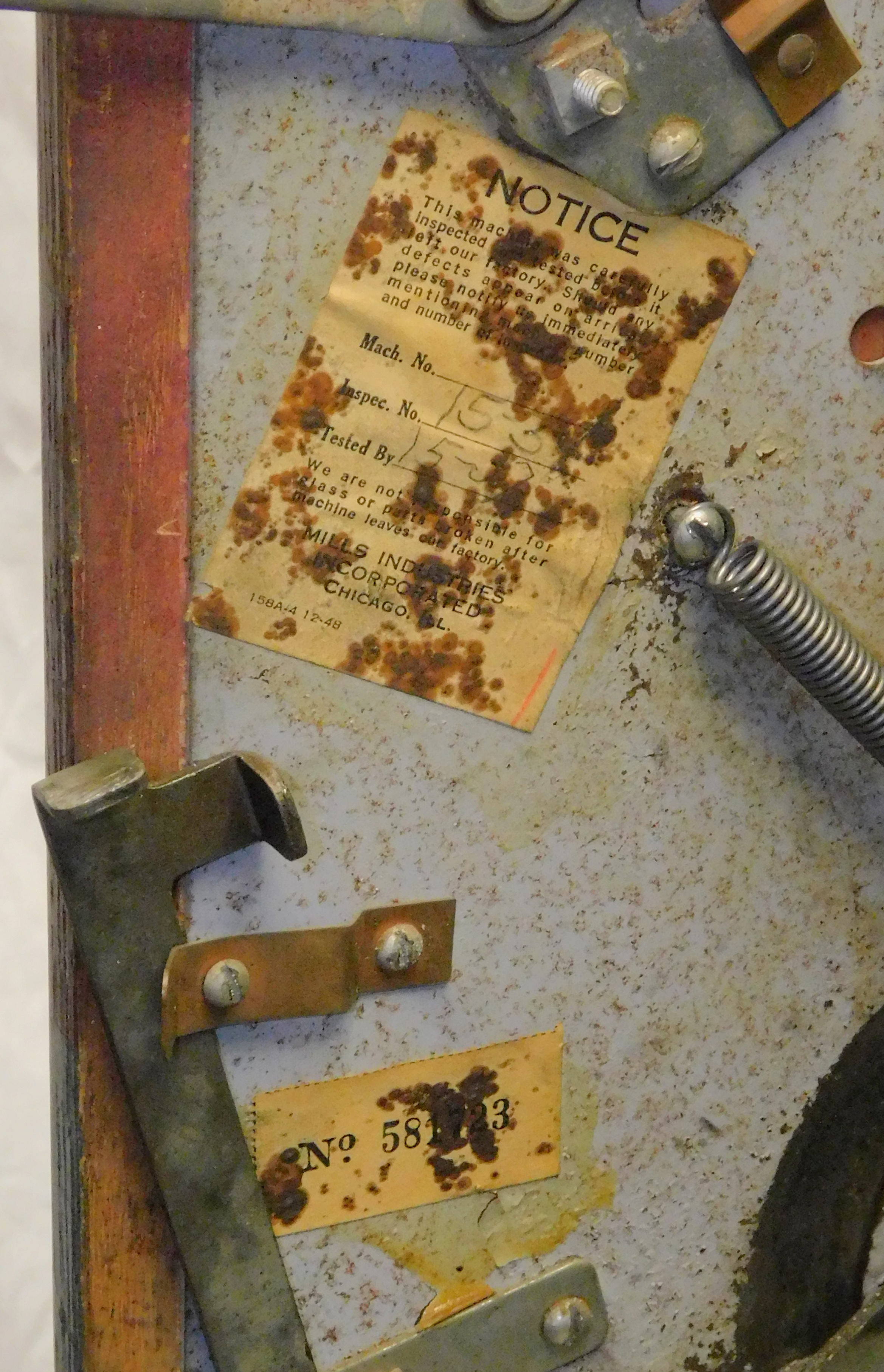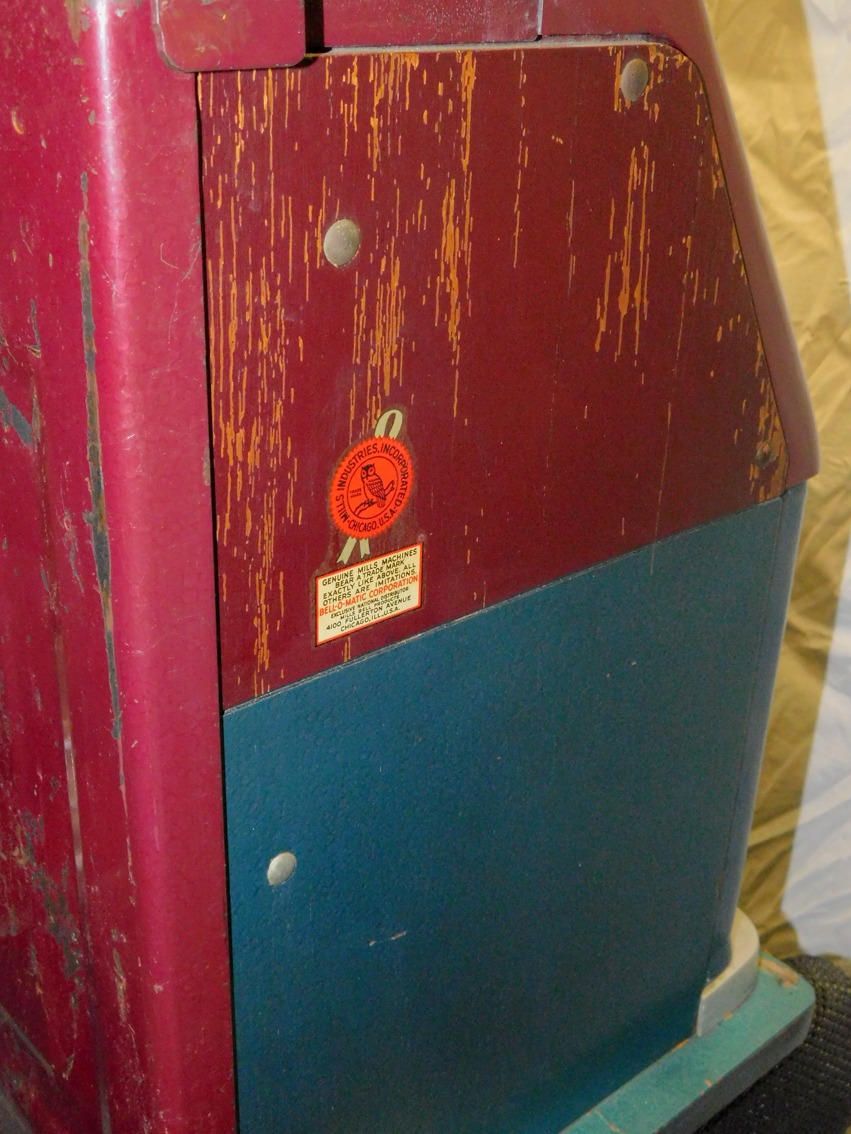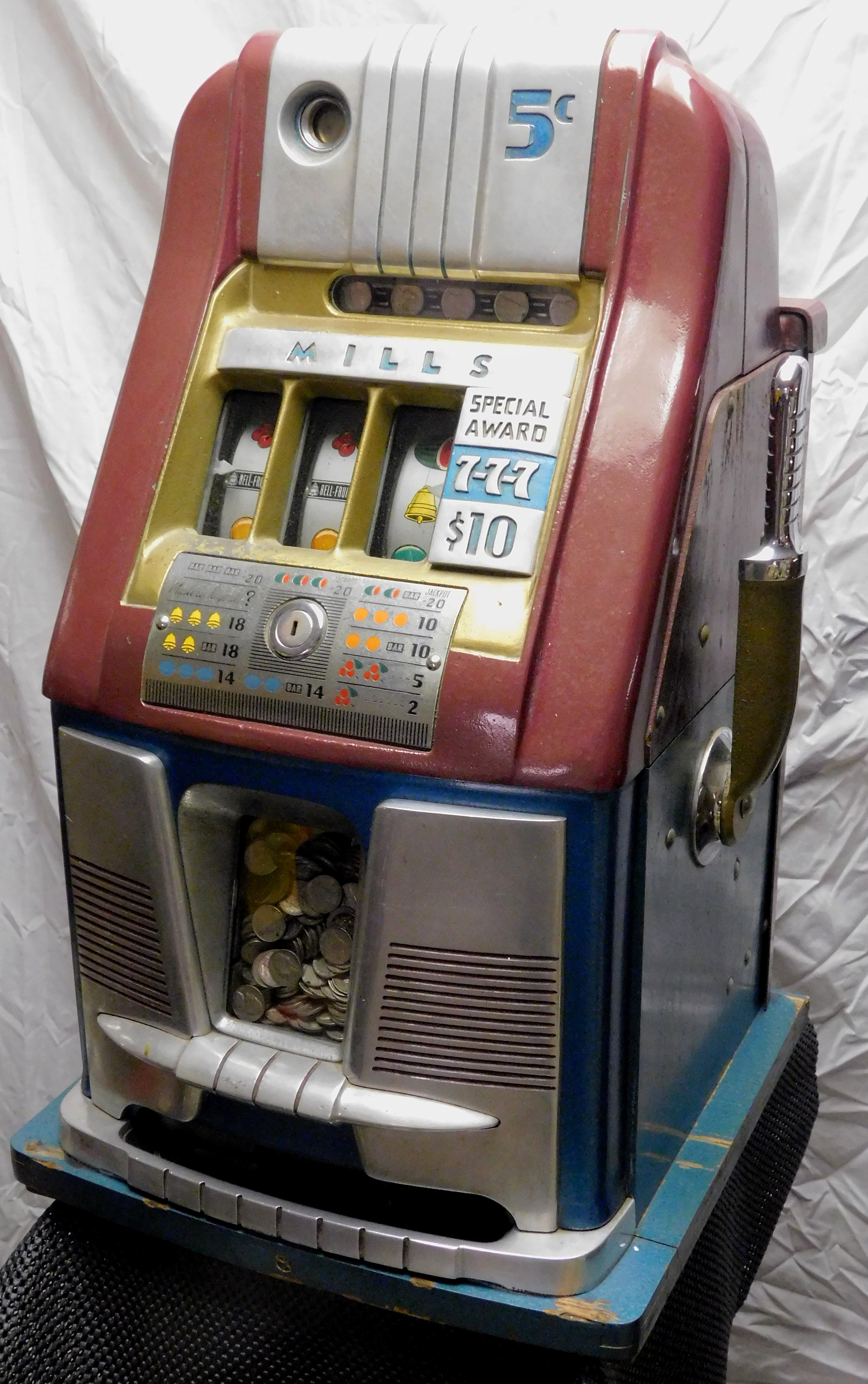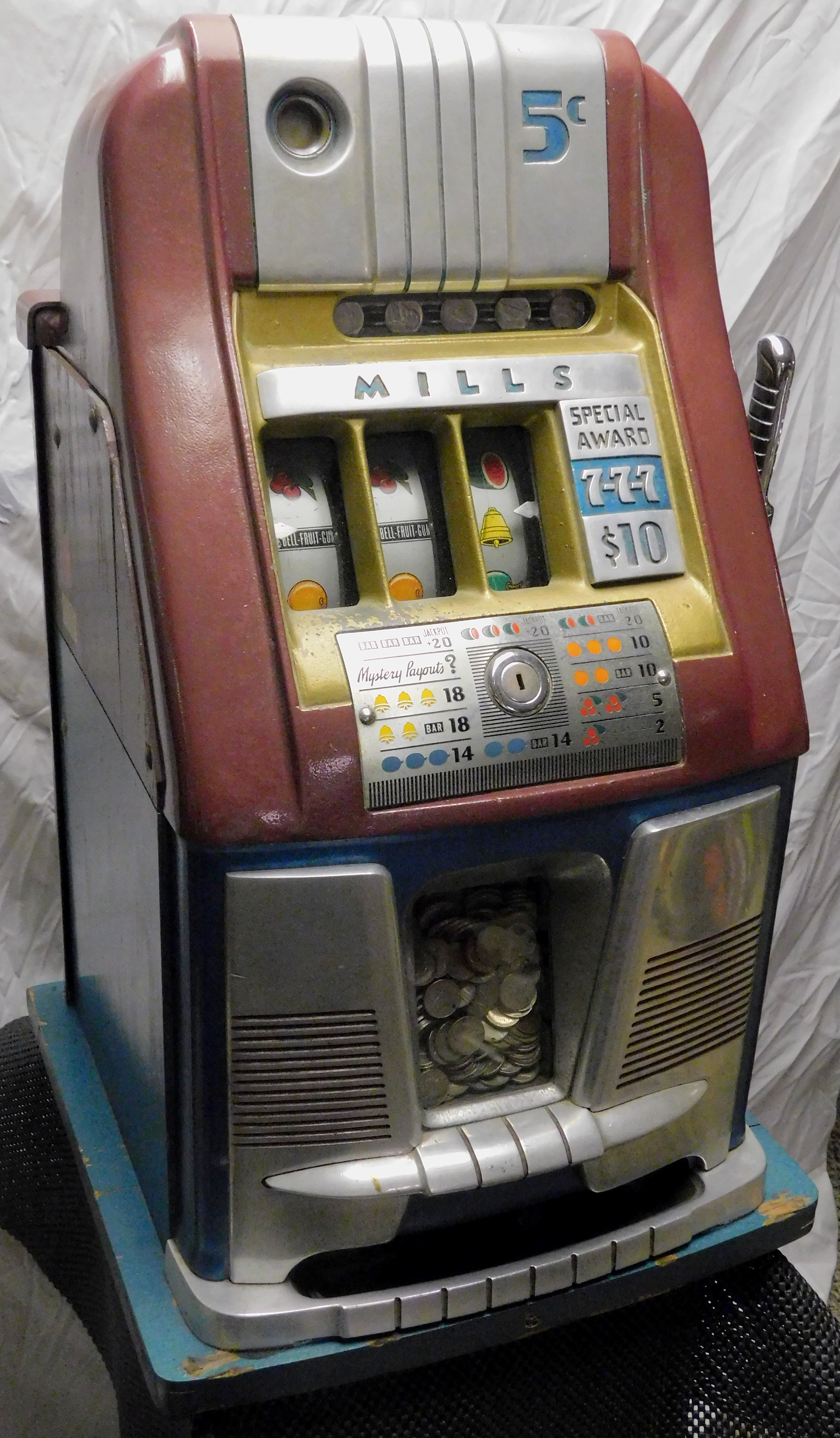 1948 Mills Hi-Top 7-7-7, 5 cent. Very nice original machine not restored, with Jackpot, original cash box, original back door, original reel stripes. 7-7-7 Token vendor with token.