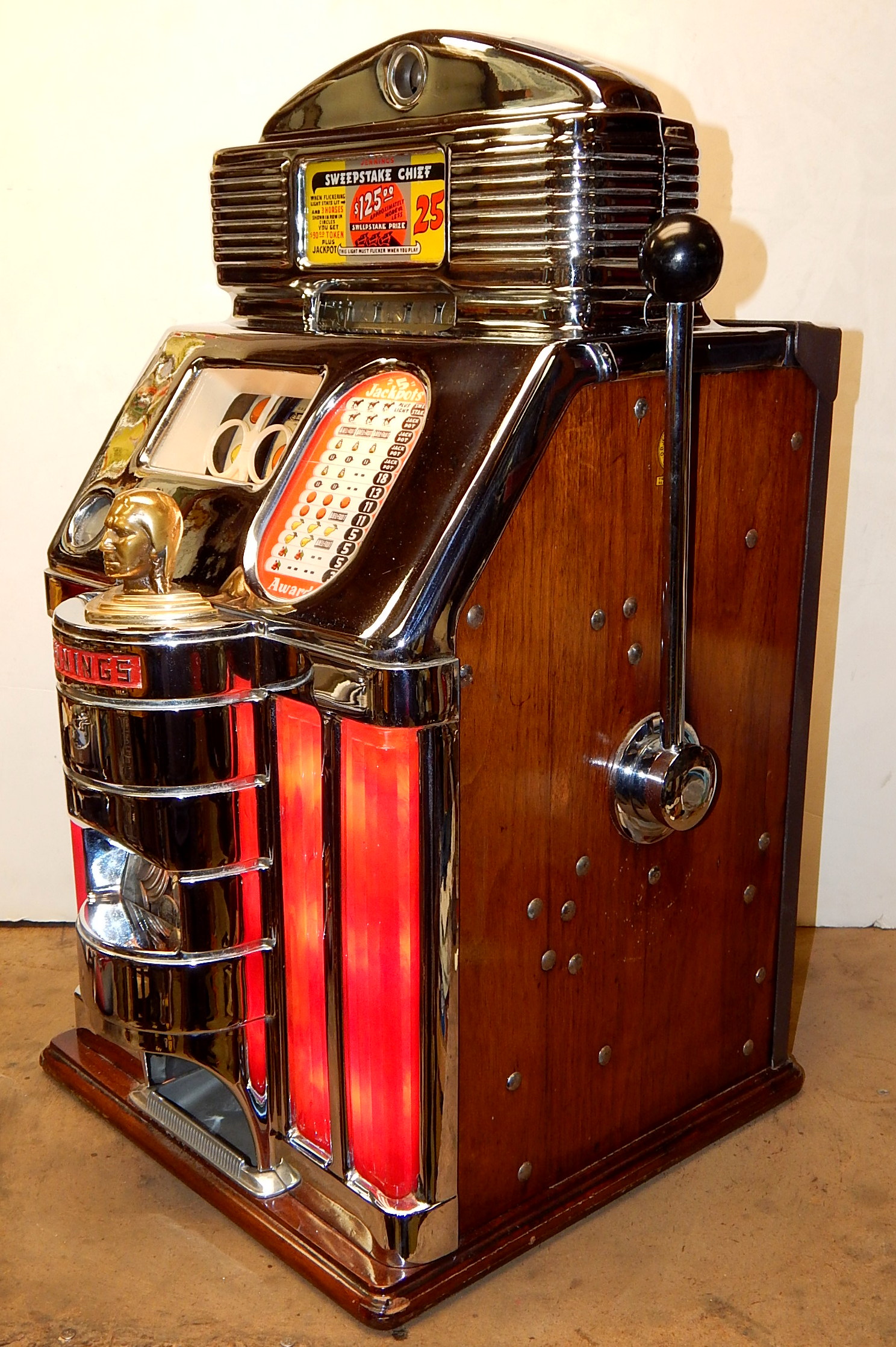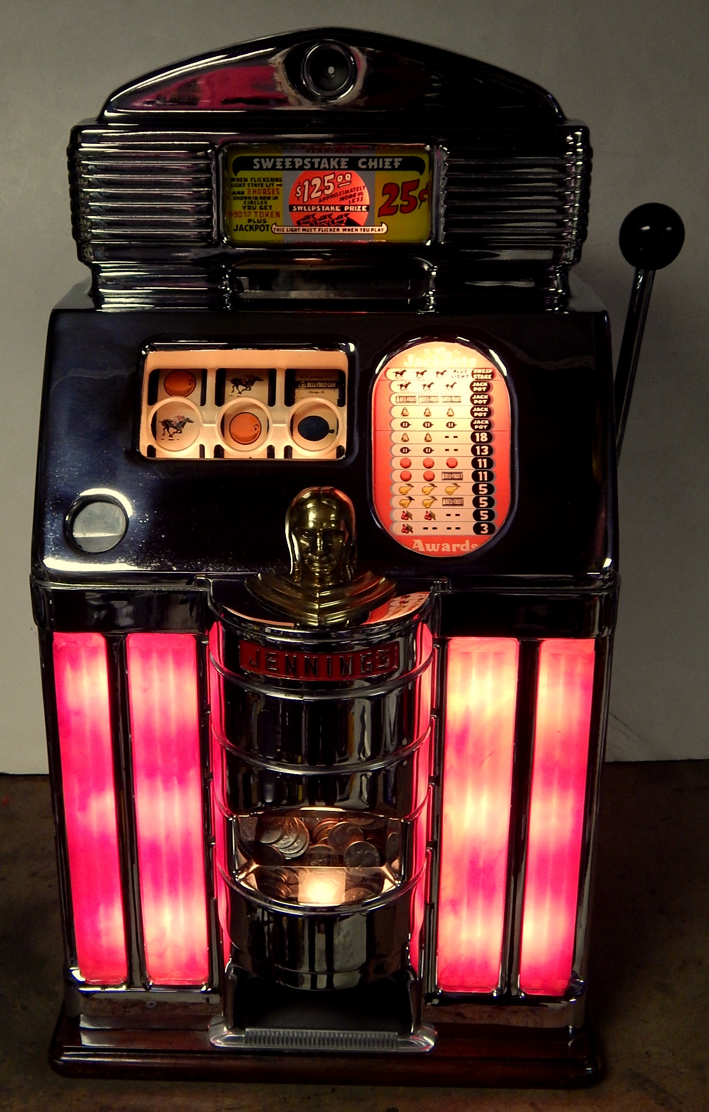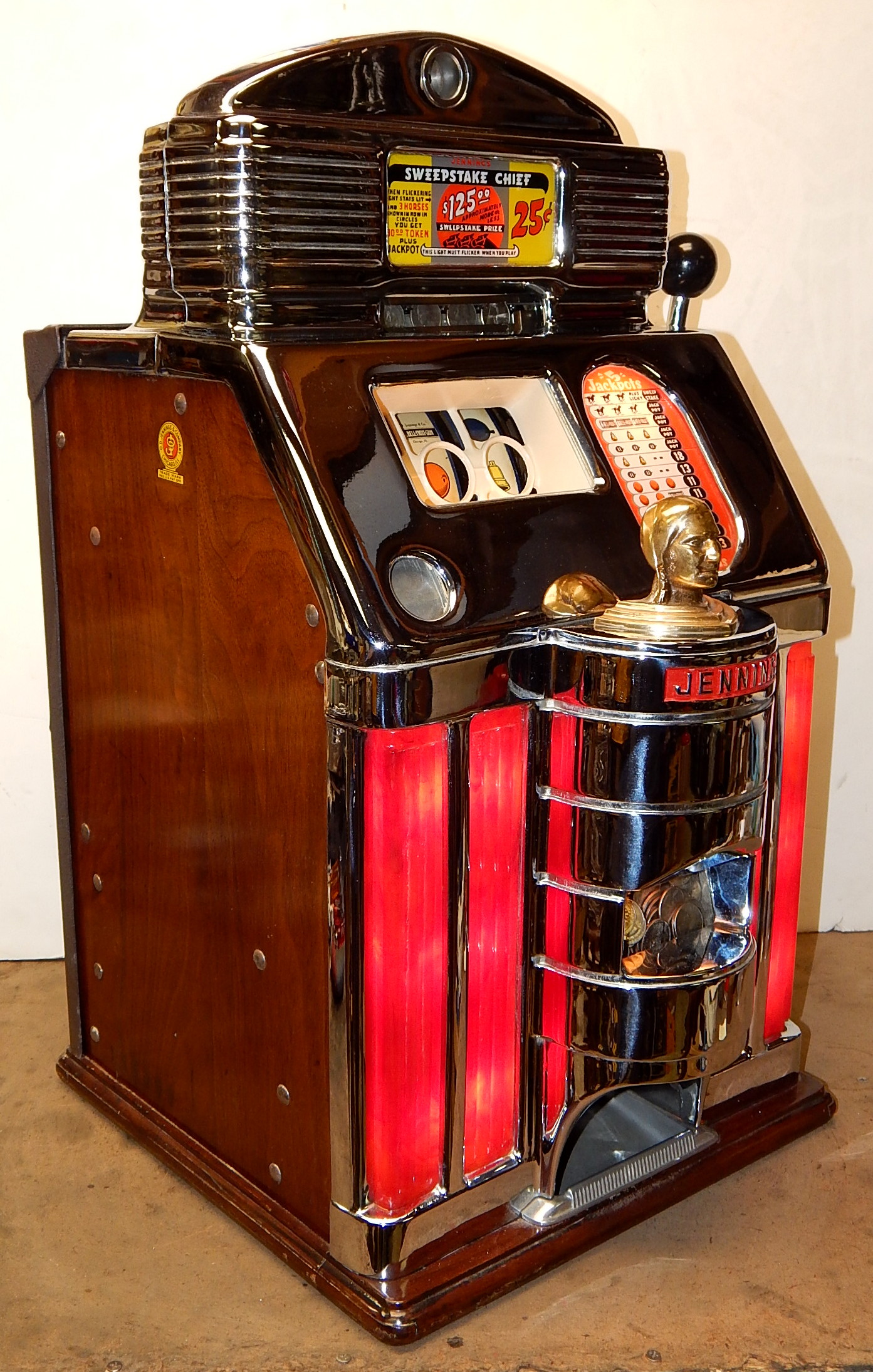1948 Jennings Sweep Stakes Chief (lite-up) 25 cent, Restored with functioning jackpot, token dispenser with tokens, original reel strips, back door with Ace lock, original cash box. Has Red plastic at the bottom. The chrome plating on this machine is 10 out of an 10. The cabinet is beautiful. The machine plays and pays as it should.