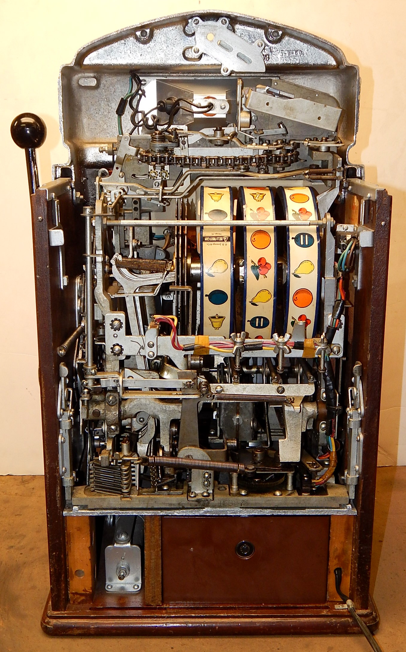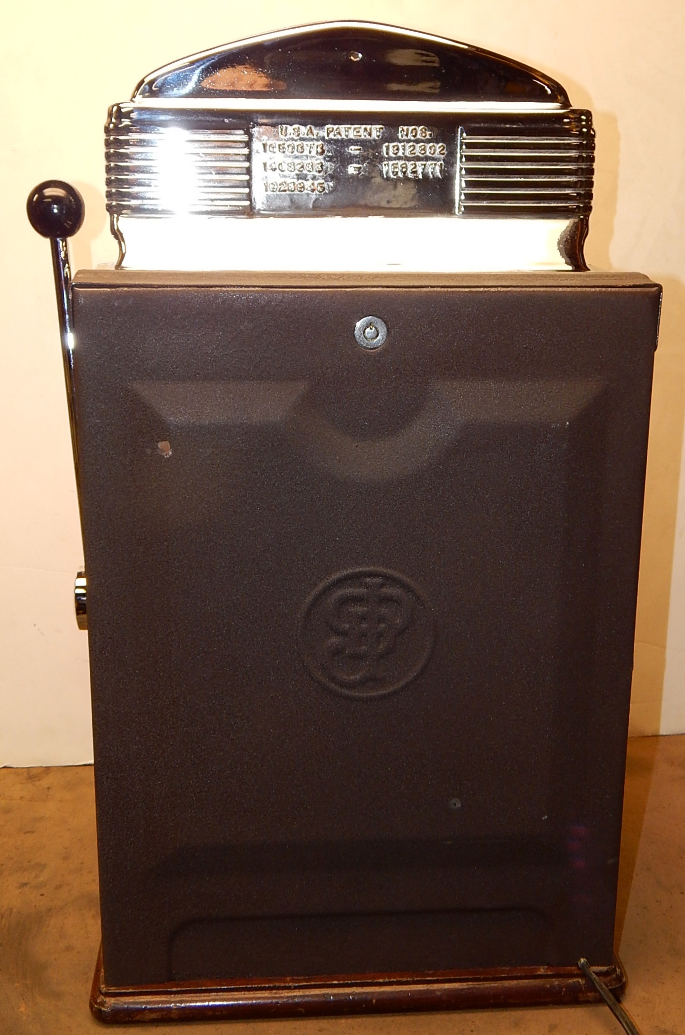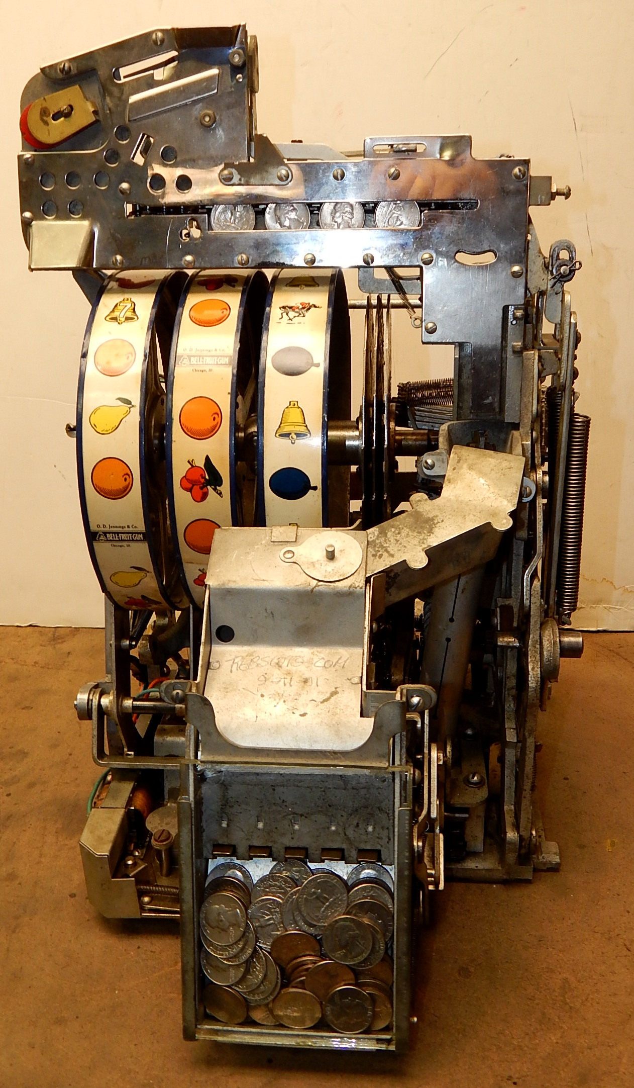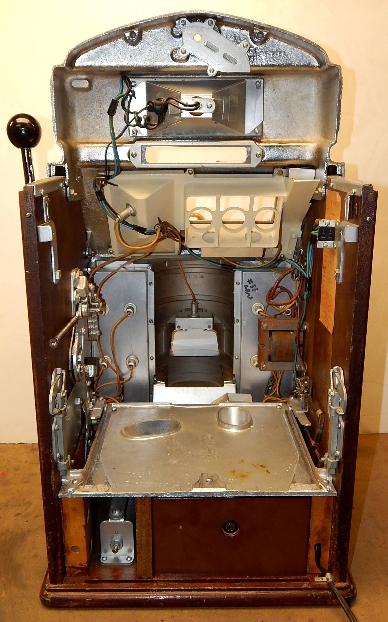 1948 Jennings Sweep Stakes Chief (lite-up) 25 cent, Restored with functioning jackpot, token dispenser with tokens, original reel strips, back door with Ace lock, original cash box. Has Red plastic at the bottom. The chrome plating on this machine is 10 out of an 10. The cabinet is beautiful. The machine plays and pays as it should.