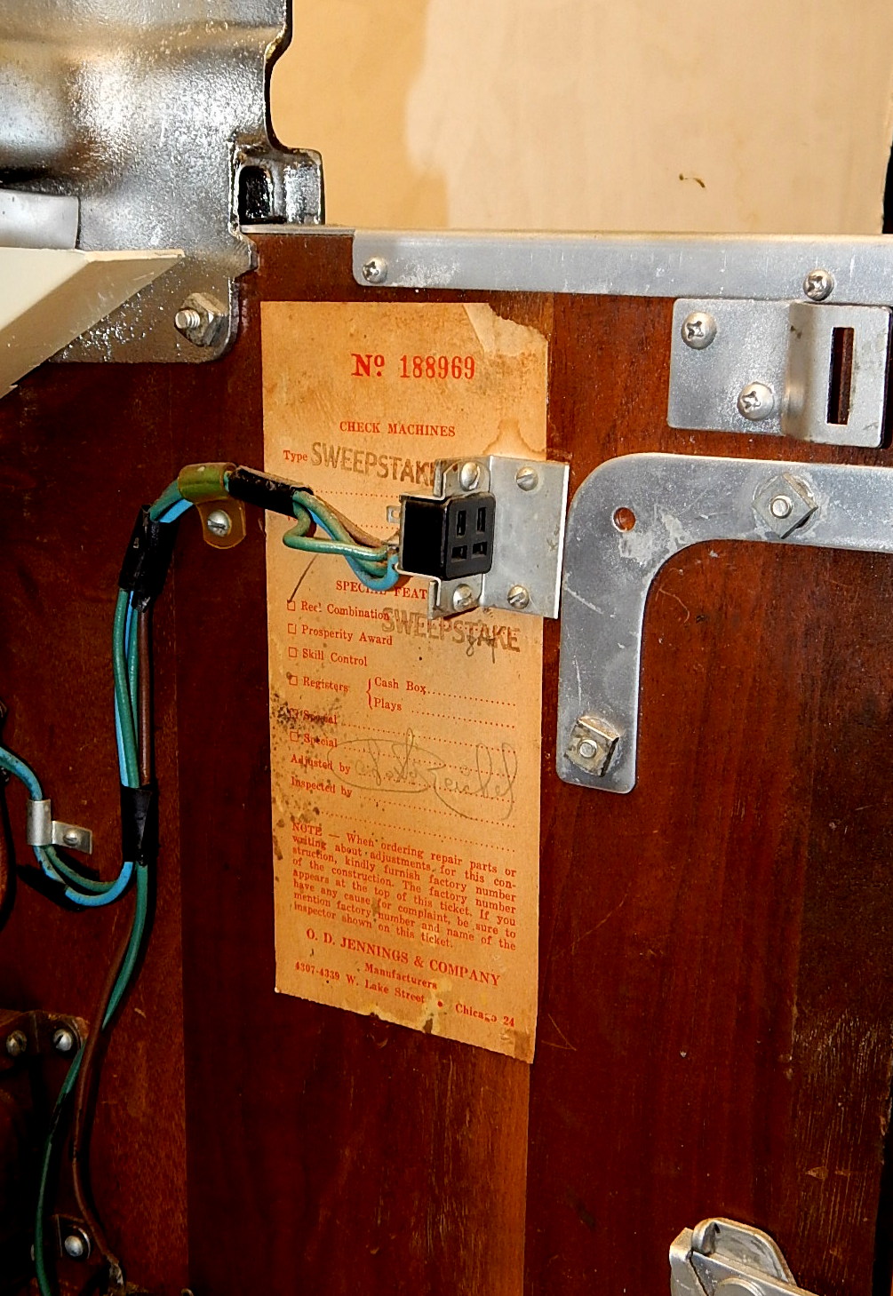 A little about the Jennings Sweep Stakes Chief. It has all the same pay outs as a Sun Chief. However, this machine also has Plums with 11's on them- 3 of these is a Jackpot. It has Bells with 7's on them-3 of these is a Jackpot. It has 5 different jackpot symbols instead of one. Has a 89% payout percentage. Hit three horses with a permanent RED light and win a $125.00 token and jackpot $25.00 more or less. The Jennings Sweep Stakes is a little like the Jennings Prospector, it has a flashing RED light when you play, if it hits three horses on the pay line and the RED light stays on, you win the big jackpot. More fun to play.