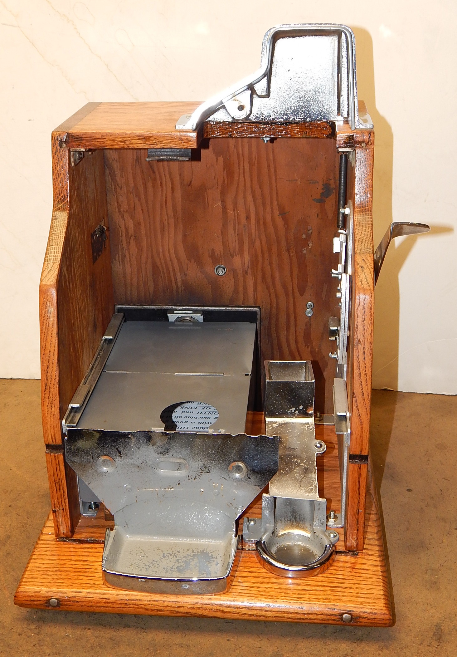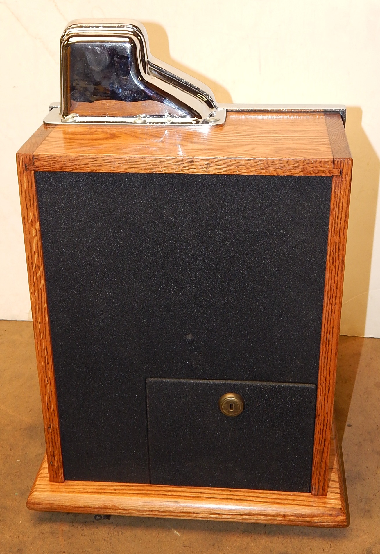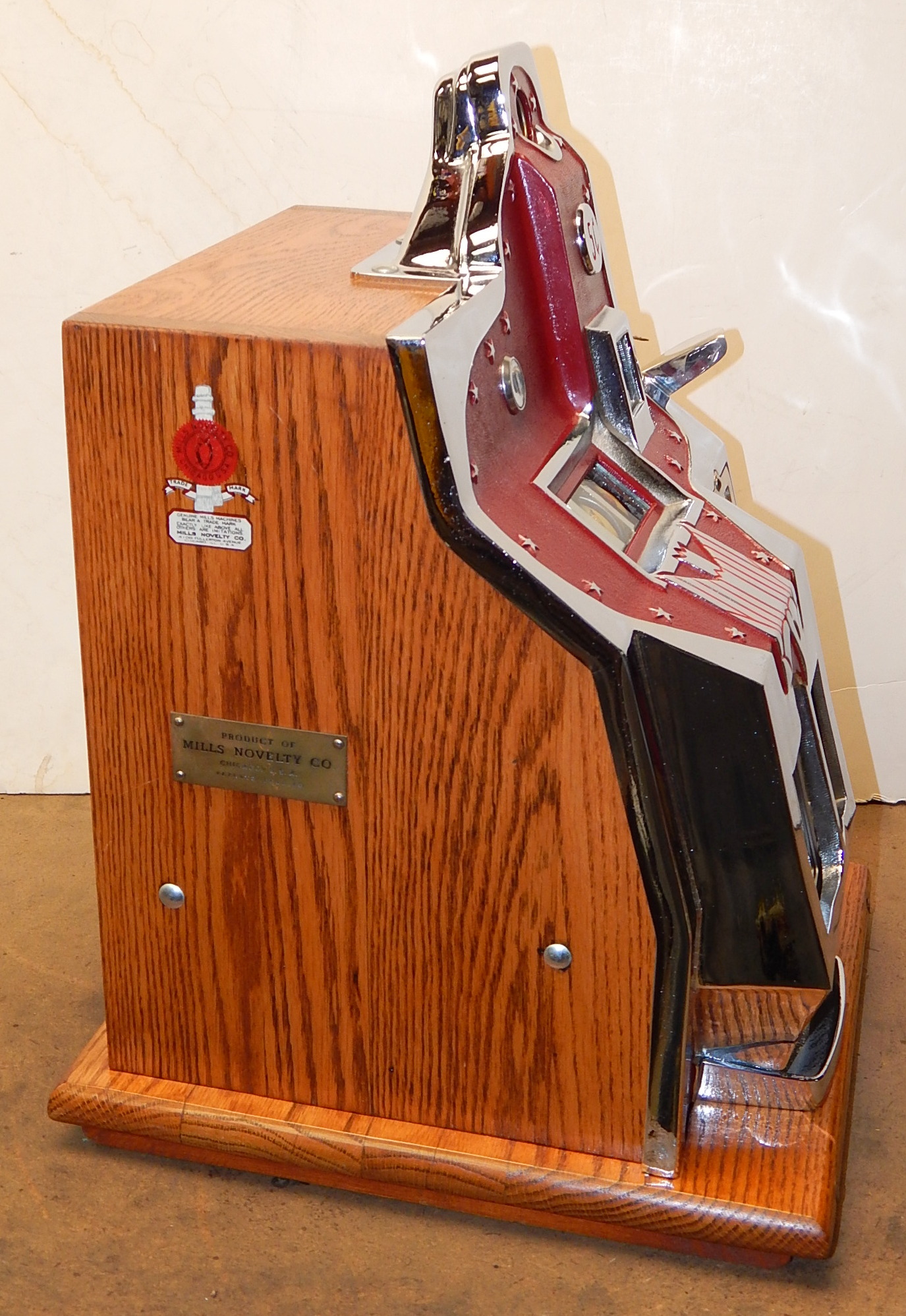 1934 Mills QT "Firebird" Nickel. This is a very nice chrome plated retored machine "older restoration" 9.9 out of a 10 Maroon in color. Twin Jackpots, original back door, cash box, award card, very nice oak cabinet. Original Mills locks front and back with Mills keys. Plays very easy.