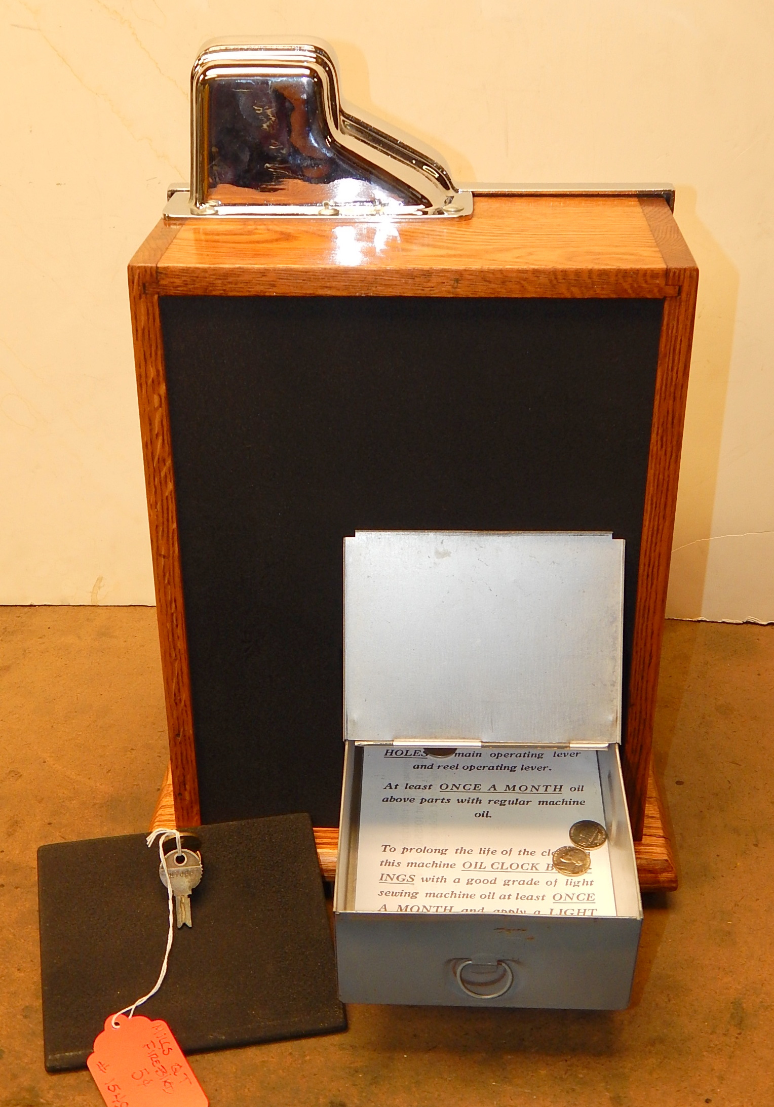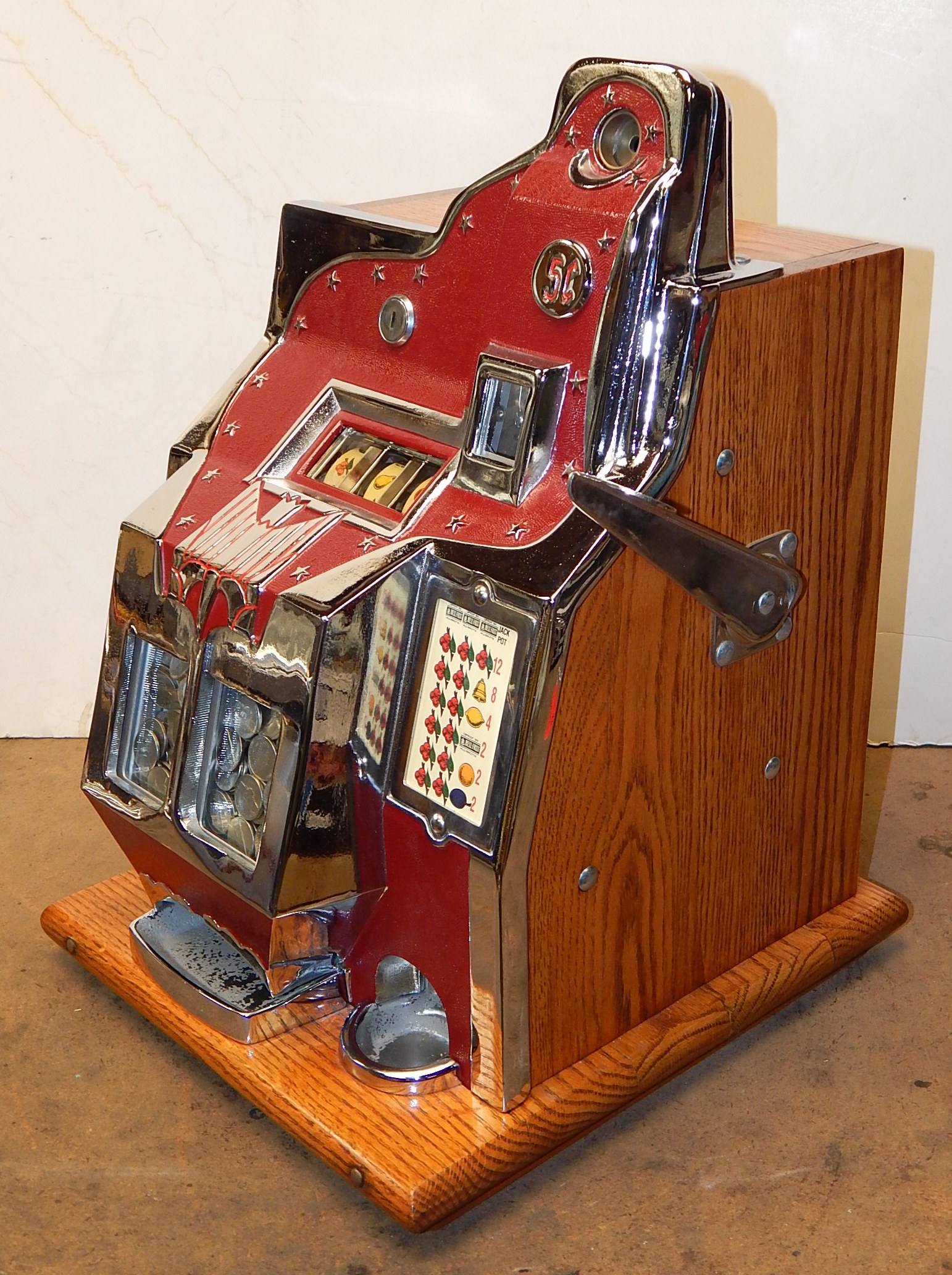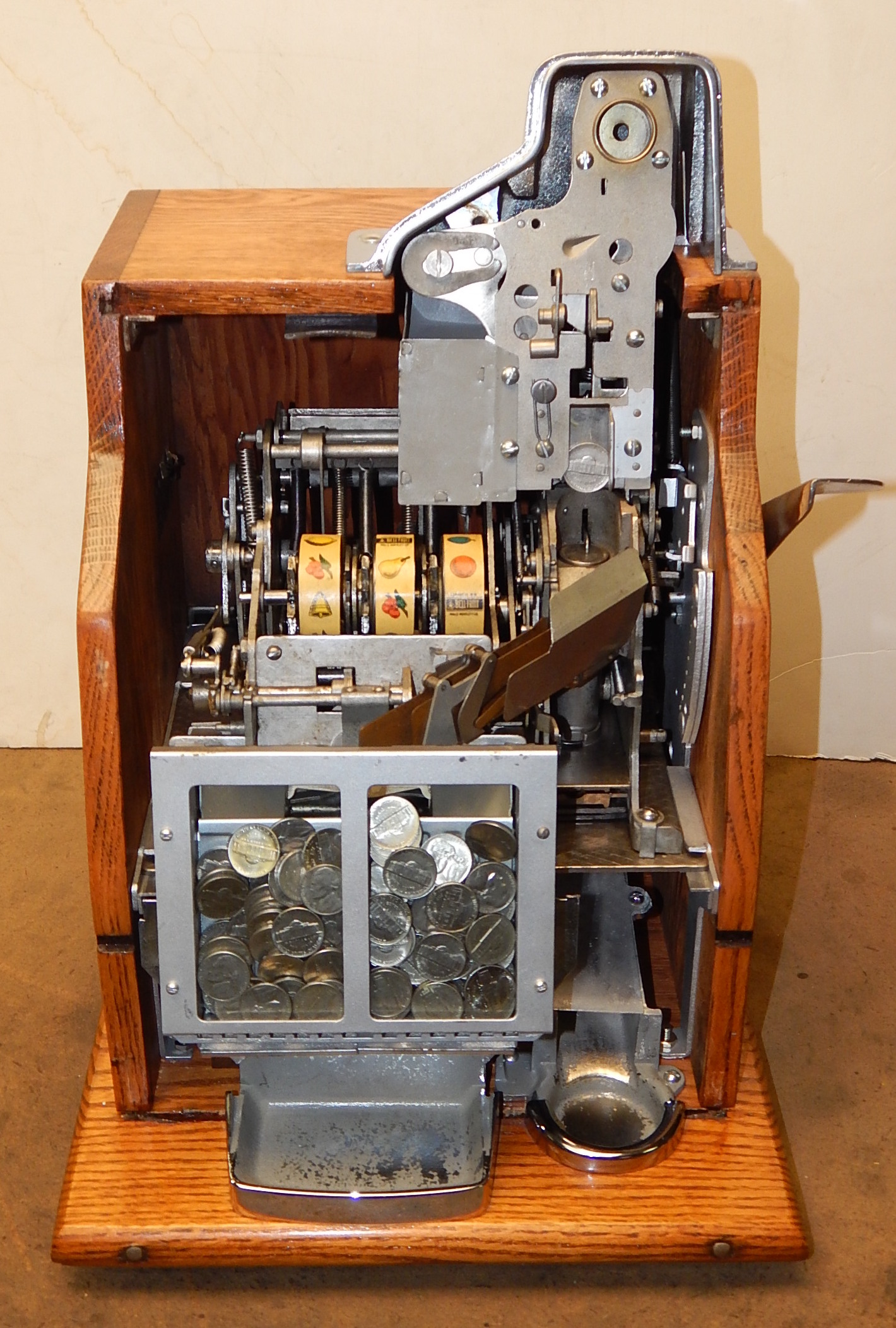 1934 Mills QT "Firebird" Nickel. This is a very nice chrome plated retored machine "older restoration" 9.9 out of a 10 Maroon in color. Twin Jackpots, original back door, cash box, award card, very nice oak cabinet. Original Mills locks front and back with Mills keys. Plays very easy.