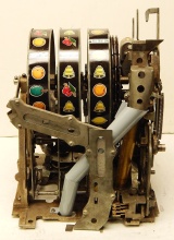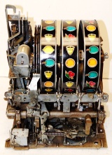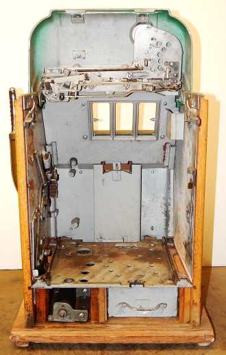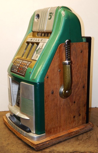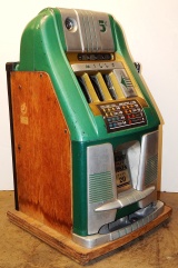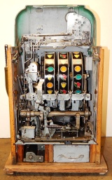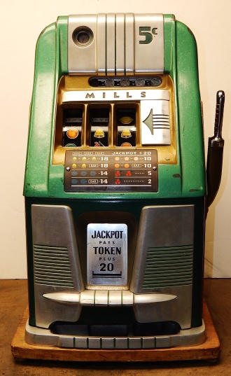 1950 Mills Jackpot Token Bell 5 cent, in original condition, not restored. Original reel strips in mint condition. Original back door with original Mills lock and key. Original cashbox. Machine comes with original Jackpot tokens. Plays very easy, pays as it should. Cleaned, lube and adjusted. Ready for many years of trouble free play.