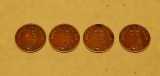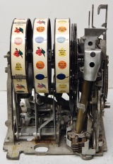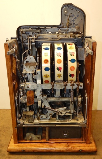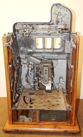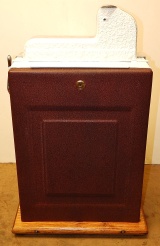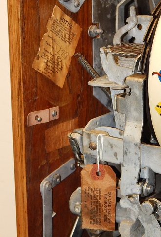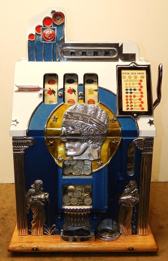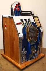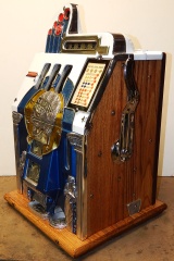1935 Mills Roman Head, 5 cent. Restored, blue and white trimmed in red. This unit has Gold Award with 4 original gold ward tokens. Jackpot with reserve, Mint condition original fortune reel strips, original back door with original numbers matching key, original cash box, original mint condition oak cabinet. All the paper work is still present on the inside of the cabinet. Also some you don't see mush, the Jackpot load instruction tag. Plays very easy.