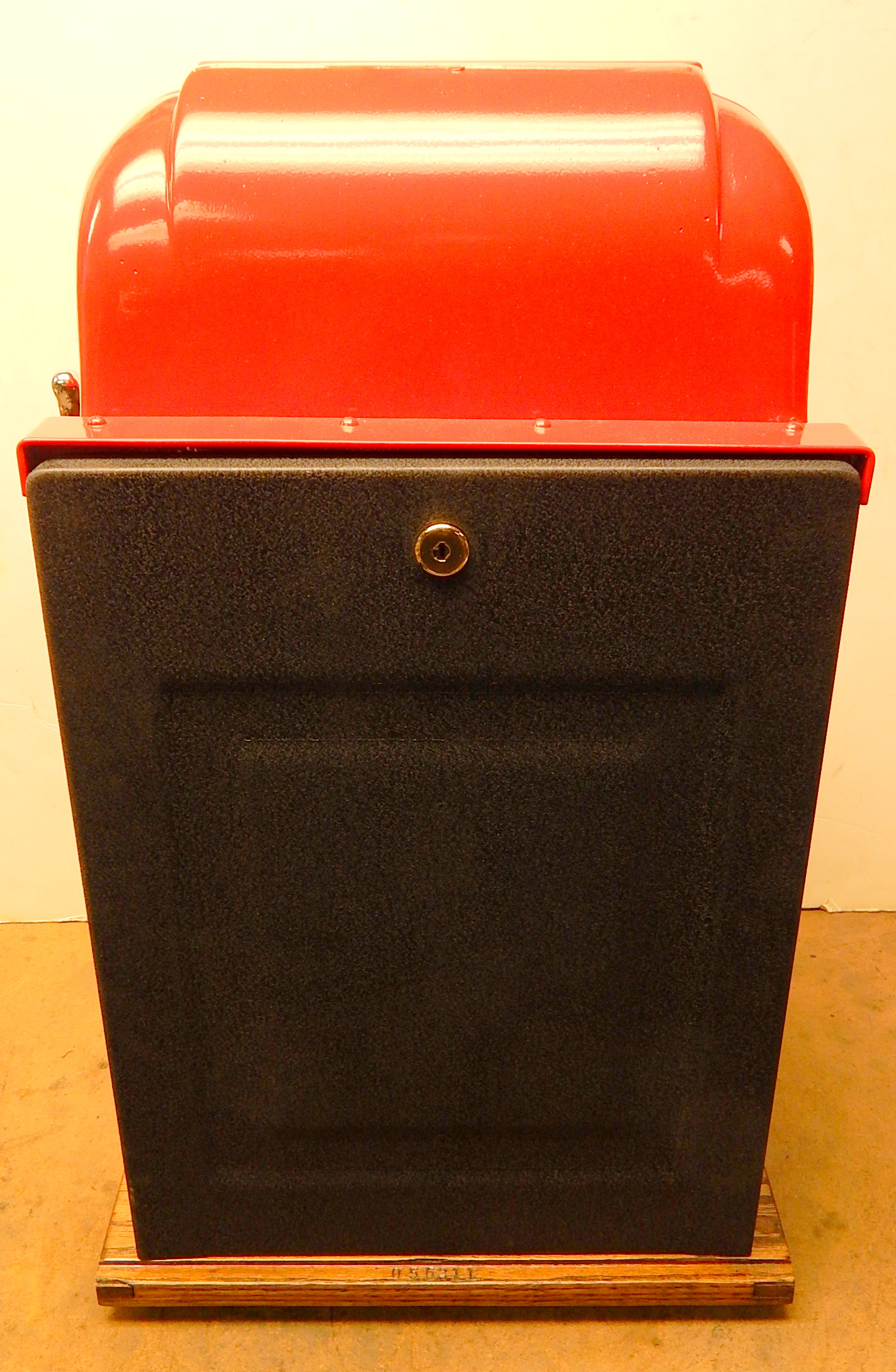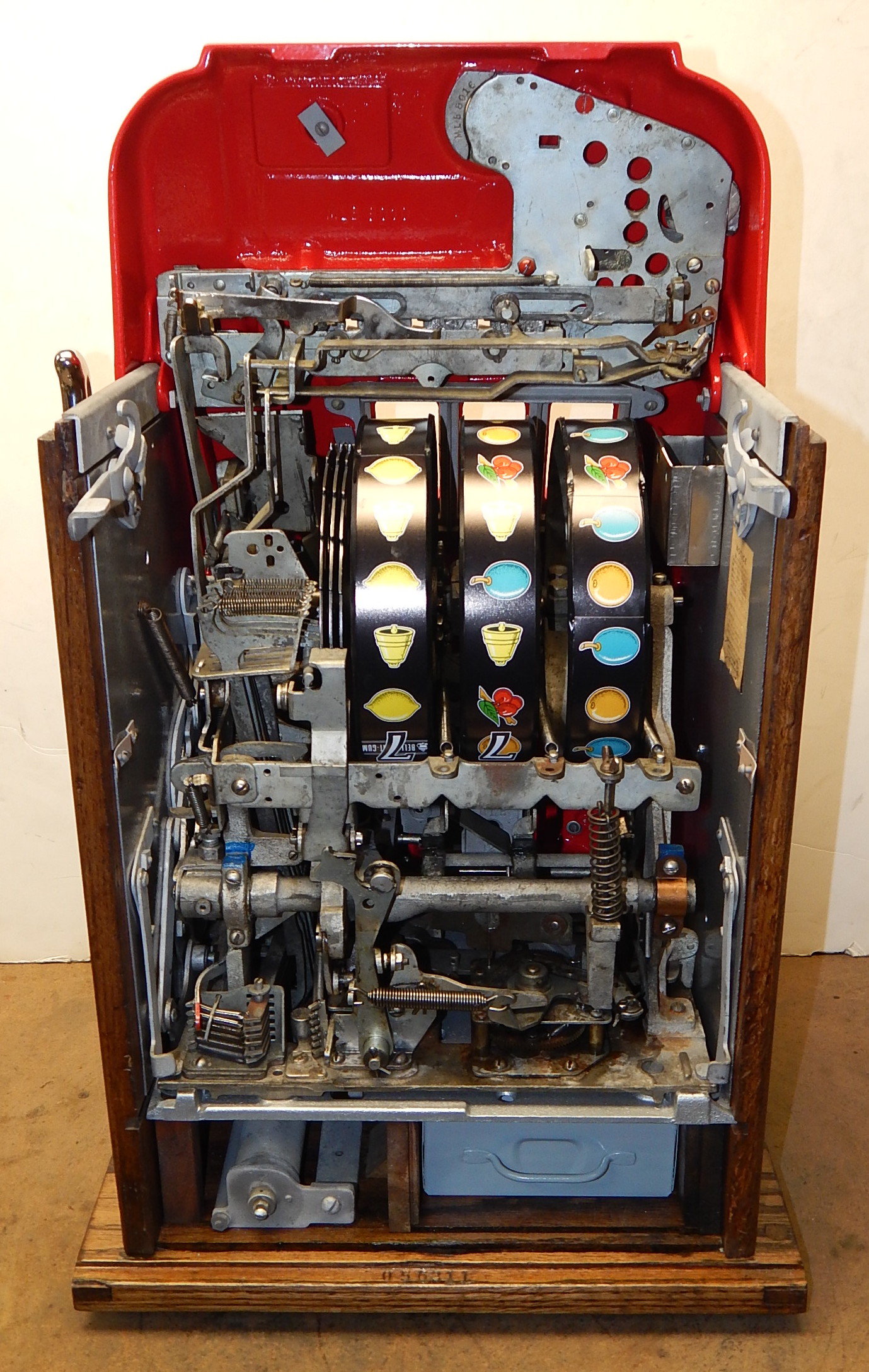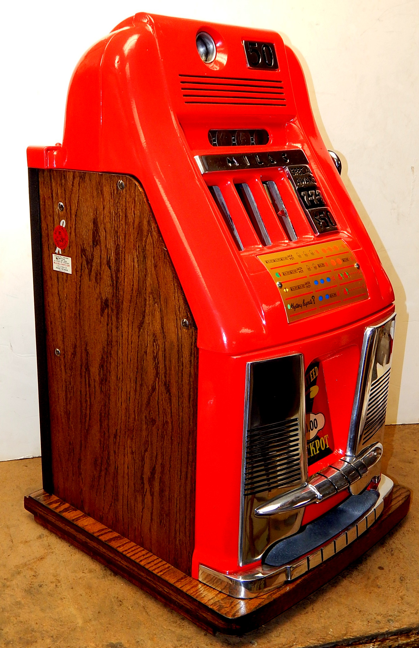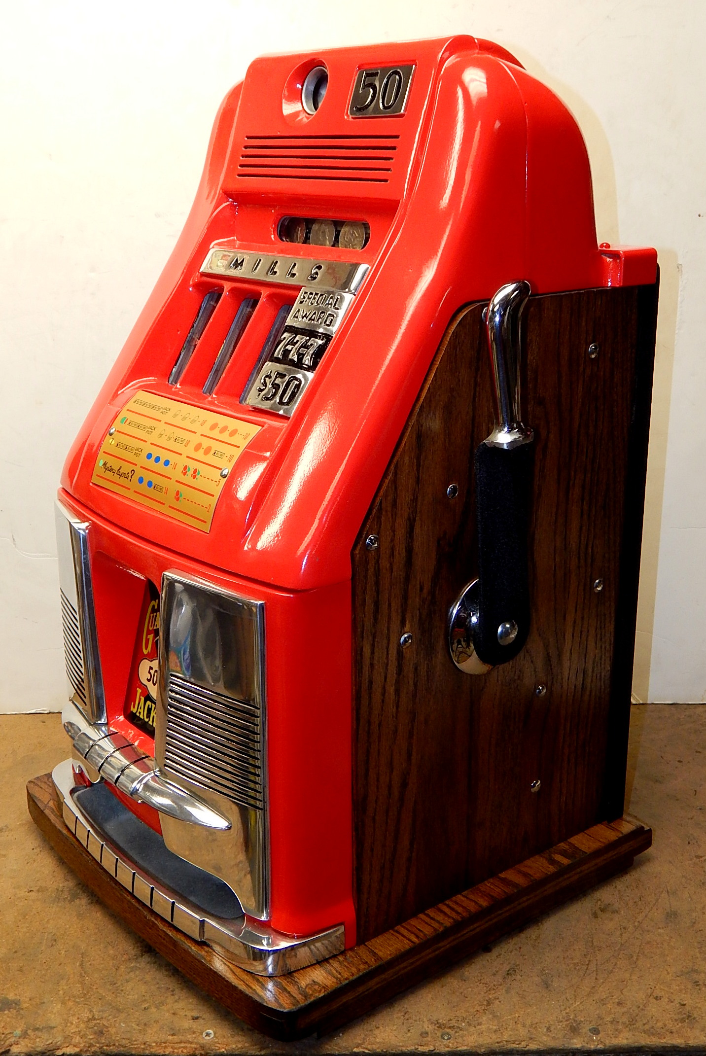 Mills 1960 "7-7-7" Hi-Top 50 cent, This is a very nice hard too find large coin machine restored. Casting powder coated gloss red, trimmed in black. The trim on this machine has been polish to add to this beautiful machine. New award card, original back door with Mills lock, new cash box, black reel strips. Plays very easy.