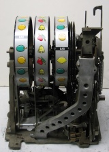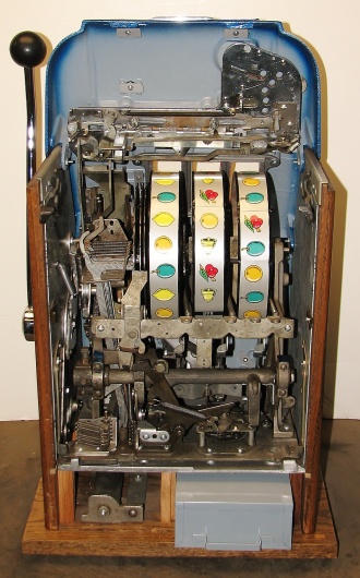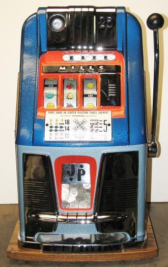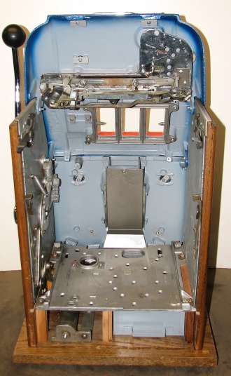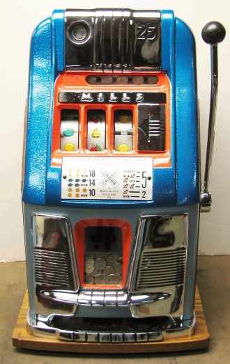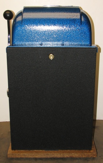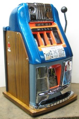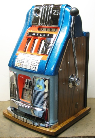 Mills 1951 Criss Cross Hi-Top 25 cent. When we received this machine it was an older restoration with some bad chips in the paint. So we decided to re-paint the casting hammer tone Dark Blue, with Hammer tone Light Blue, trimed in Orange. New back door, new cash box. Very nice oak cabinet with gold leaf. Very nice Criss Cross award card, club handle, NO JACKPOT. All the trim on this machine was chrome plated by the previous owner. Plays very easy and pays as it should. 2-5 pay out.