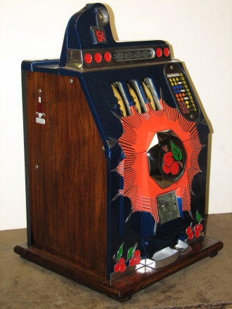 Mills 1937 Bursting Cherry . This is a very nice machine restored, Blue and Orange, with red and green trim colors. Original mint condition award card, Jack pot with reserve, original back door and lock with one key, original cash box. Plays very easy,  3-5 payout.