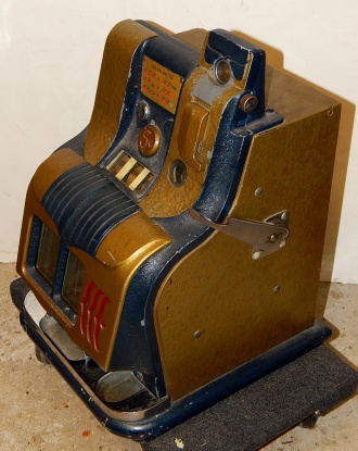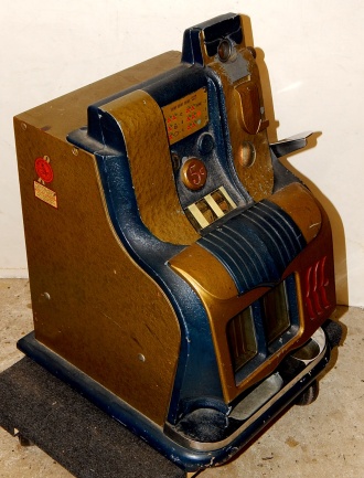 Mills 1947 QT "Chevron" 5 cent. This is a very nice machine in original condition Blue and gold in color. Twin Jackpots, original cash box, original award card, original locks. Plays very easy.
