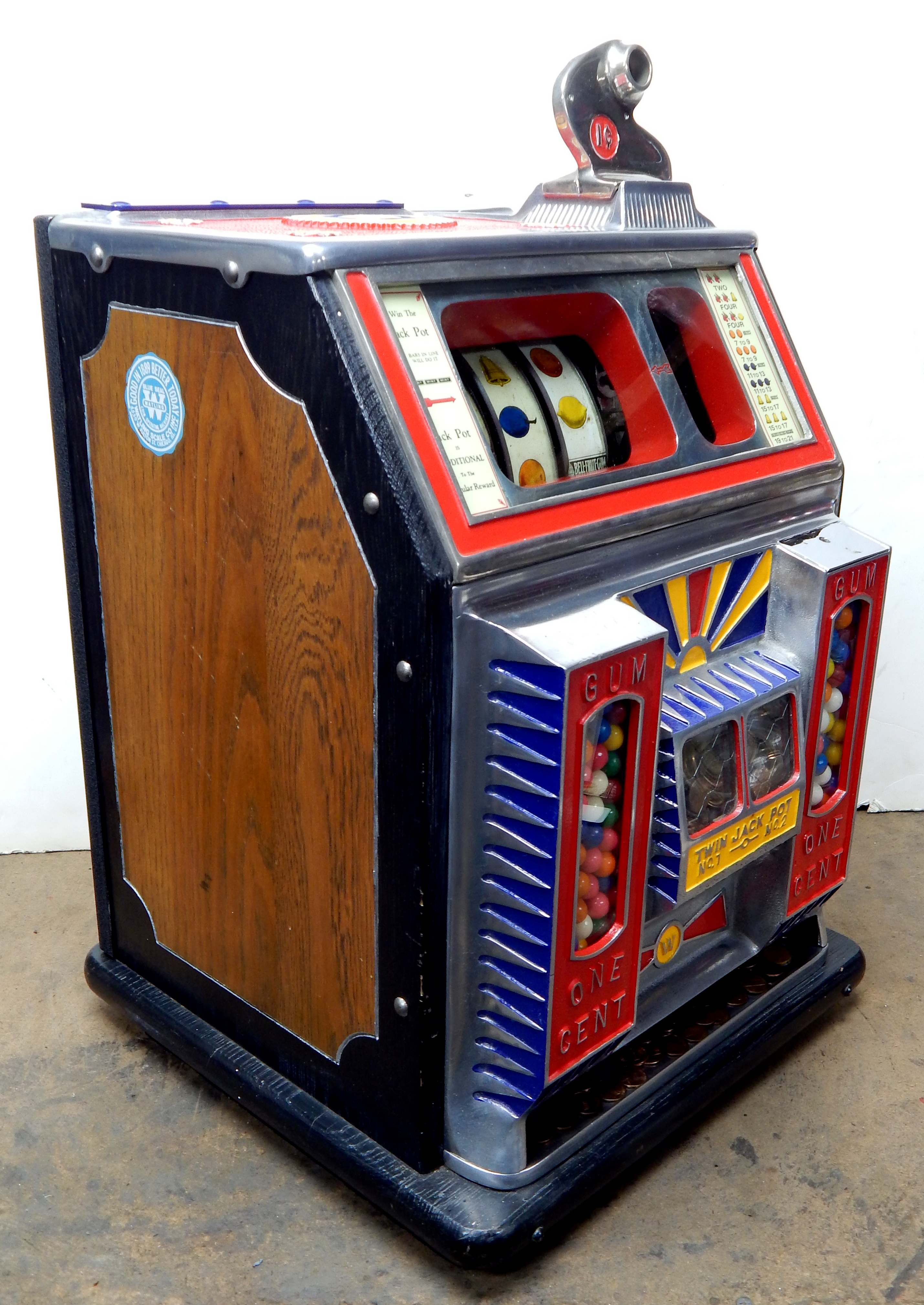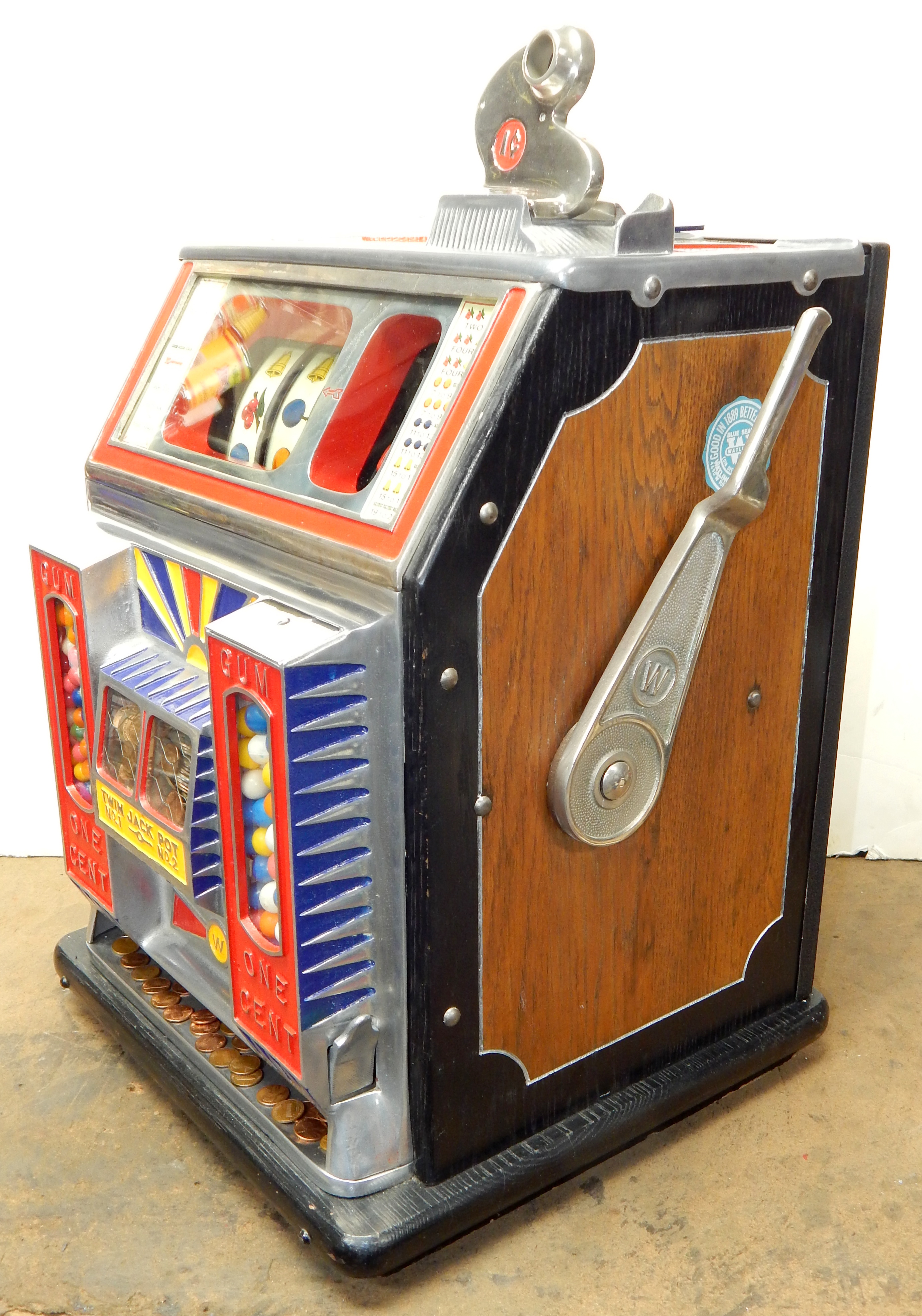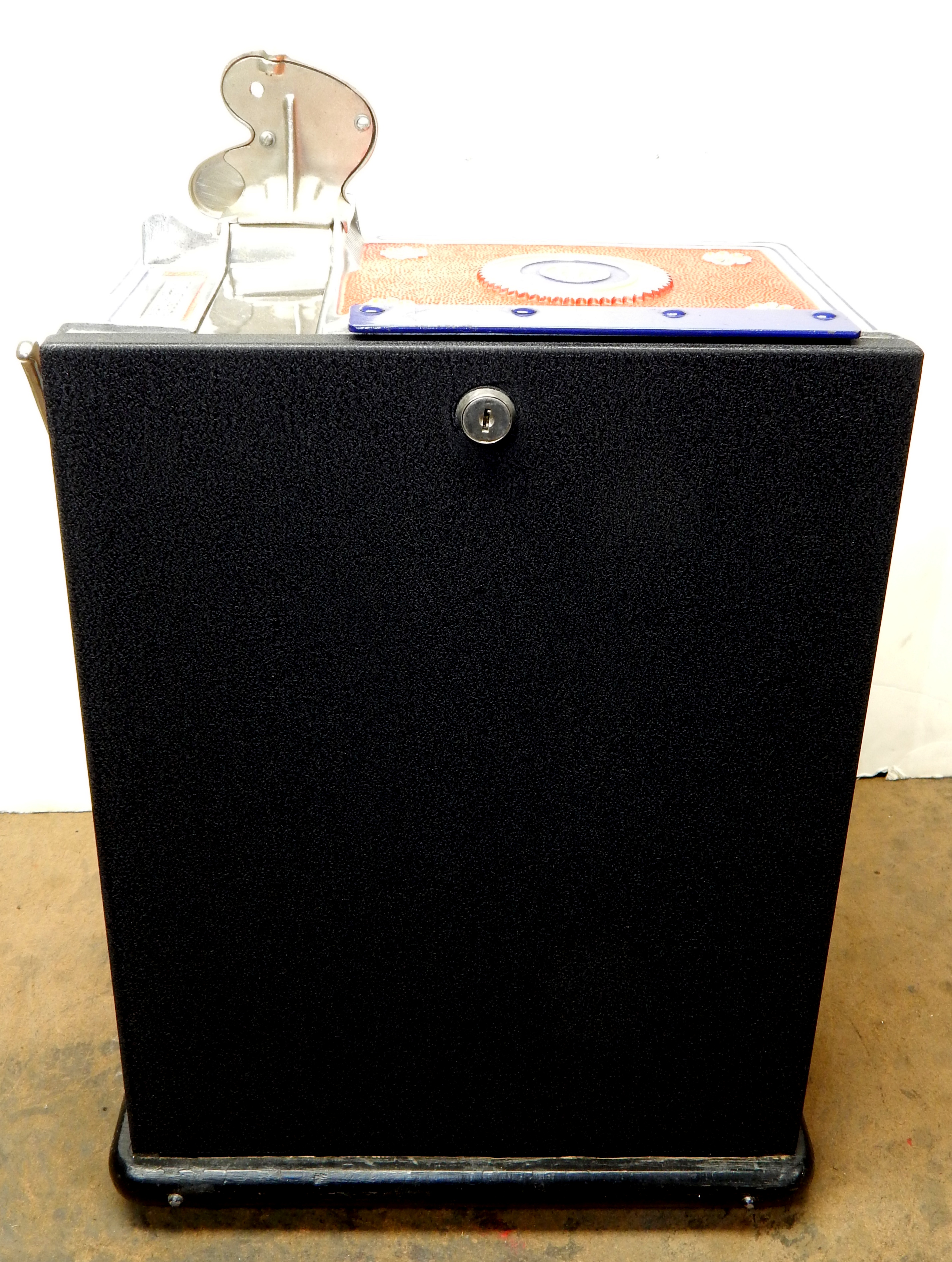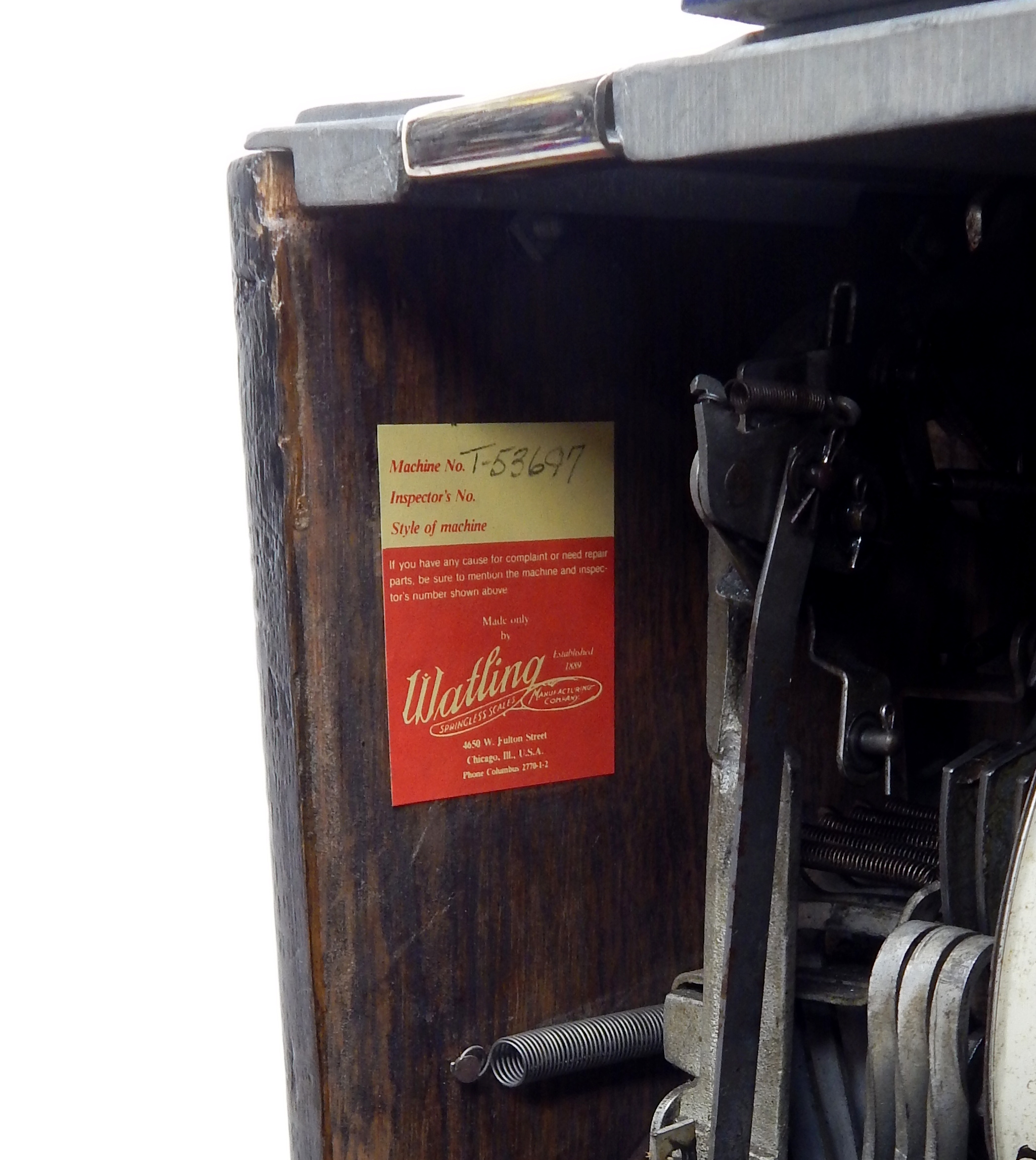 1932 Watling Twin Jackpot Front Vender, Previously restored back to original condition. Polished, not chrome plated. Twin jackpots, gum Vendors (display only), new cash box, new back door and lock. Original Tin Reel strips, strips have some surface rust on them but were not replaced. I will install a new set of paper fortune reel strips if the new owner want to replace the originals tin strips. Plays very easy and pays as it should. Very nice machine.