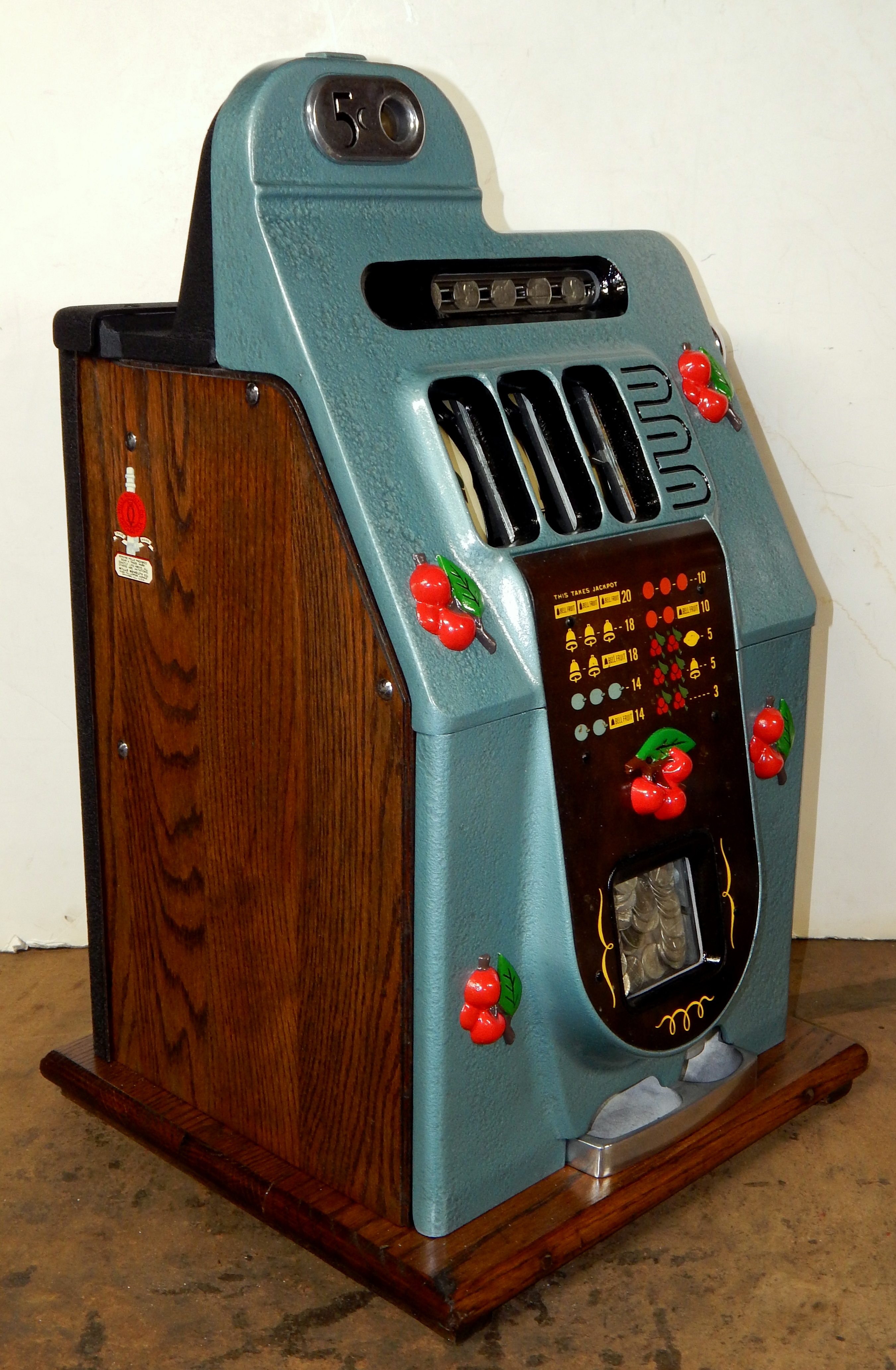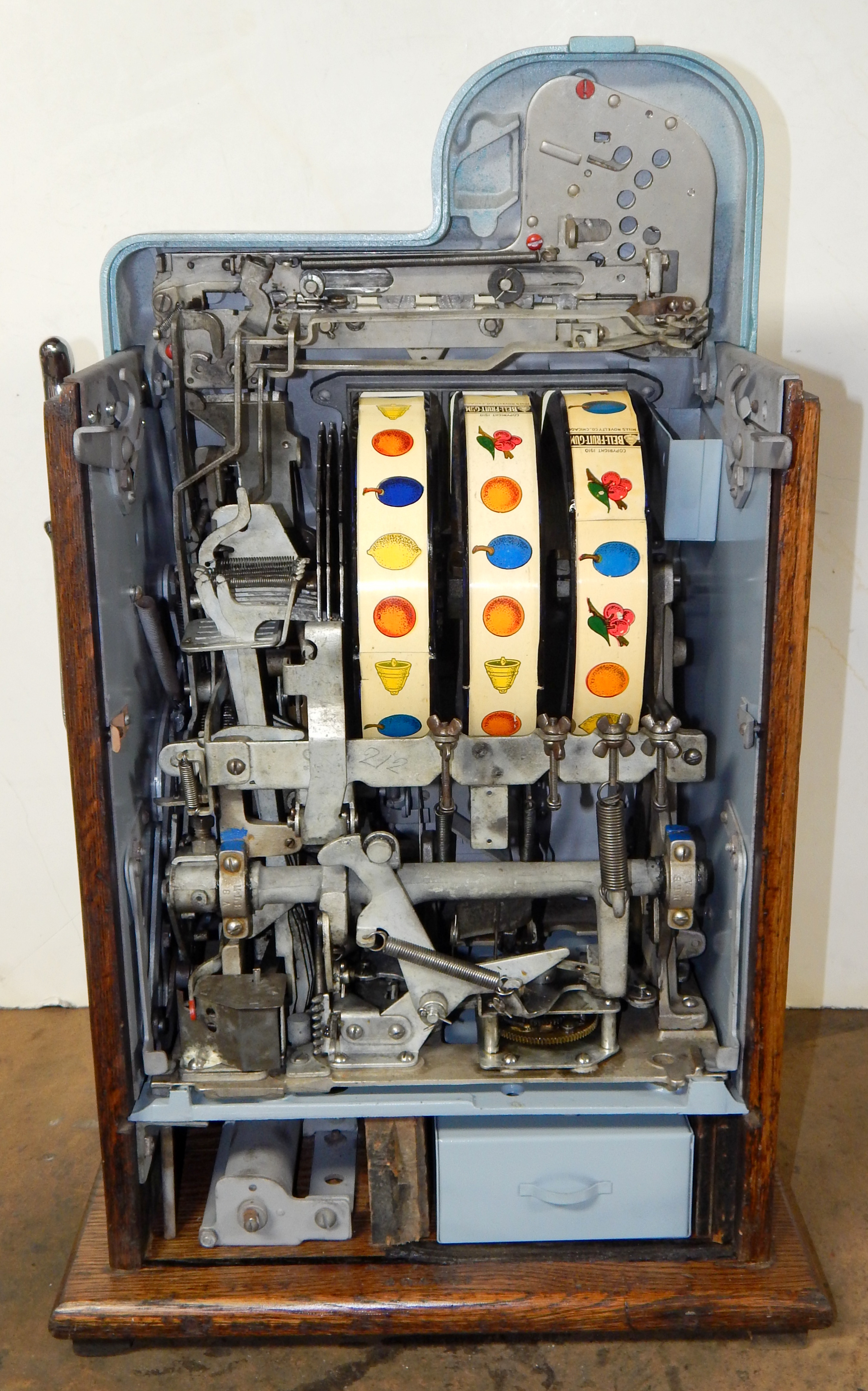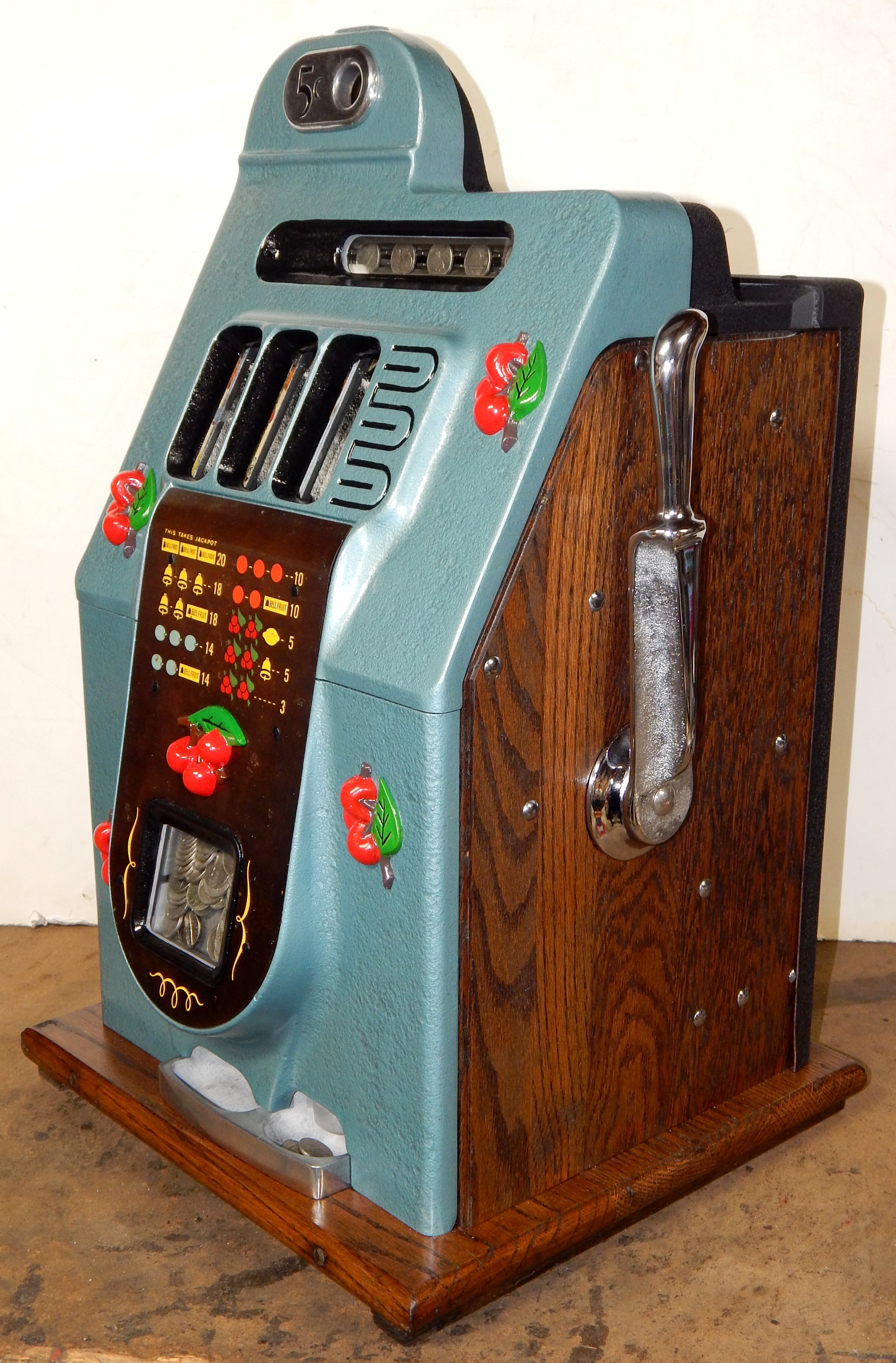 1945 Mills Black Cherry 5 cent, restored Hammer tone blue, trimmed black with oak cabinet This is a very nice machine. Original award card, original reel strips. Jackpot with reserve. Original back door with Mills lock with one key, new cash box. Plays very easy. A great rec-room machine.