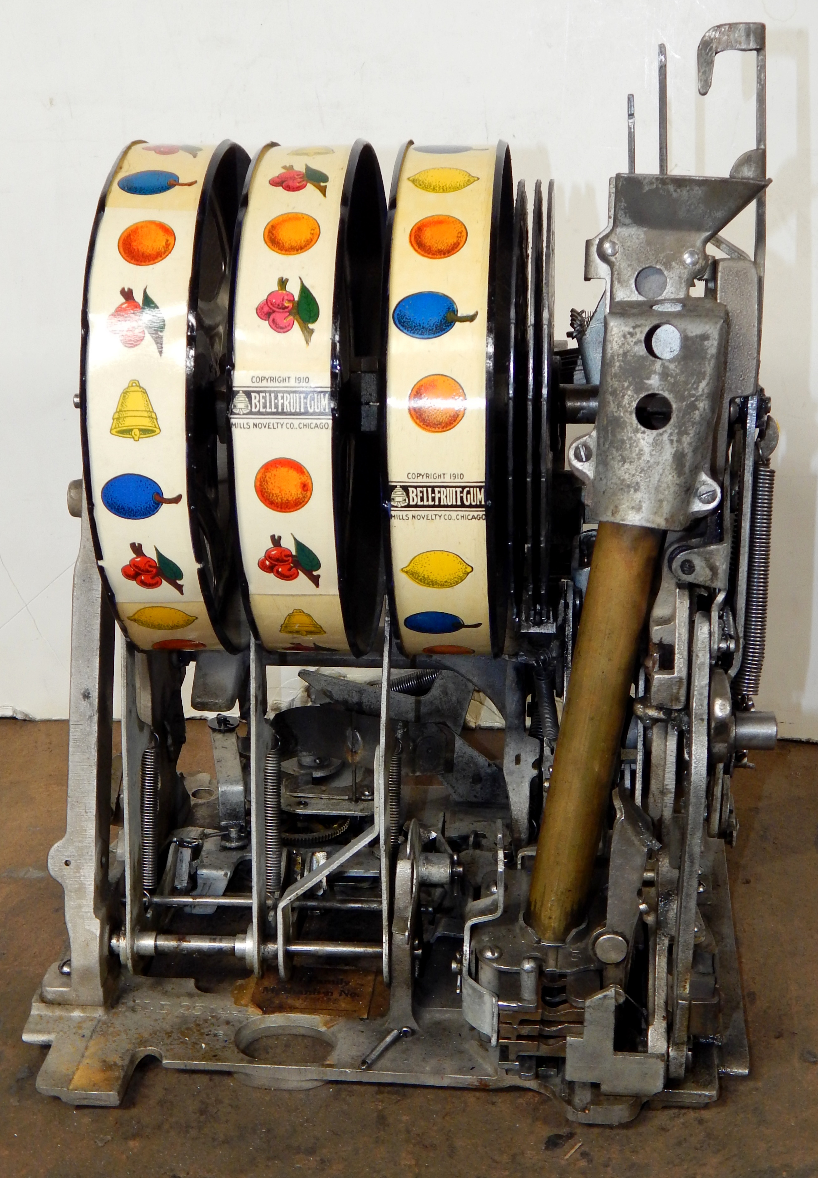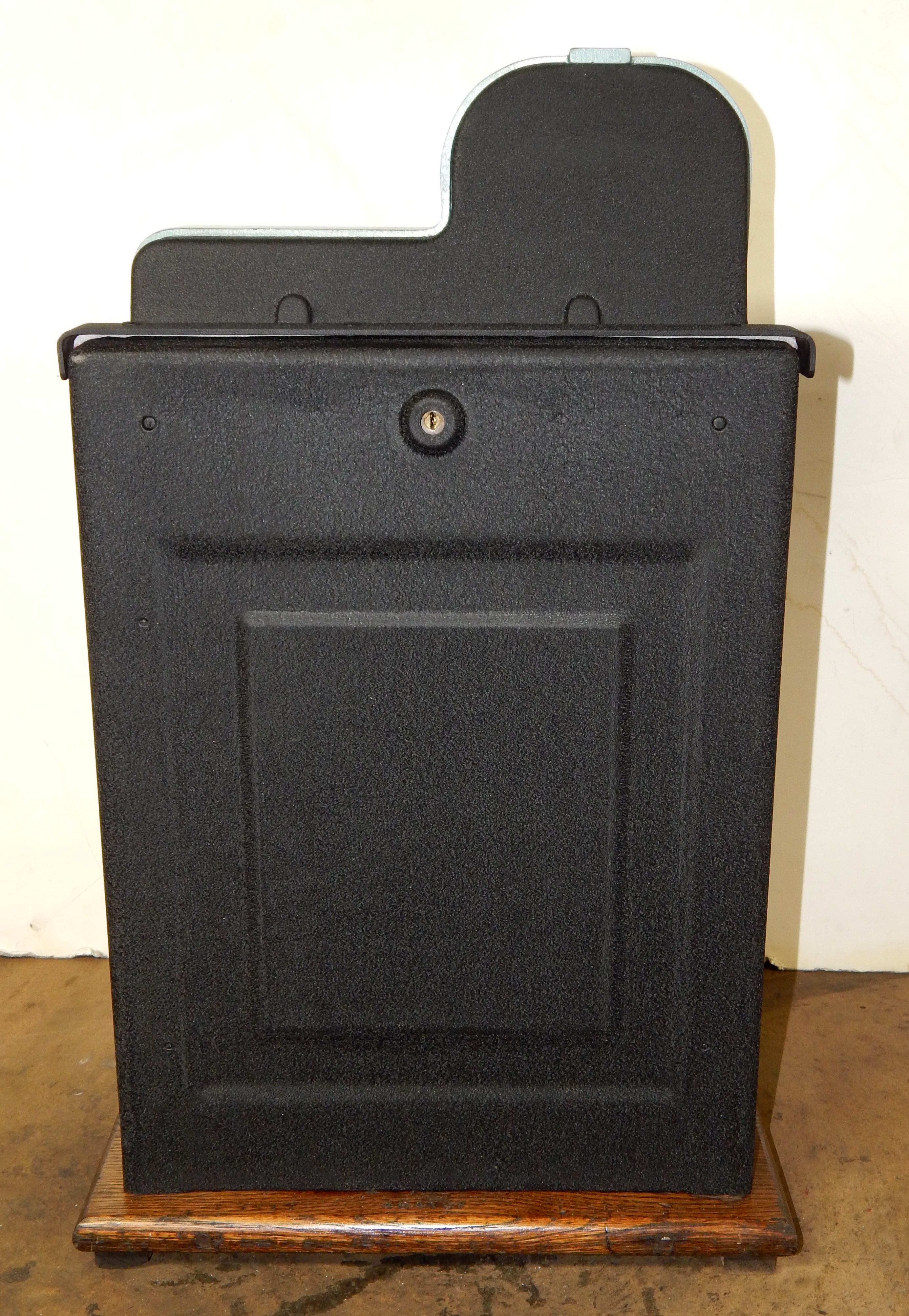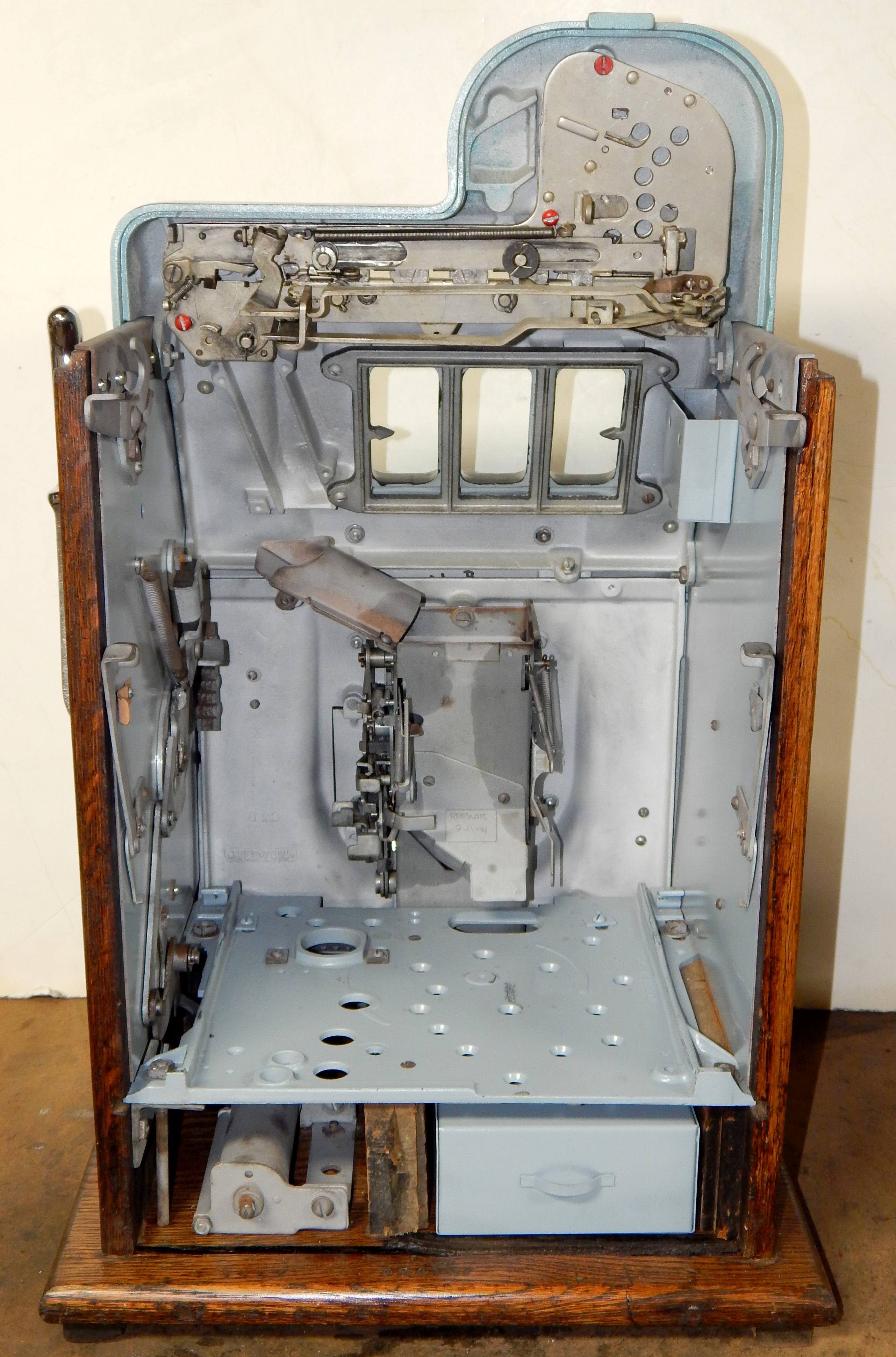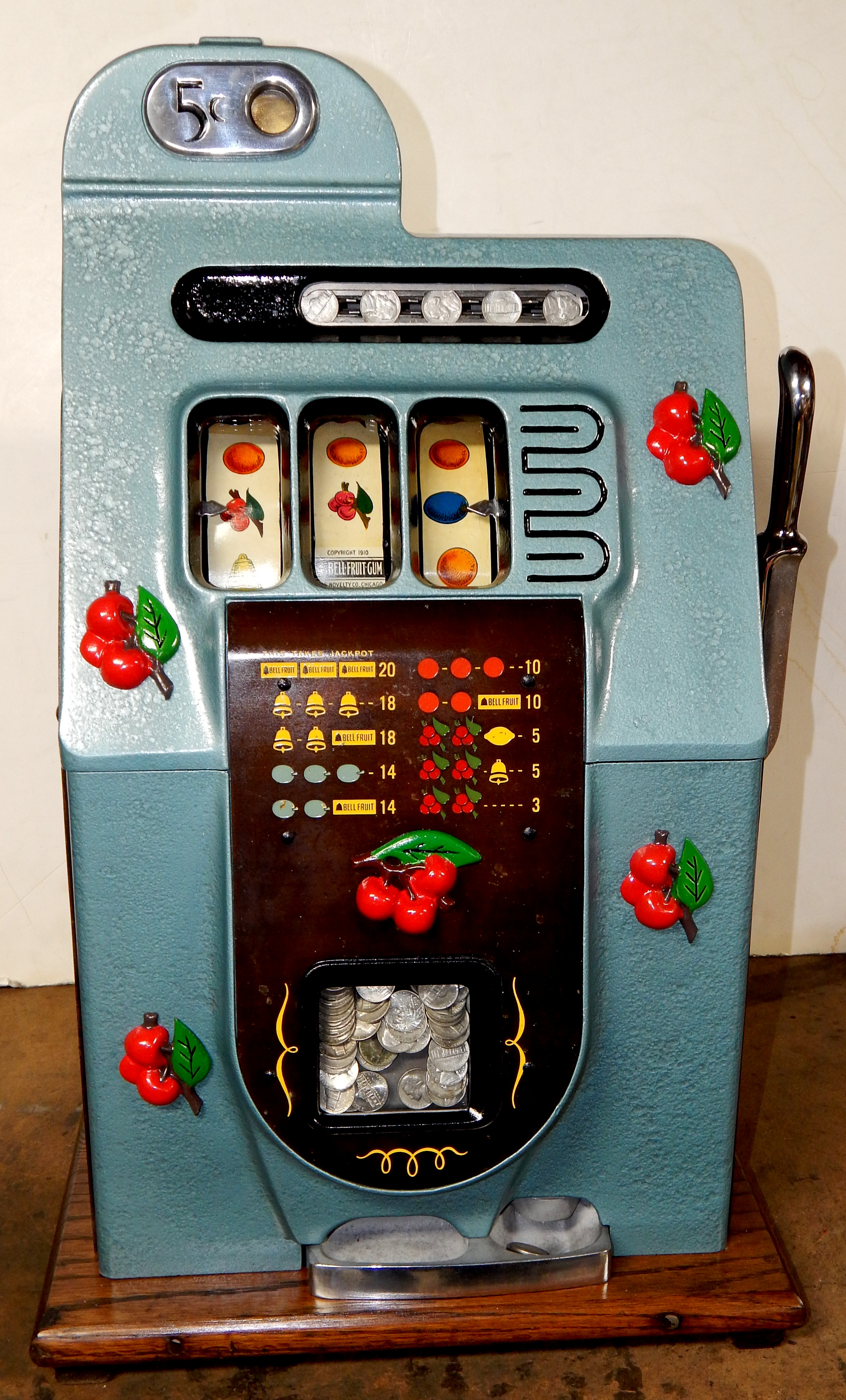 1945 Mills Black Cherry 5 cent, restored Hammer tone blue, trimmed black with oak cabinet This is a very nice machine. Original award card, original reel strips. Jackpot with reserve. Original back door with Mills lock with one key, new cash box. Plays very easy. A great rec-room machine.
