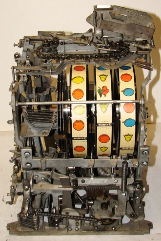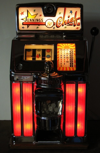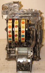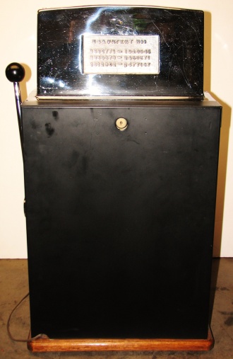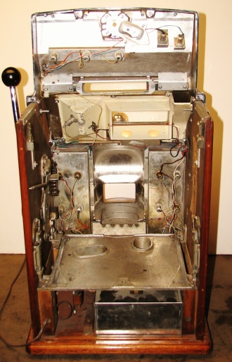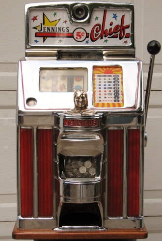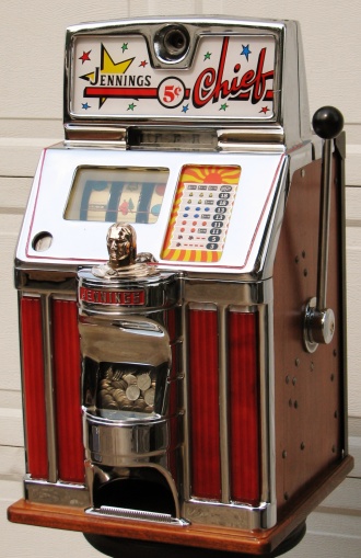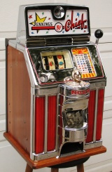 1956 Jennings Governor Lite-up, 5 cent. chrome plated, 9 out of a 10, trimed in red with red plastics. Very nice oak cabinet. Cash box, back door, reel stripes are replacements. Plays very easy and pays as it should.