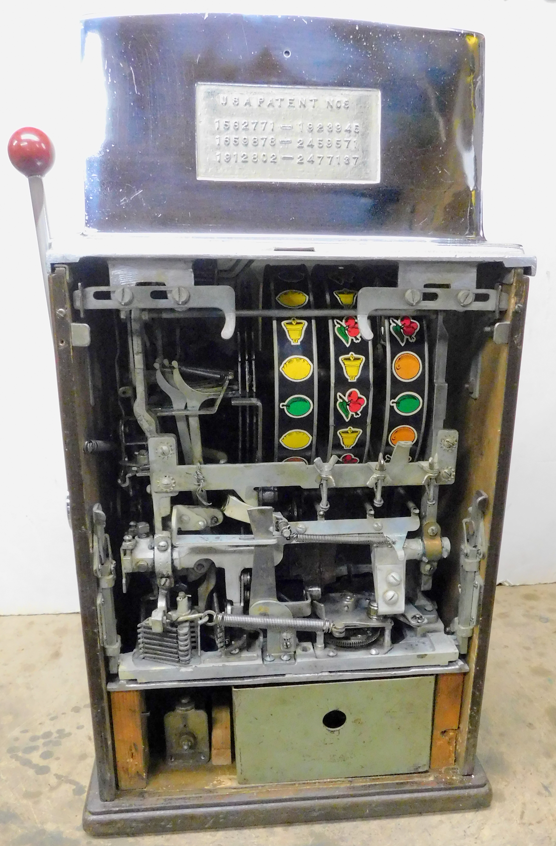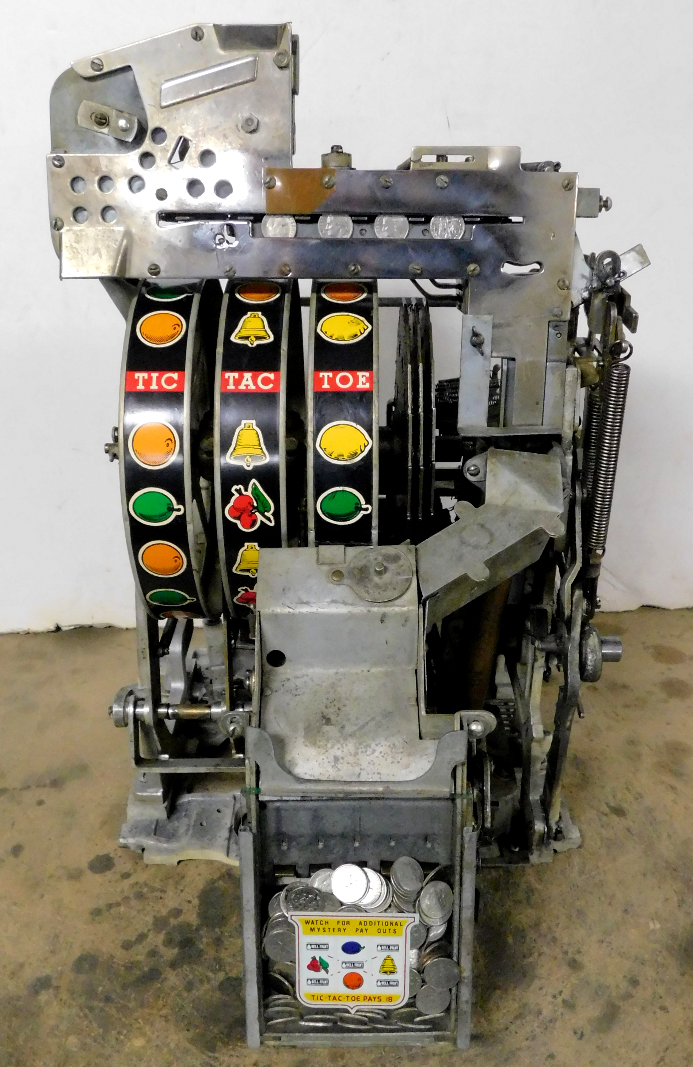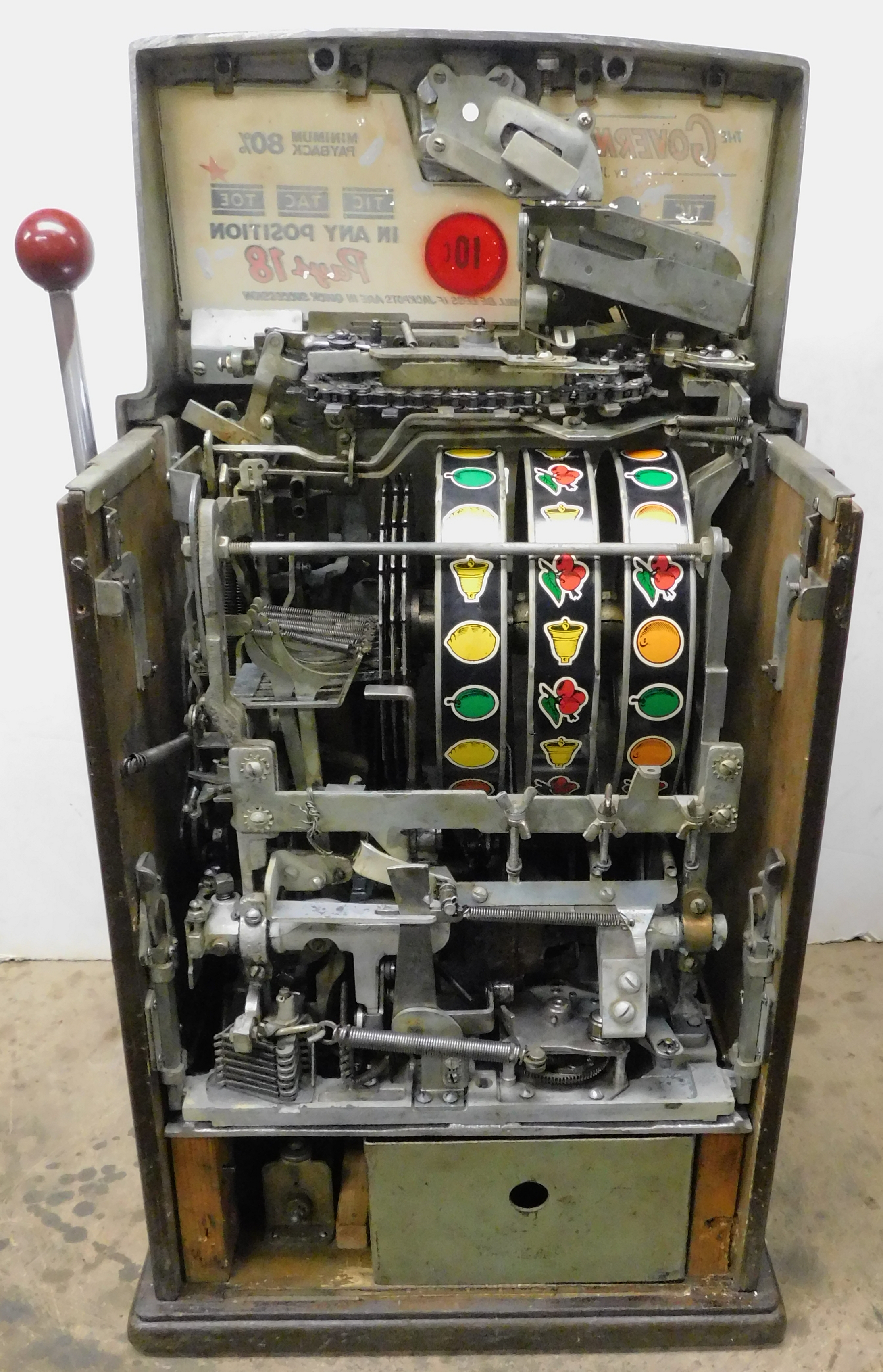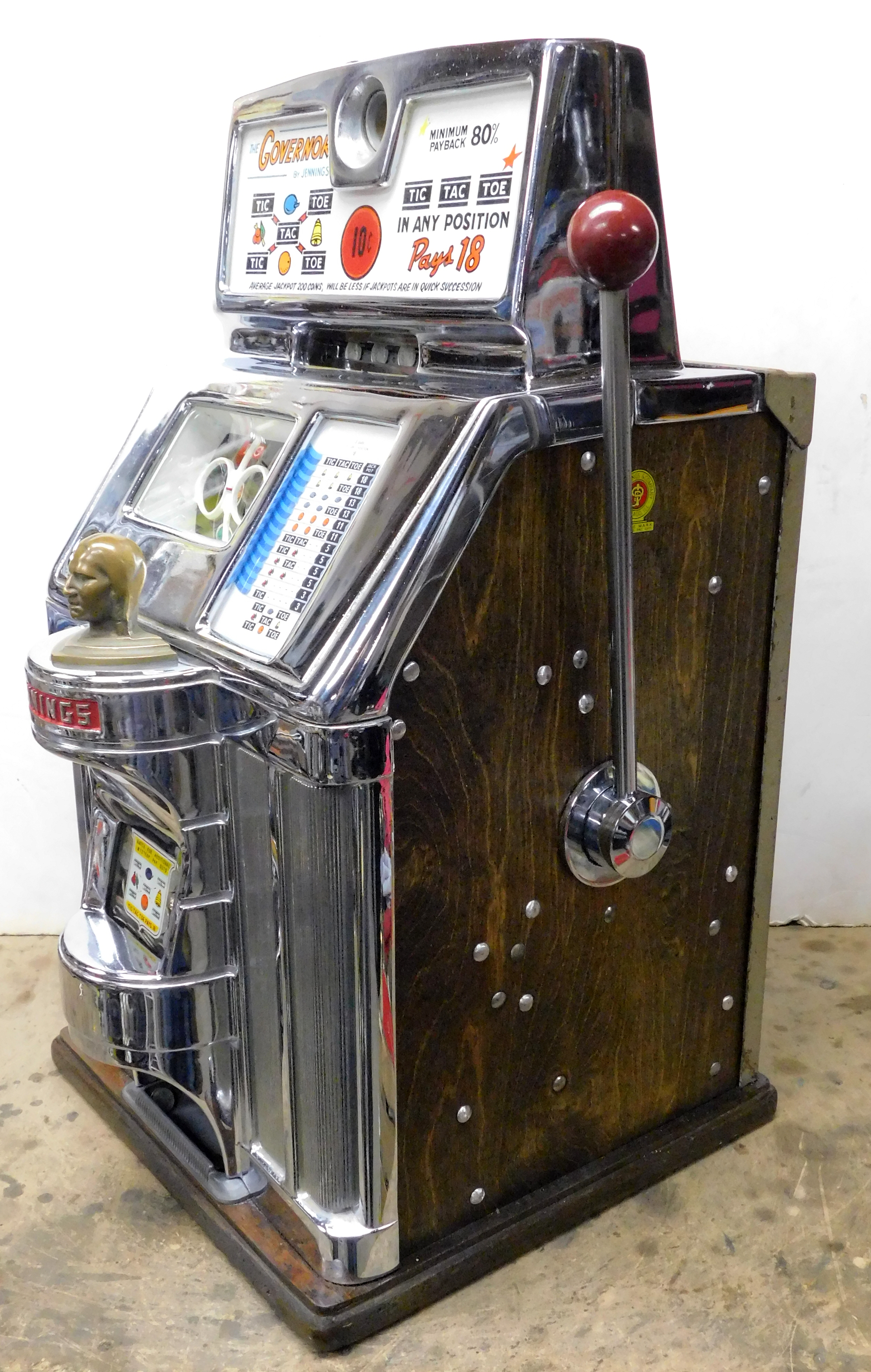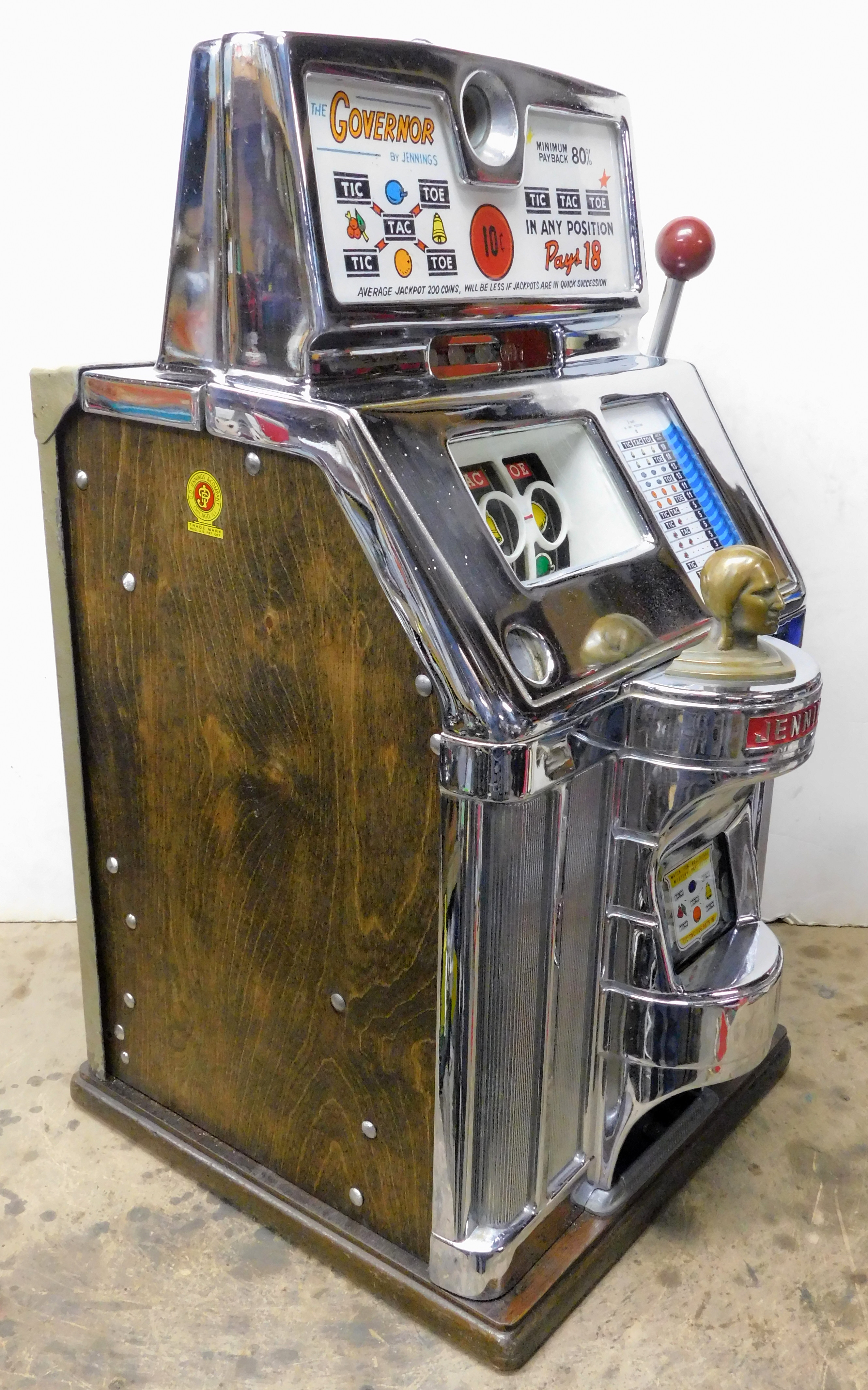1964 Jennings Governor Tic, Tac, Toe, 10 cent. Chrome condition 8.5 out of a 10, not bad for a 61 years old machine. Trimed in red. Very nice machine not restored, original cash box, back door, original black reel stripes, very nice cabinet, original back door with Ace lock one key. This is not a "lite-up" machine. Plays very easy and pays as it should.