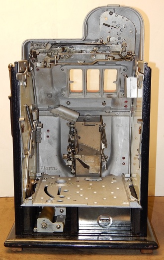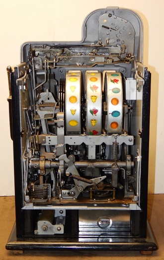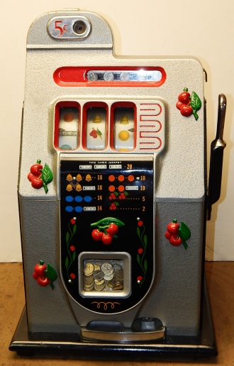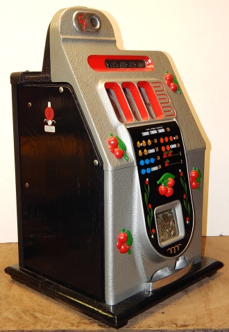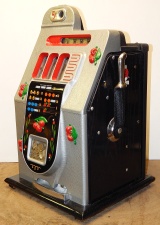 Mills 1947 Black Cherry 5 cent, Previously restored, Hammer tone Silver with red trim. This is a very nice machine restored back to the original colors. New award card, Jackpot with reserve, original back door and lock with one key, cash box. Plays very easy, pays as it should. 2-5 payout.