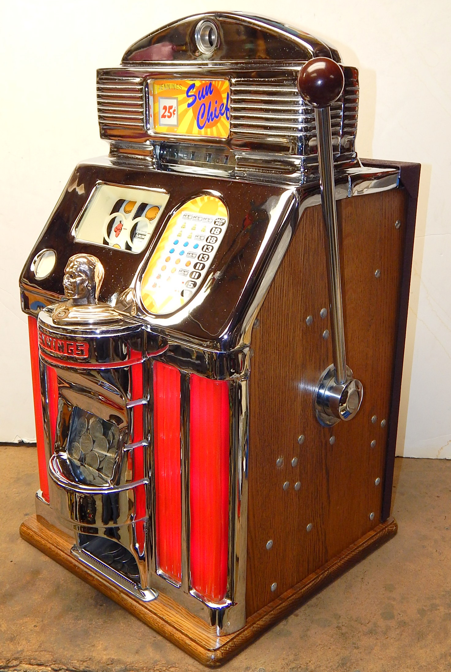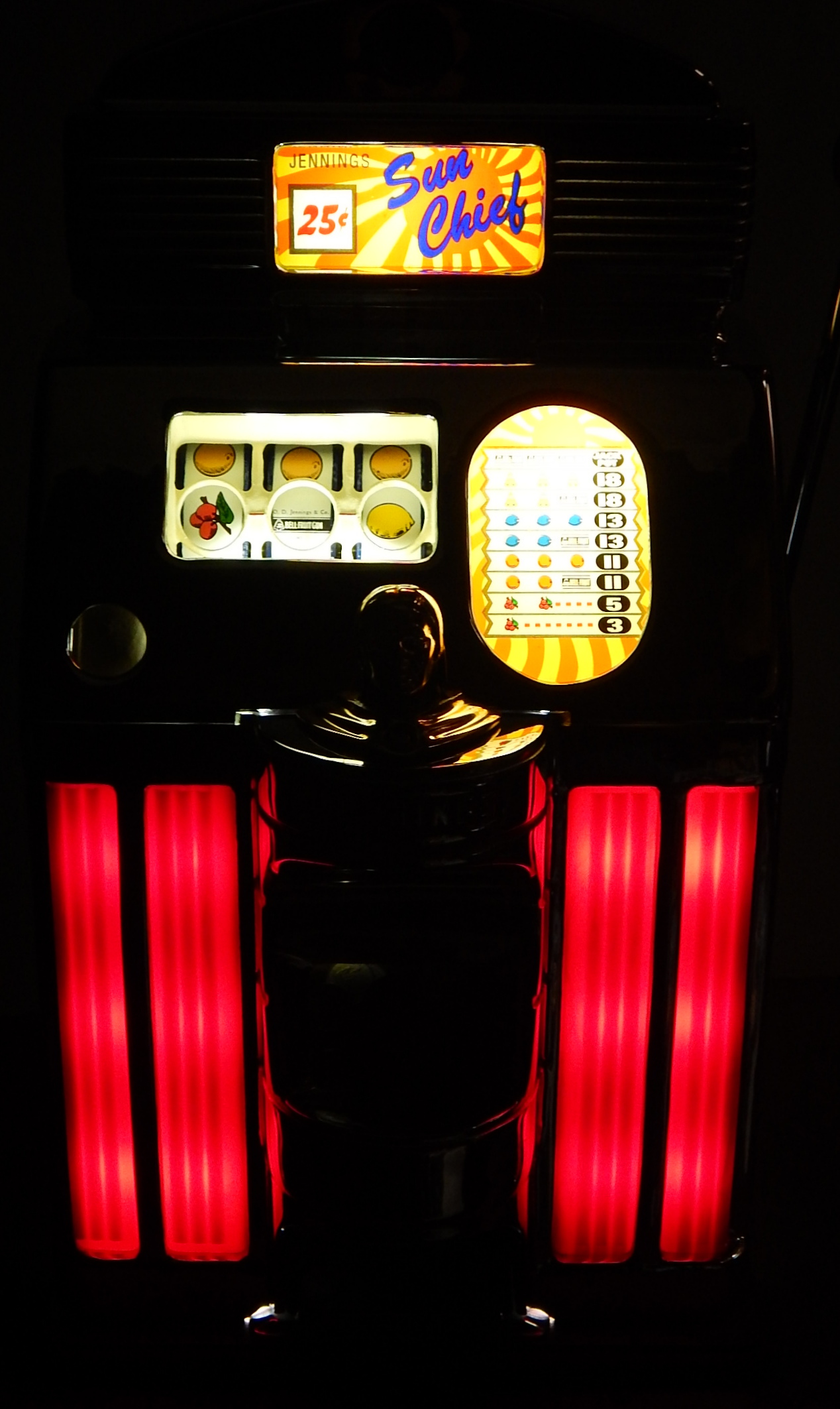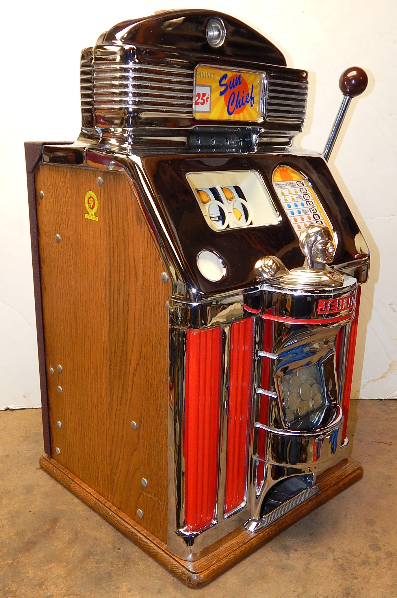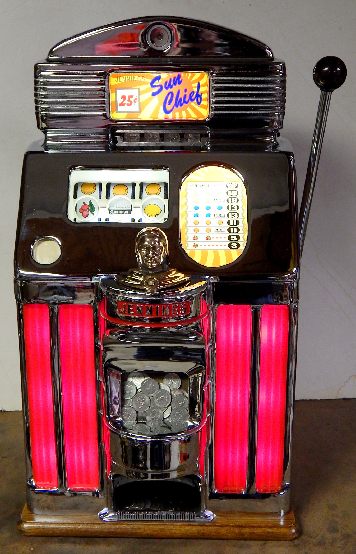 1949 Jennings Sun Chief "Light-Up" 25 cent. Restored machine, with RED plastic, new chrome on this machine is 9 out of 10. Front load jackpot, original cash box, back door with Ace lock, new reel stripes. Cabinet on this machine is also in mint condition.