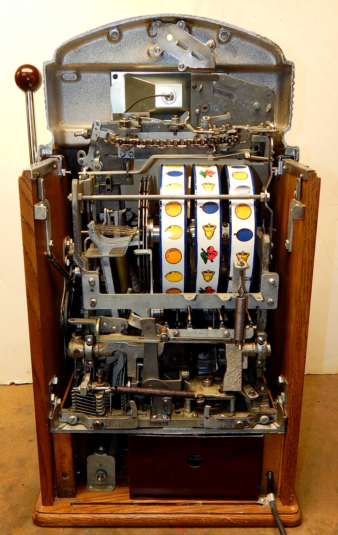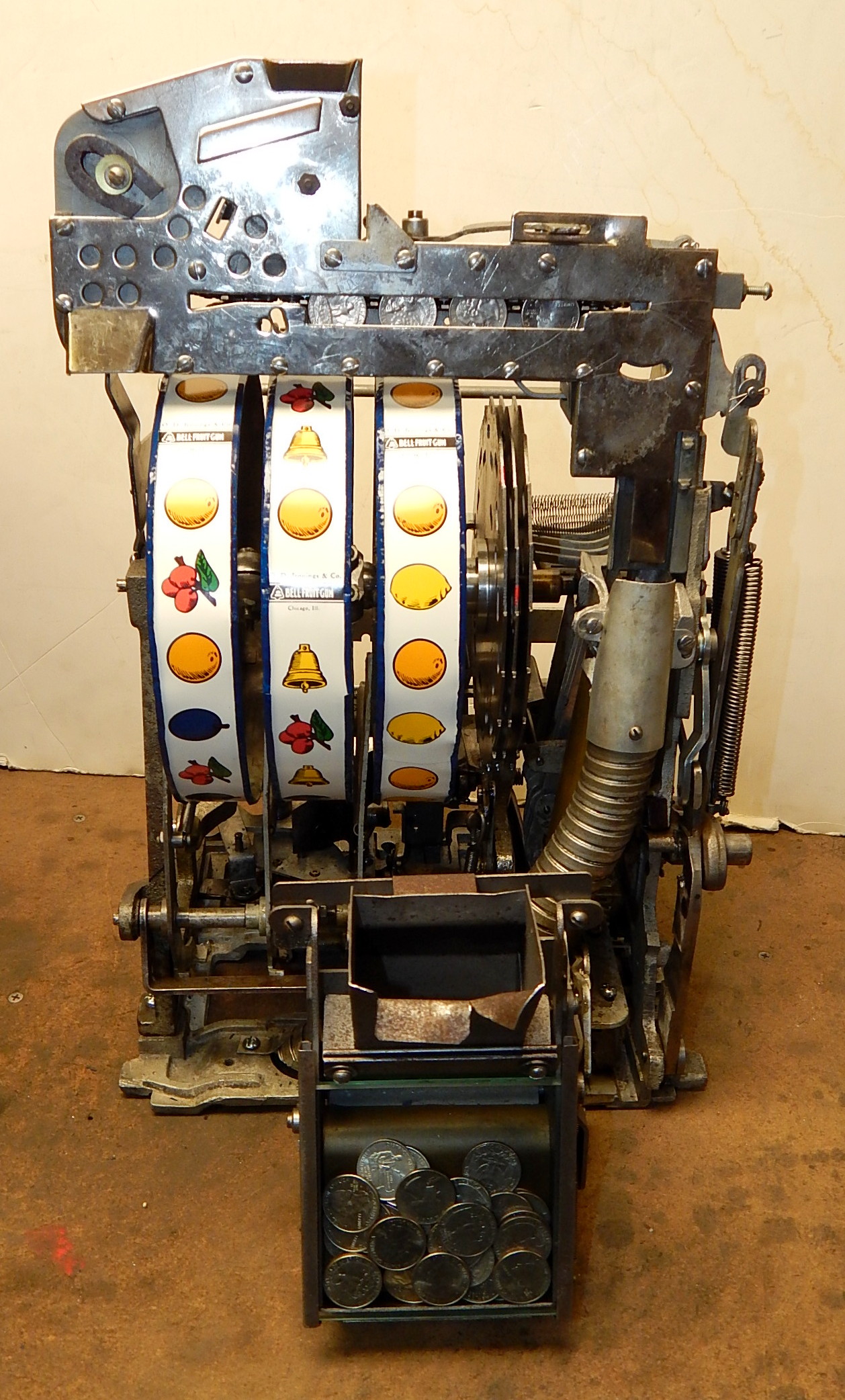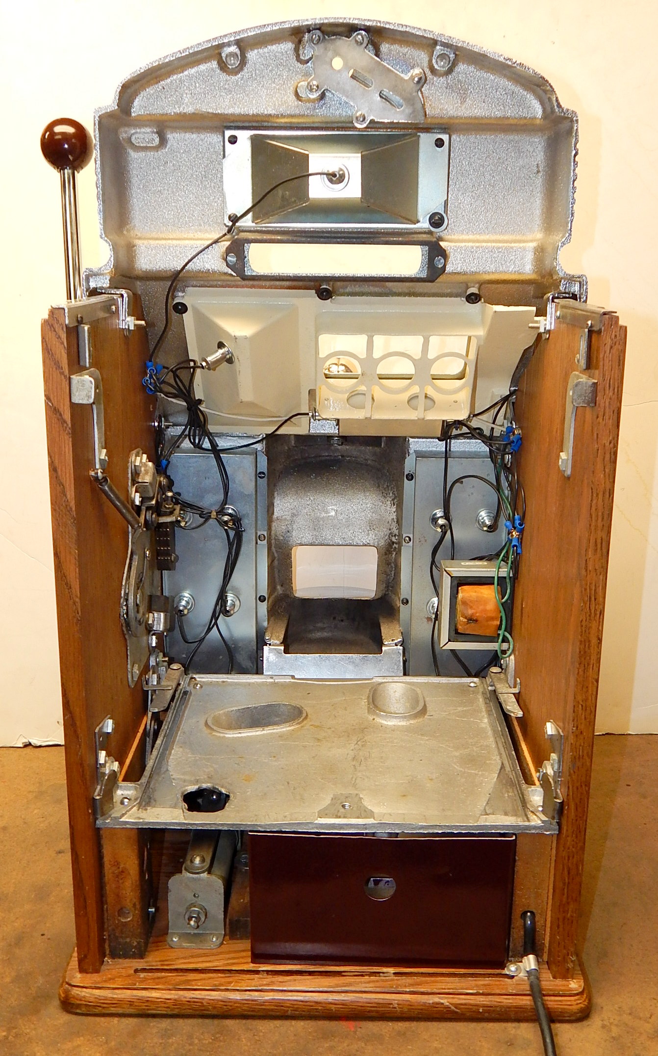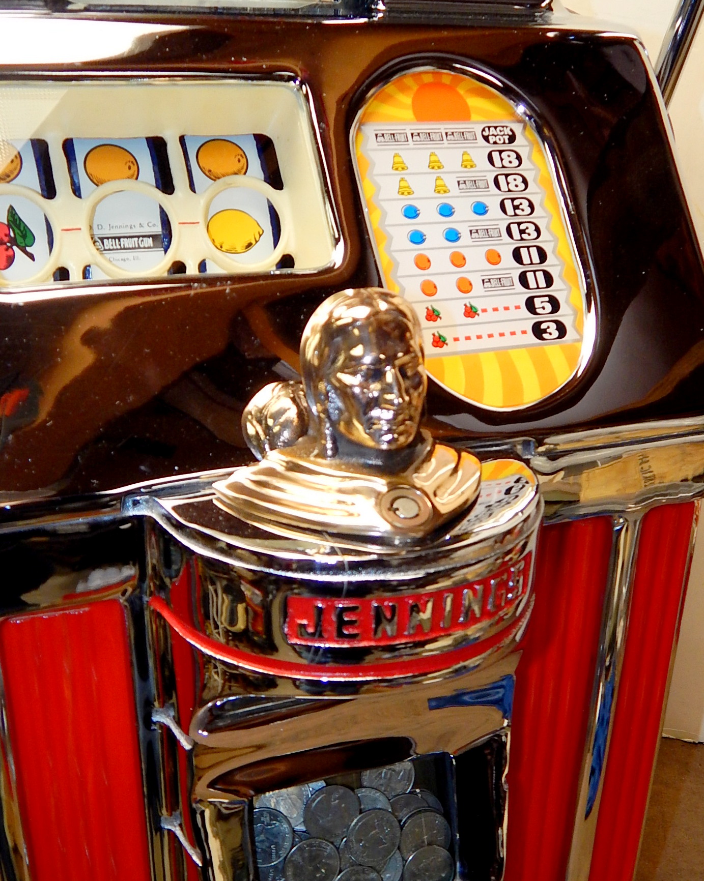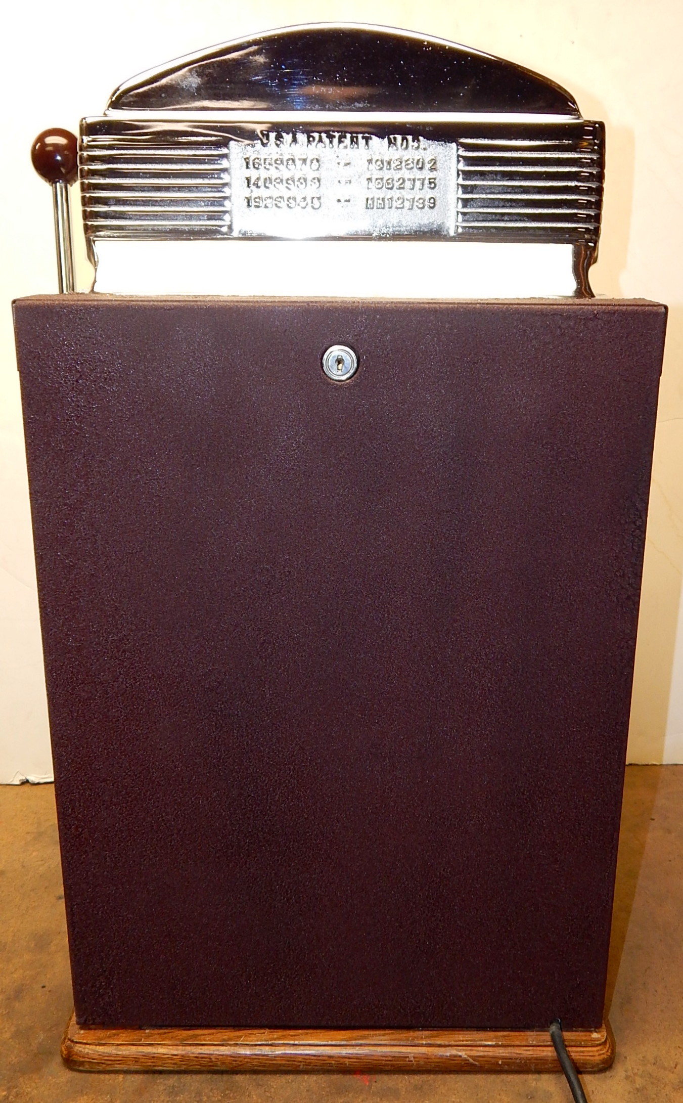 1949 Jennings Sun Chief "Light-Up" 25 cent. Restored machine, with RED plastic, new chrome on this machine is 9 out of 10. Front load jackpot, original cash box, back door with Ace lock, new reel stripes. Cabinet on this machine is also in mint condition.