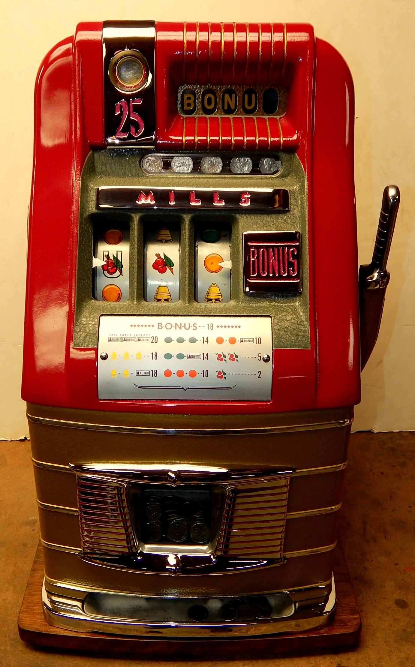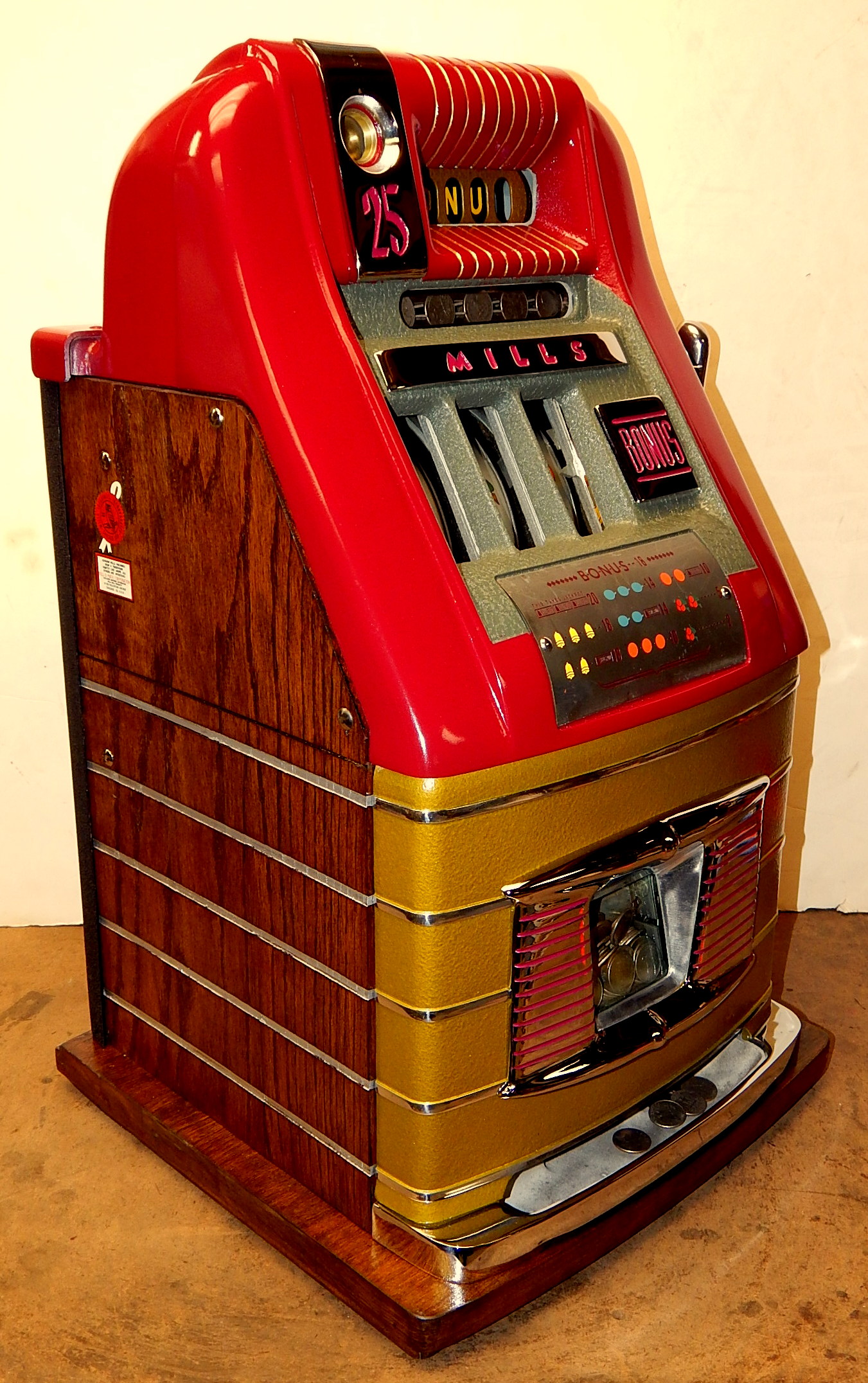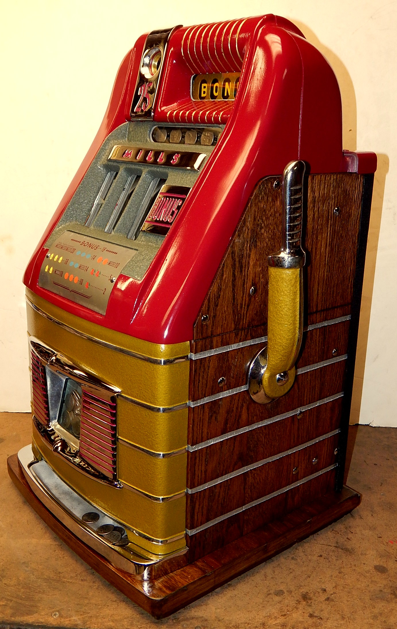 Mills 1948 Bonus Hi-Top 25 cent restored back to the original colors of burgundy, hammer gold trimmed in wrinkle green. This machine has the Hard to find Bonus feature. Mint condition original award card, original reel strips, original cash box with cashbox door and Mills lock, original back door with Mills locks with one keys. All the trim on this machine is triple plated chrome. The cabinet on this machine was in such fine condition, we did not have the heart to hide this beautiful all oak wood cabinet with paint so, its finished and stained instead of painted to bring out it's natural beauty. Other then the new paint, a very nice all original machine which still has the original paper work on the inside of the cabinet and mechanism. Plays easy and pays as it should, 2-5 pay out