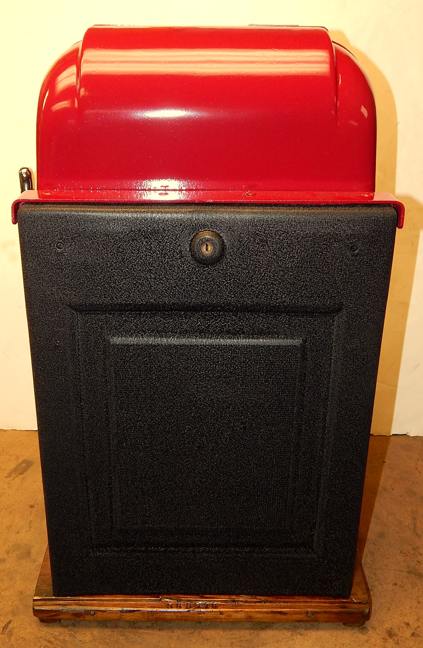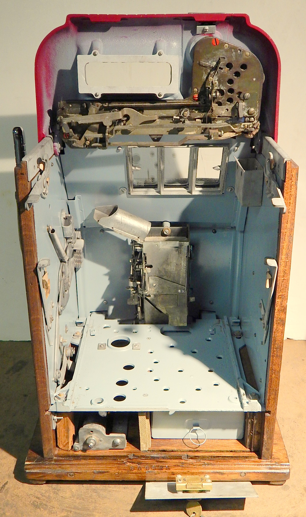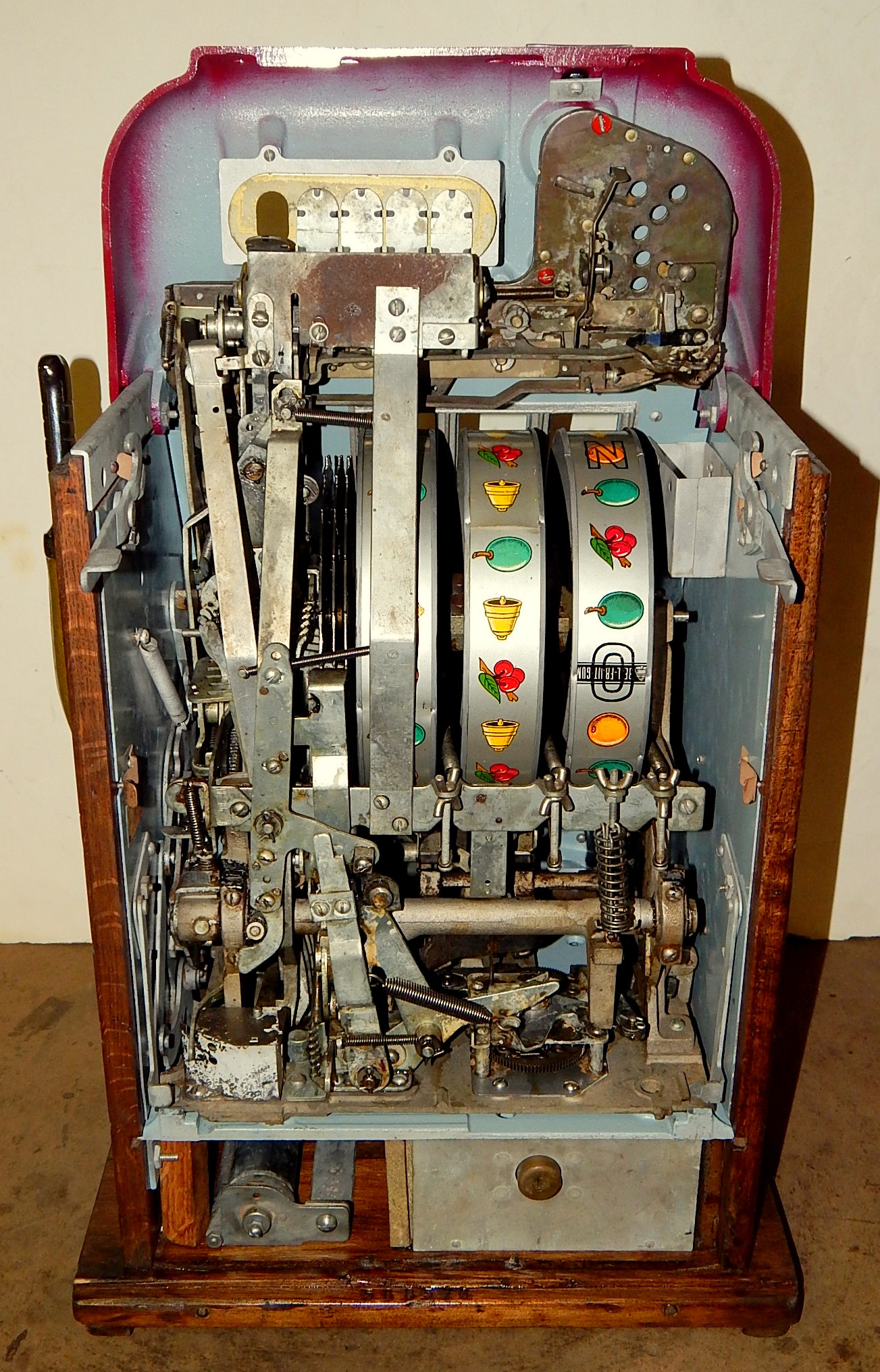 Mills 1948 Bonus Hi-Top 25 cent restored back to the original colors of burgundy, hammer gold trimmed in wrinkle green. This machine has the Hard to find Bonus feature. Mint condition original award card, original reel strips, original cash box with cashbox door and Mills lock, original back door with Mills locks with one keys. All the trim on this machine is triple plated chrome. The cabinet on this machine was in such fine condition, we did not have the heart to hide this beautiful all oak wood cabinet with paint so, its finished and stained instead of painted to bring out it's natural beauty. Other then the new paint, a very nice all original machine which still has the original paper work on the inside of the cabinet and mechanism. Plays easy and pays as it should, 2-5 pay out