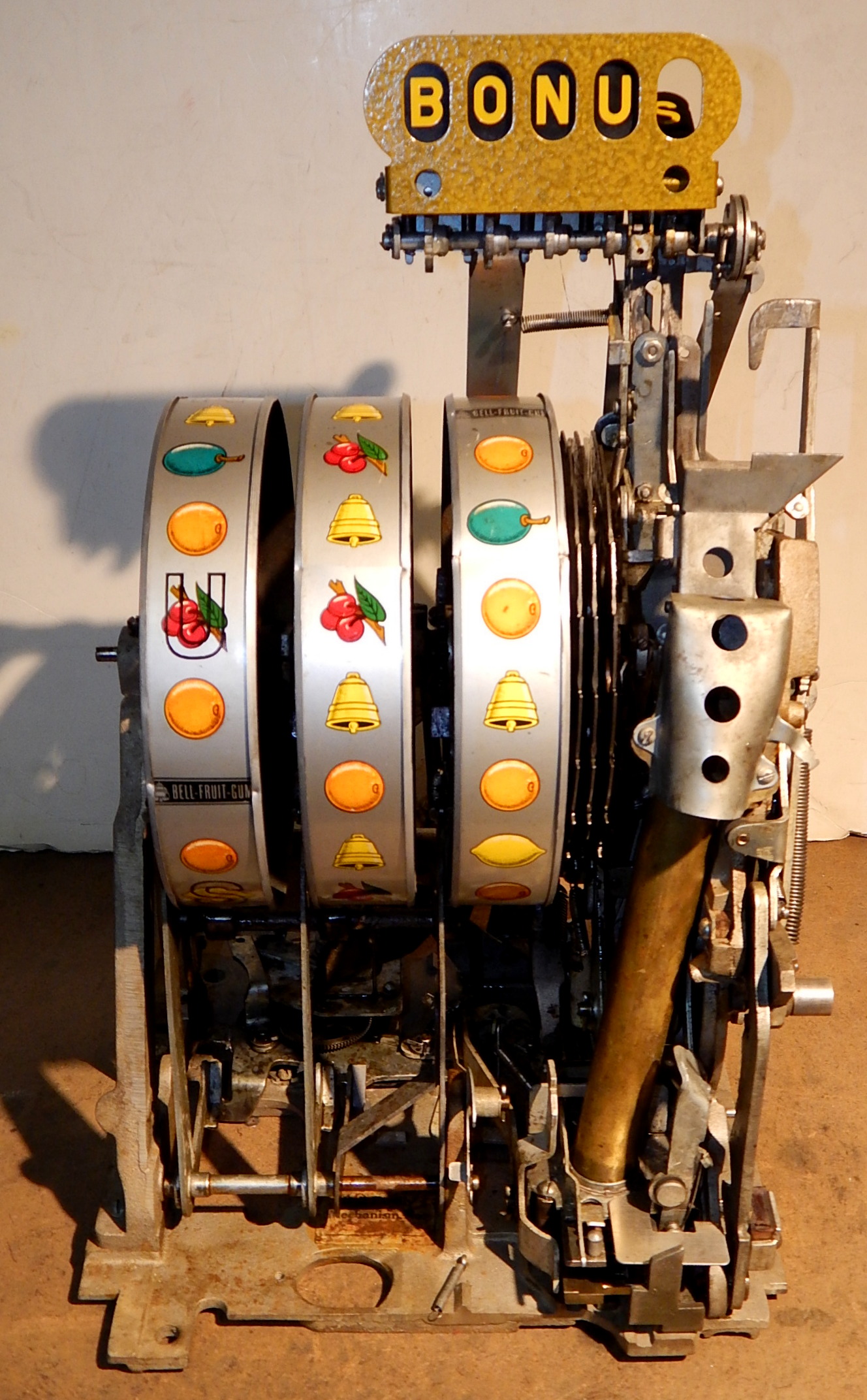 When the BONUS letters on the first reel come up in order, corresponding letters will appear at the top right of the machine. Once the entire word BONUS is spelled out, you win 18 coins. This was another way Mills would try to keep people playing longer and if you had almost all the letters showing, it was hard to walk away.