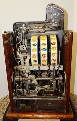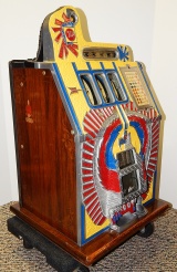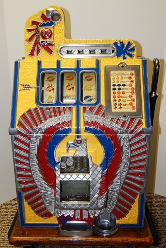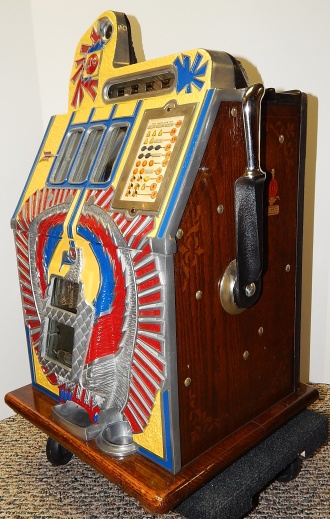1932 Mills War Eagle 10 cent. Previously restored, nice original oak cabinet, Jackpot with reserve, original back door with Mills lock and key, nice original fortune reel strips, original cash box, new award card. Plays very easy and pays as it should.
