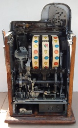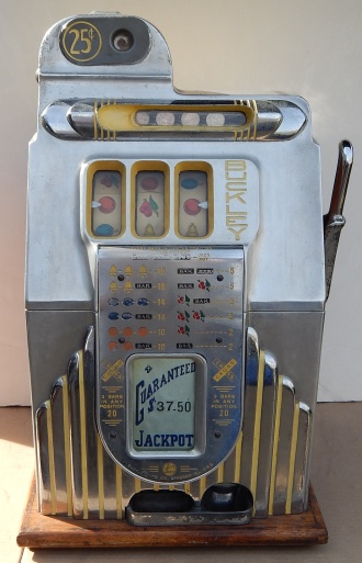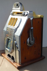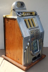 1948 Buckley "Chrome Deluxe" Criss Cross Jackpot Bell, 25 cent, new reel strips, original award card, and original back door. Very nice machine inside and out. Plays very easy and pays as it should. If you are looking for a very nice example of a Buckley Slot machine here you are.