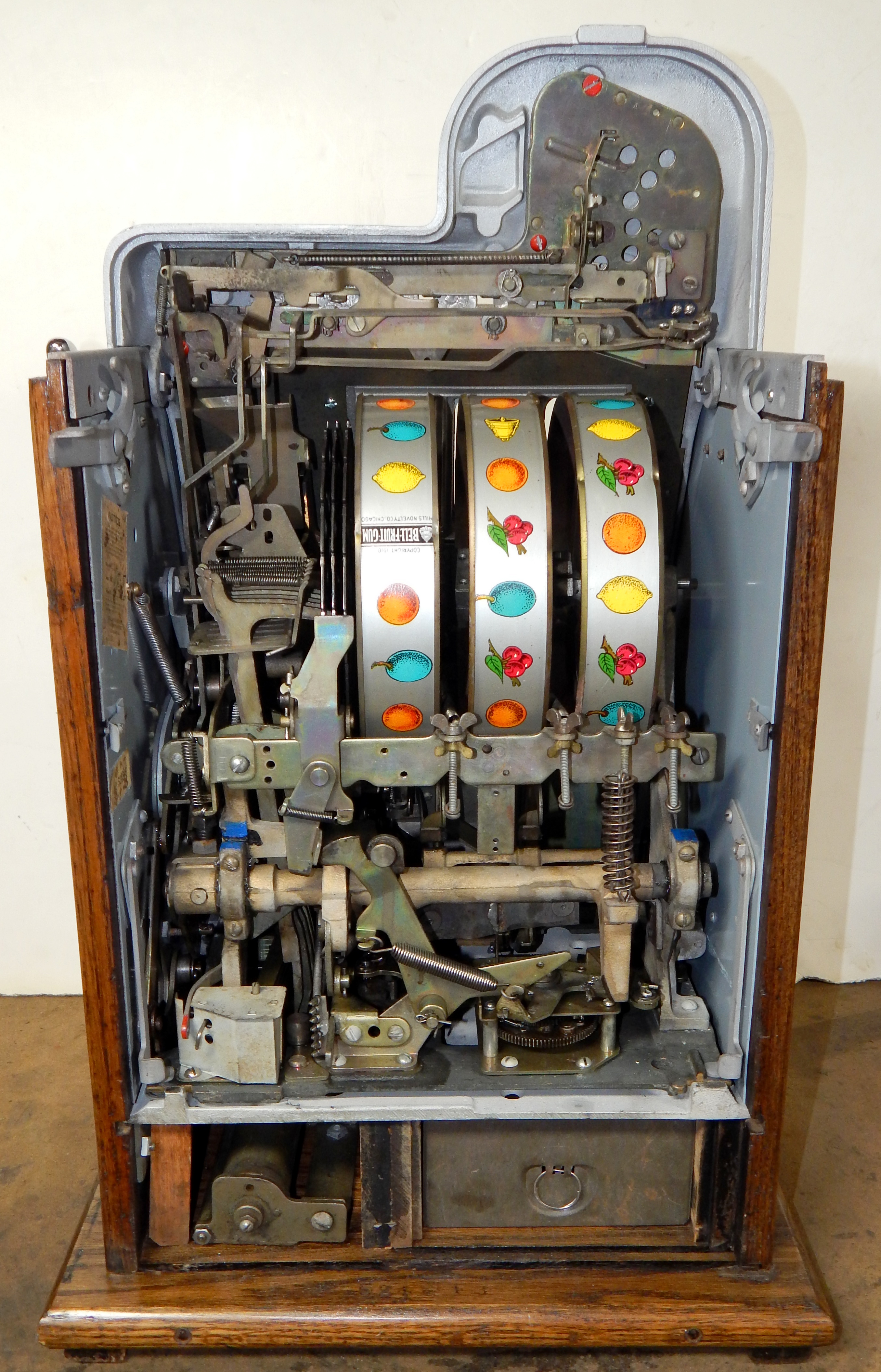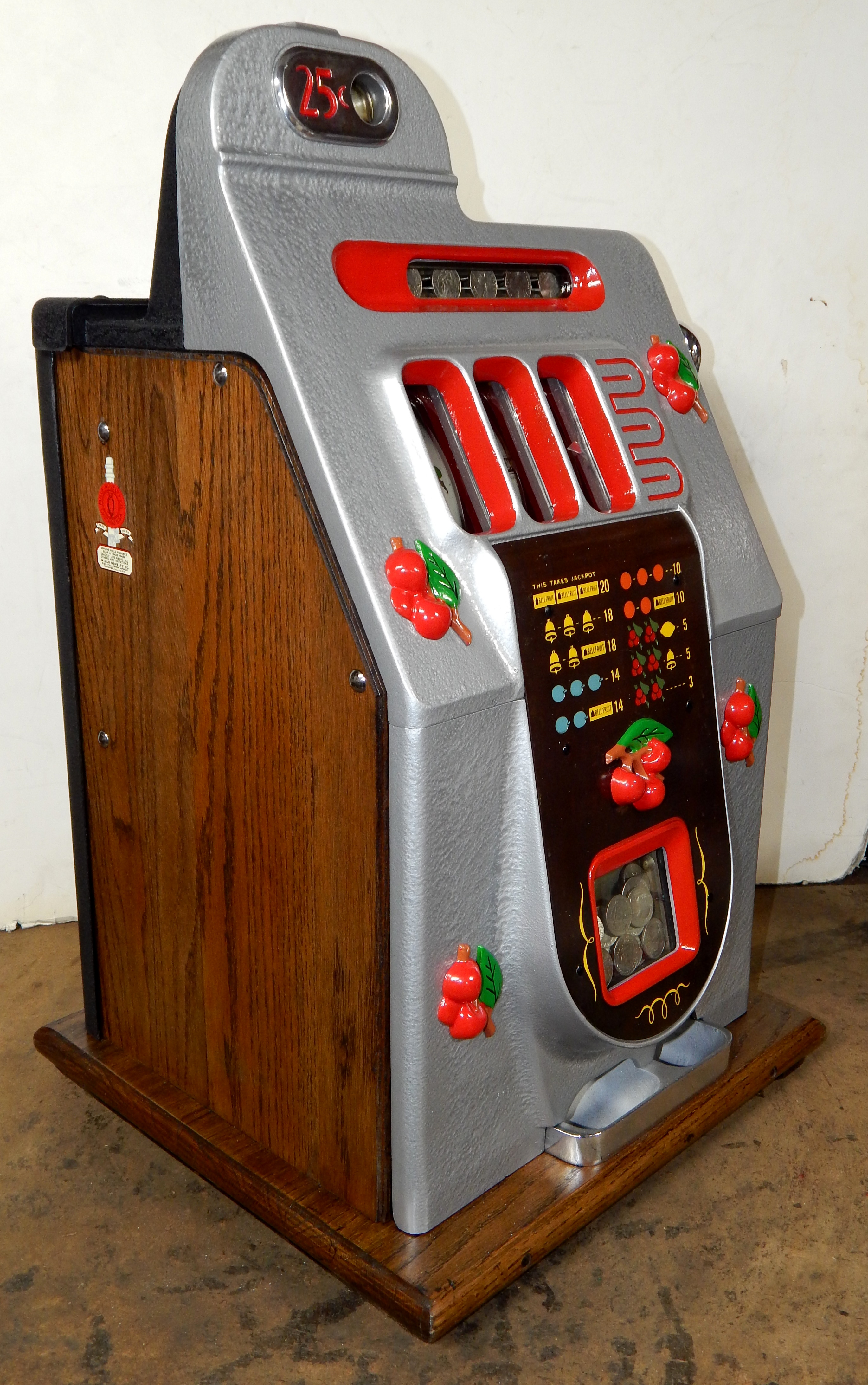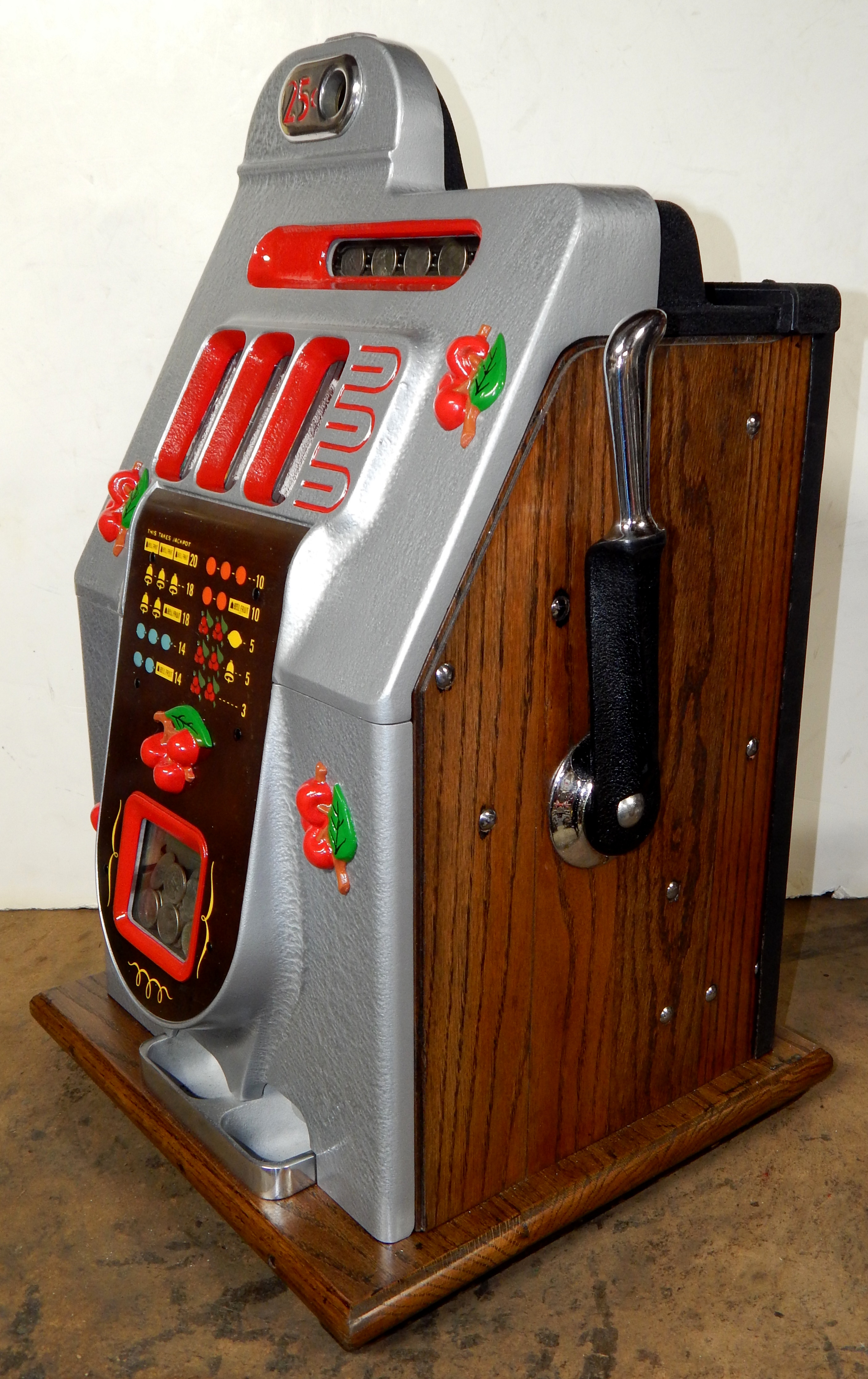 Mills 1945 Black Cherry, 25 cent. Hammer tone Silver with red trim. This is a very nice machine restored back to the original colors. The only thing that is not original on this machine is the paint and decal. Mint original condition award card, Original reel strips, Jackpot with reserve, original back door and lock with one key, Original cash box. Still has the original paper work on the inside of the cabinet. Plays very easy. Great rec-room machine.