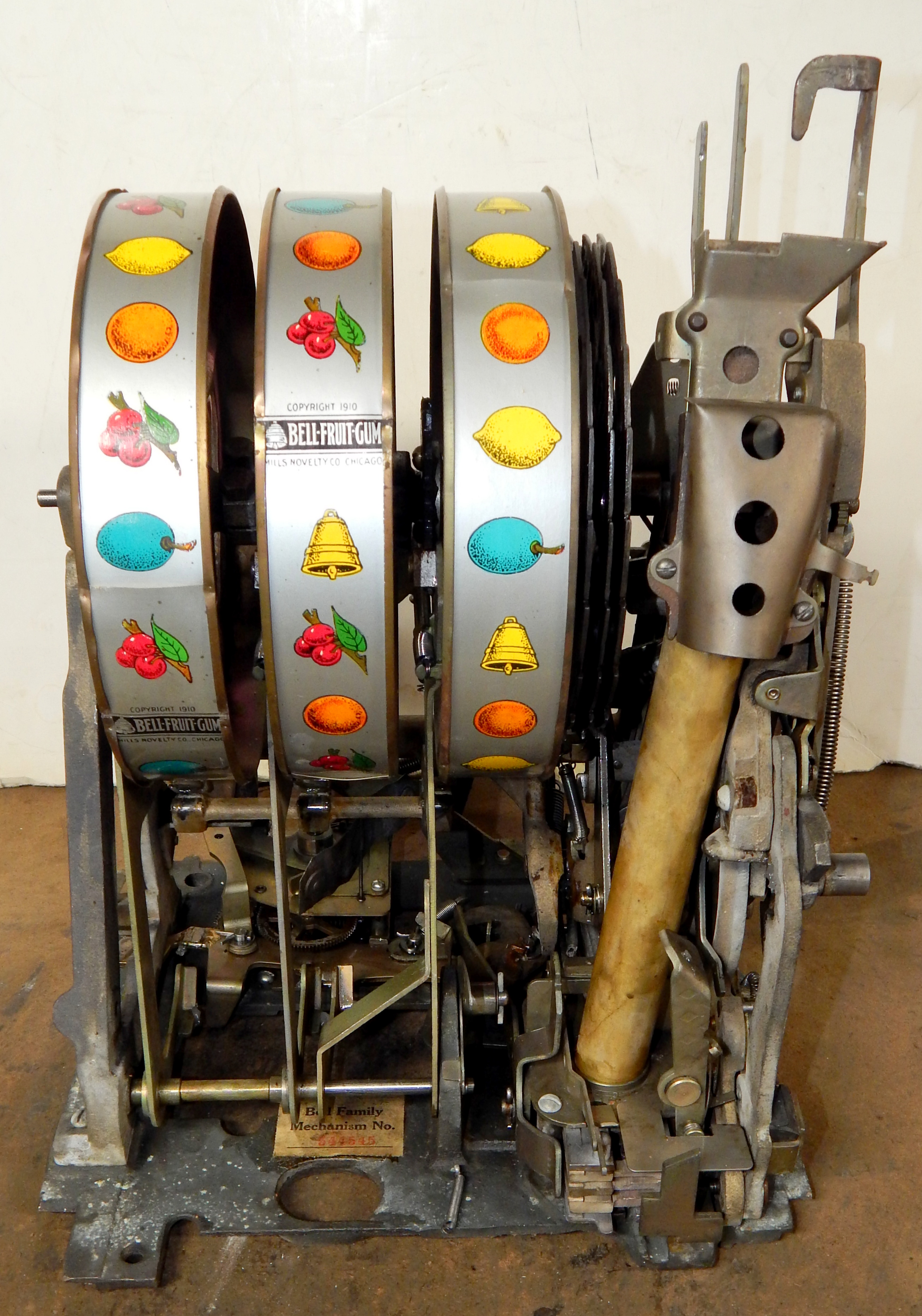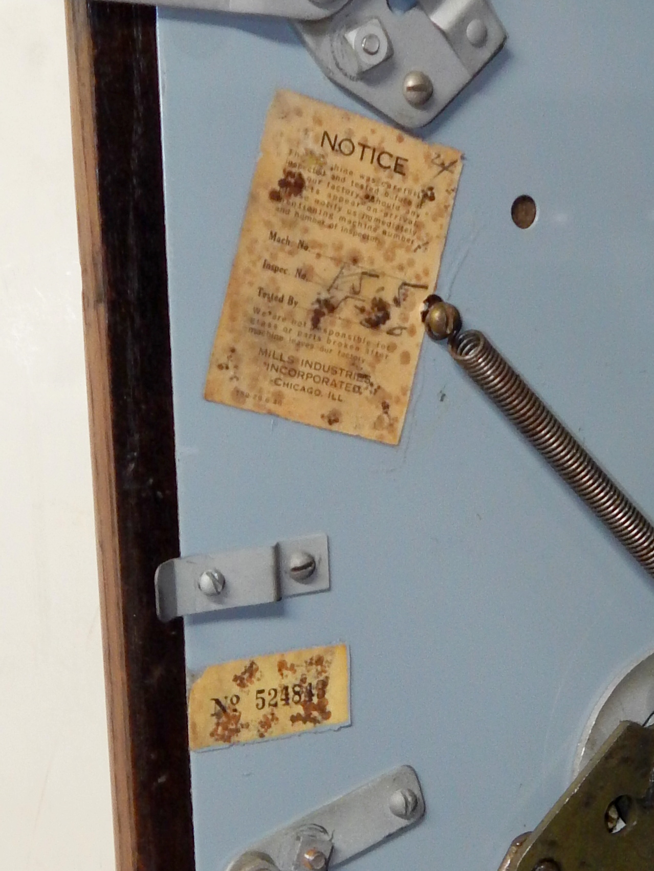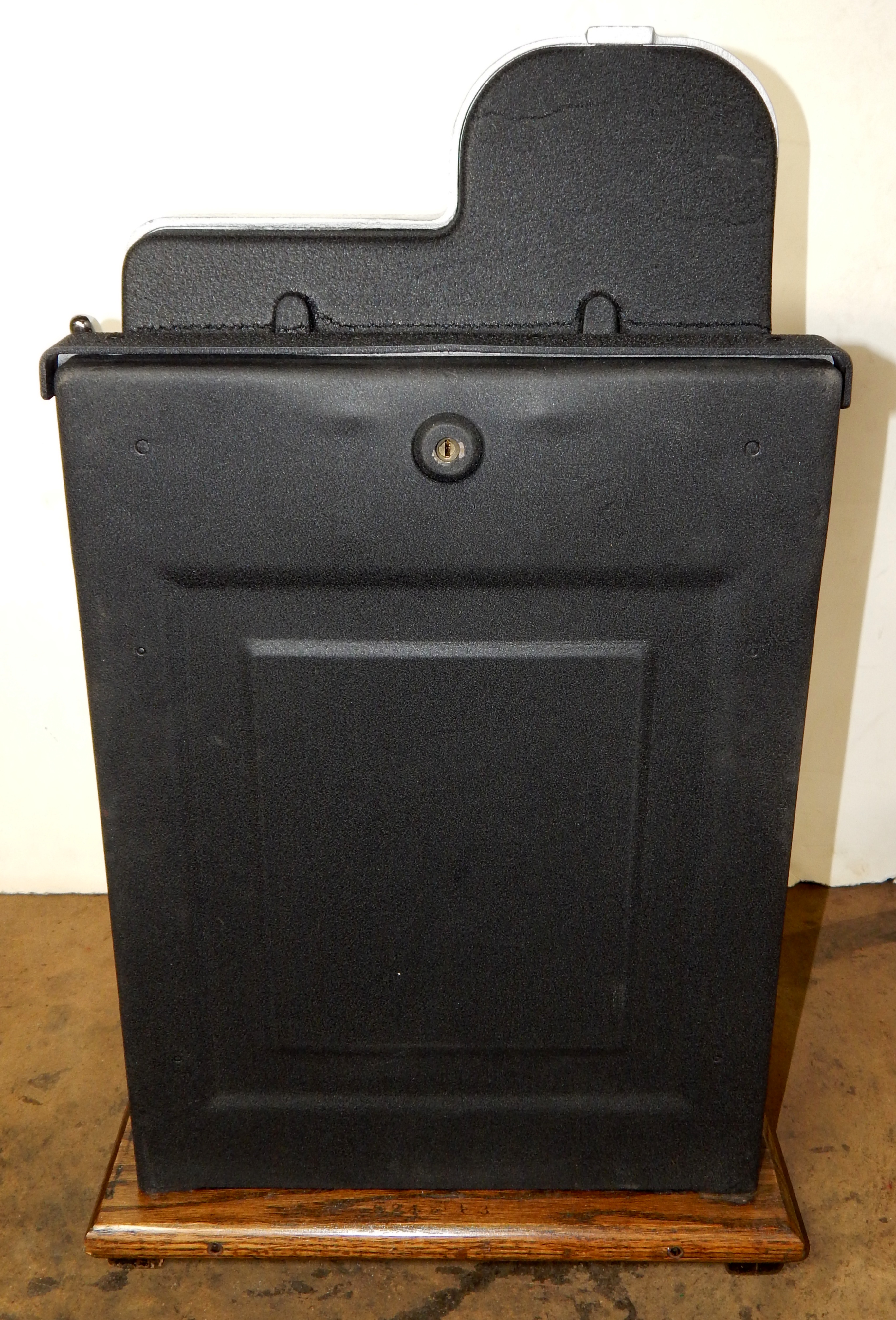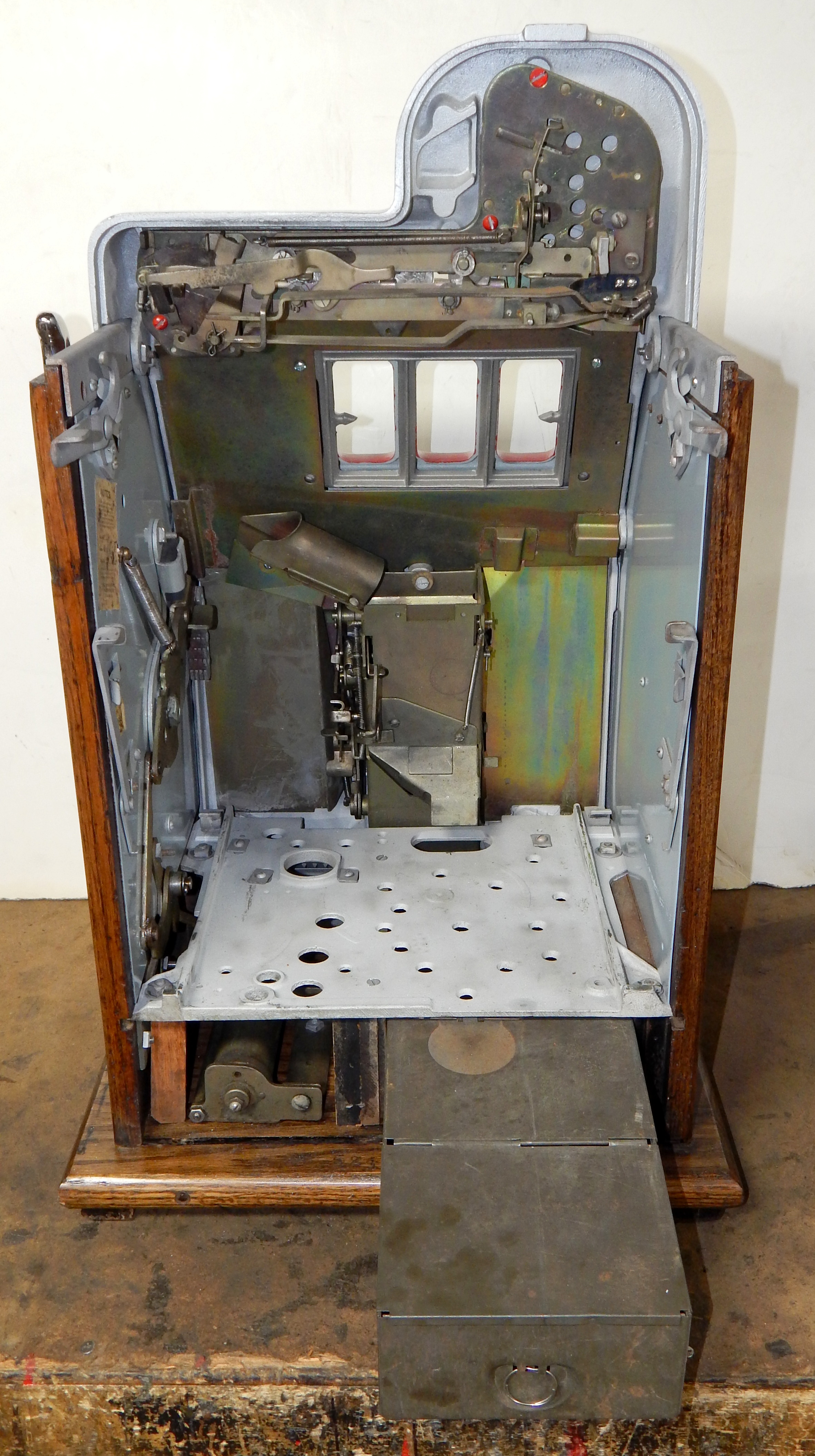 Mills 1945 Black Cherry, 25 cent. Hammer tone Silver with red trim. This is a very nice machine restored back to the original colors. The only thing that is not original on this machine is the paint and decal. Mint original condition award card, Original reel strips, Jackpot with reserve, original back door and lock with one key, Original cash box. Still has the original paper work on the inside of the cabinet. Plays very easy. Great rec-room machine.